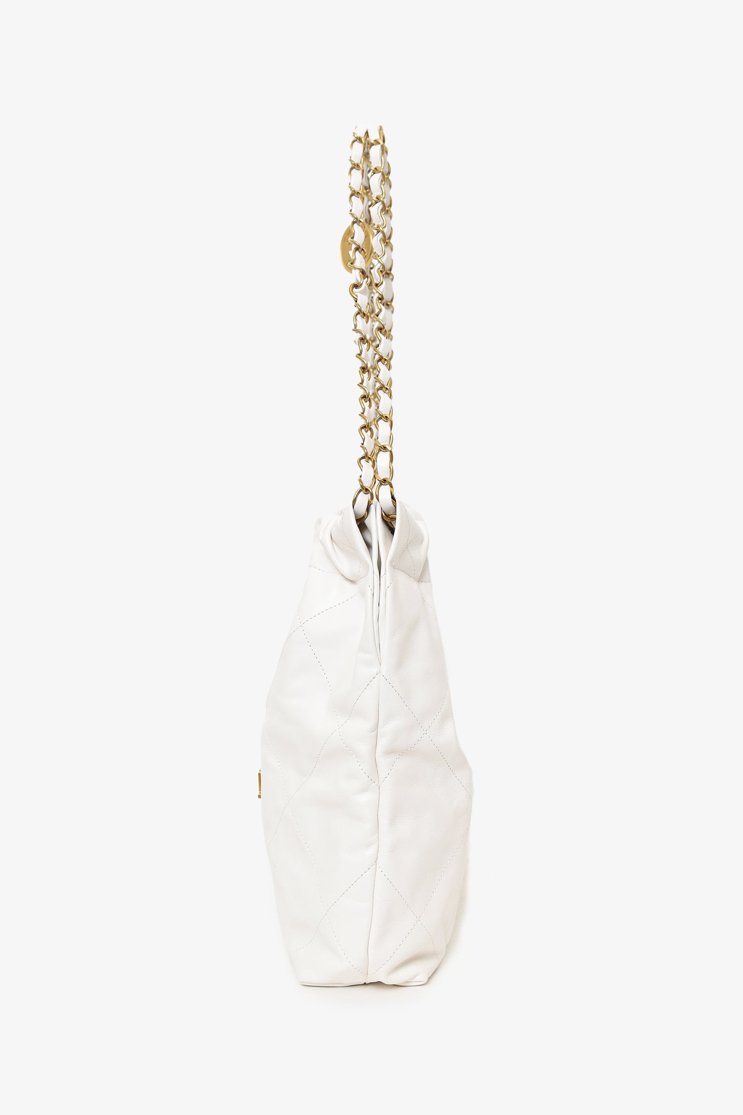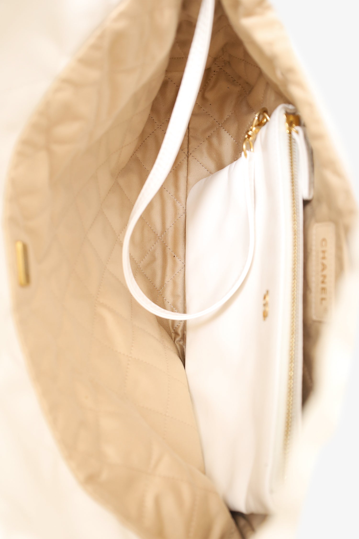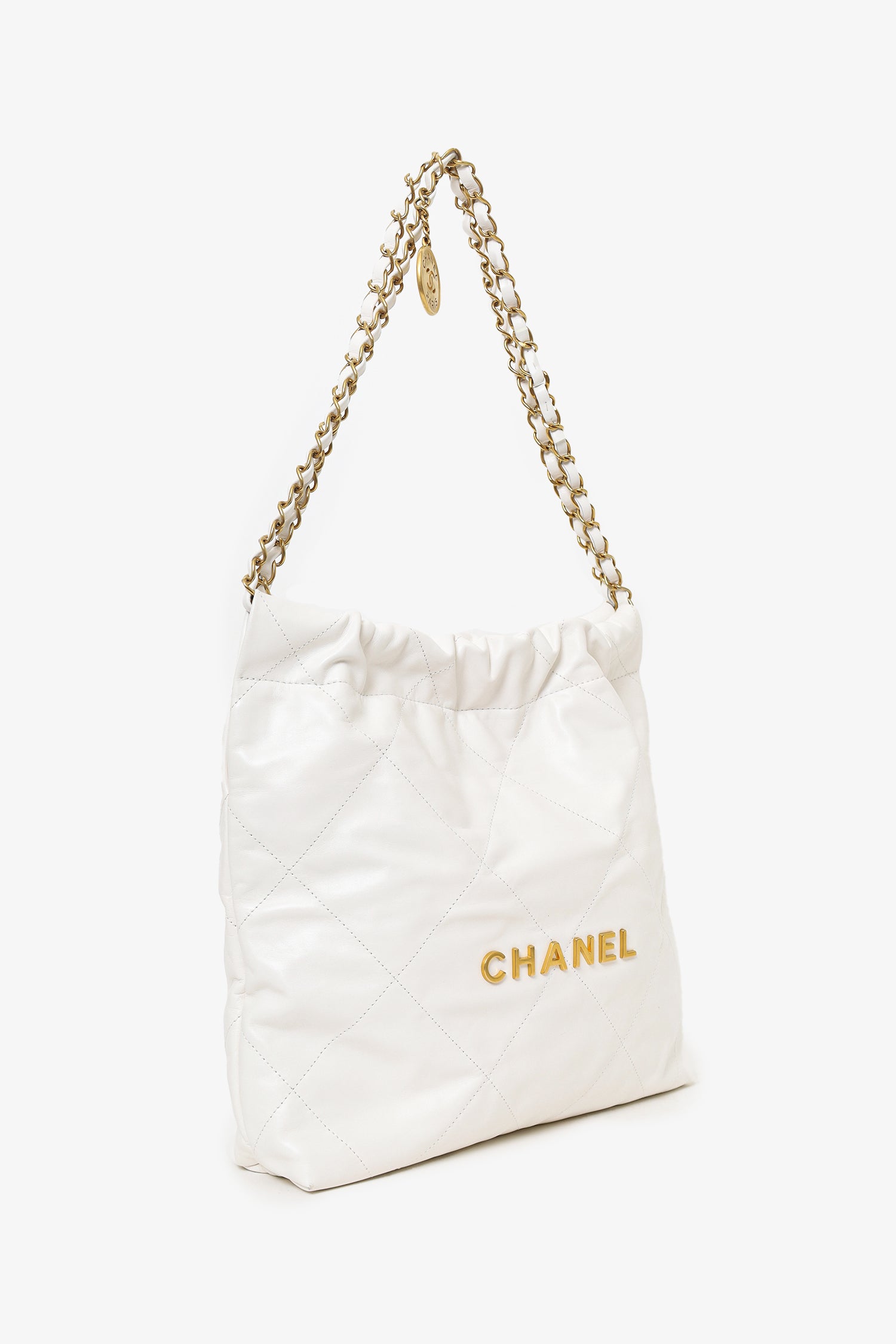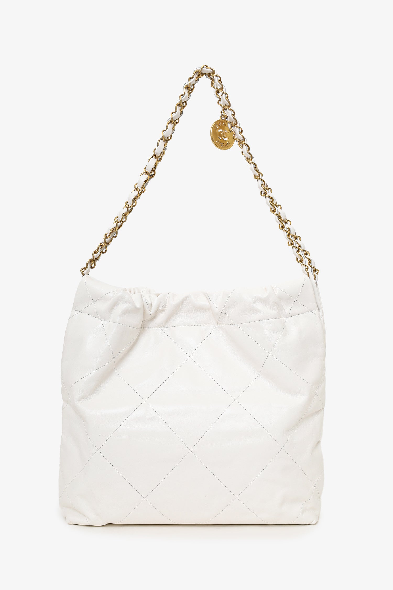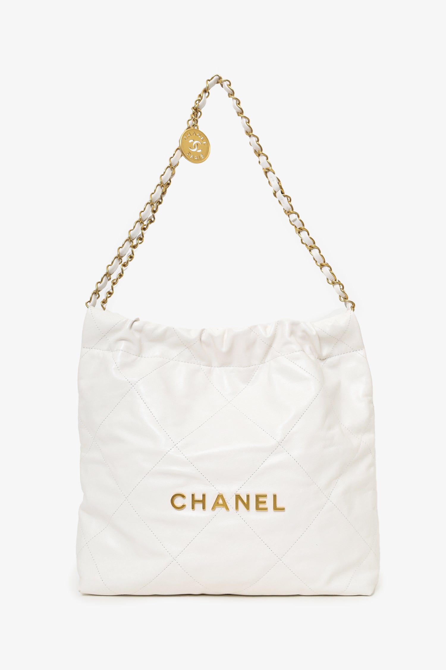 Pre-Loved Chanel™ White Leather Small Chanel 22 Shoulder Bag. Top interior snap-button closure. Twin chainlink shoulder straps. Lined interior. Single interior zip pocket. Removable interior zip pouch. Gold-tone hardware. Tonal stitching.