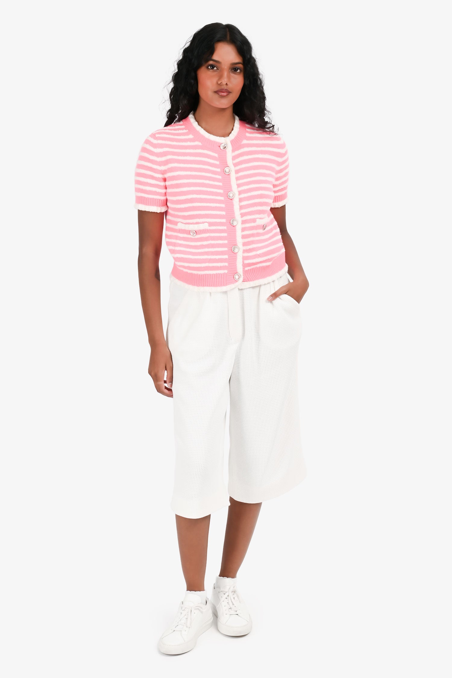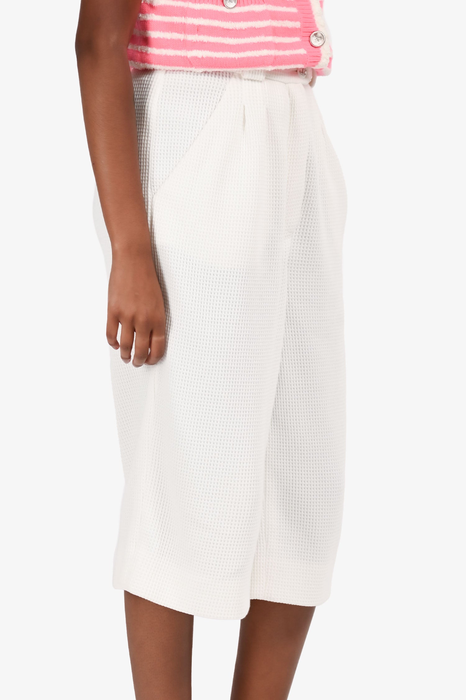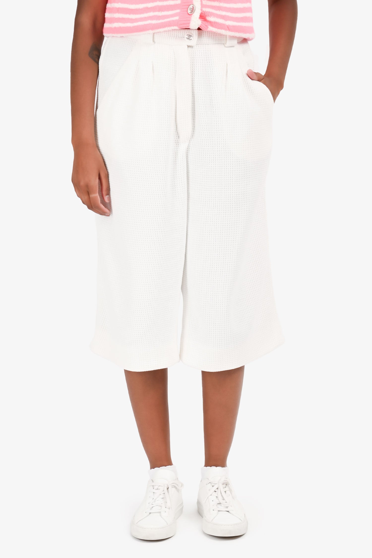 Refresh availabilityPre Loved Chanel™ White Waffle Print Long Pleated Shorts. Front zip and button closure. Waist belt loops. Tonal stitching.