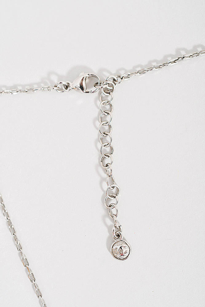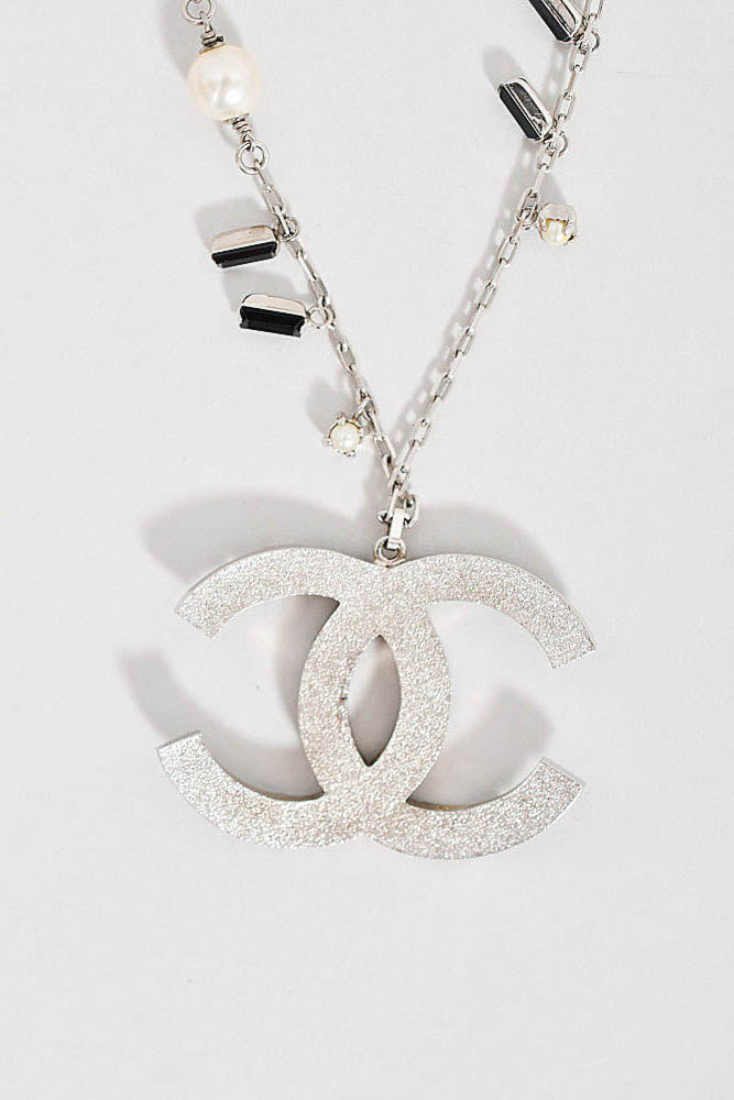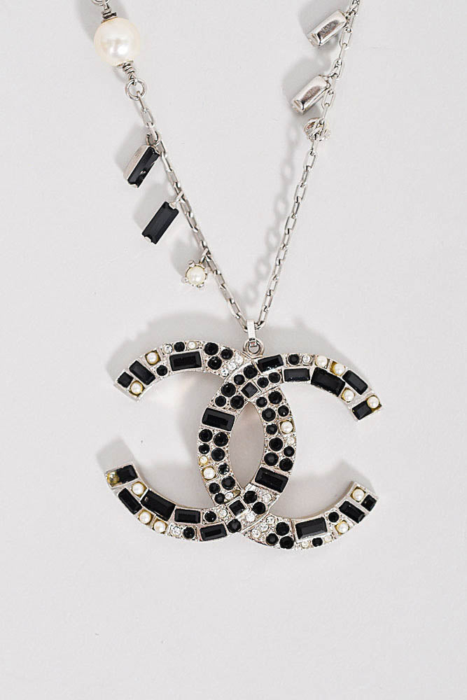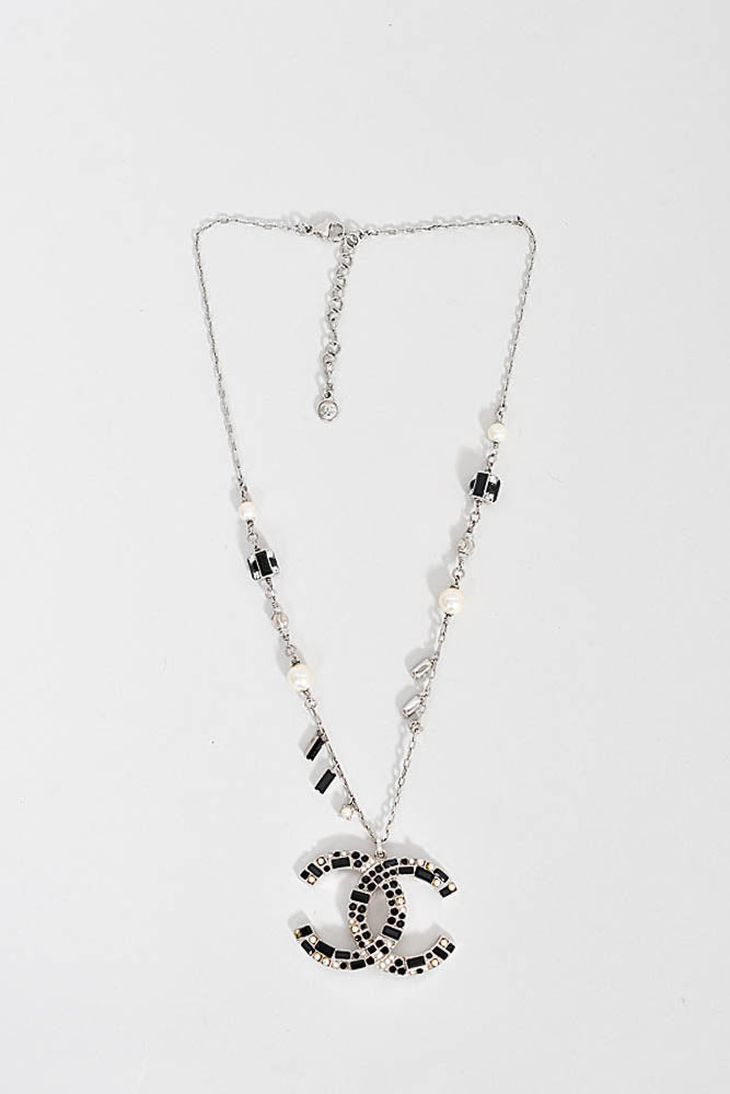 Refresh availabilityPre-loved Chanel™ Silver/Black Crystal "CC" Necklace with Pearl Detail. Adjustable length with lobster clasp closure.