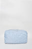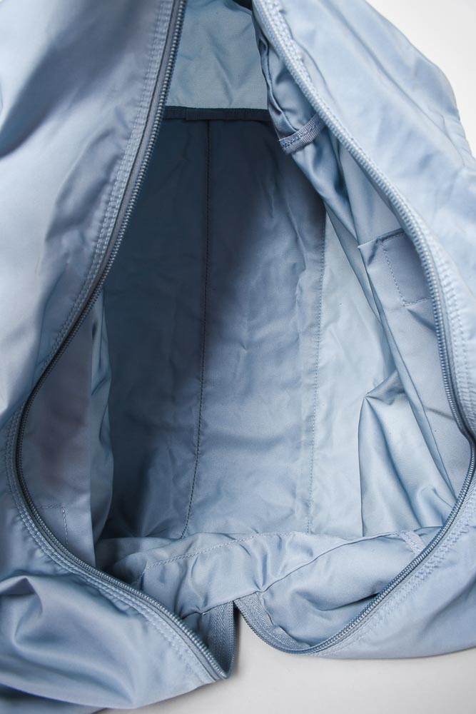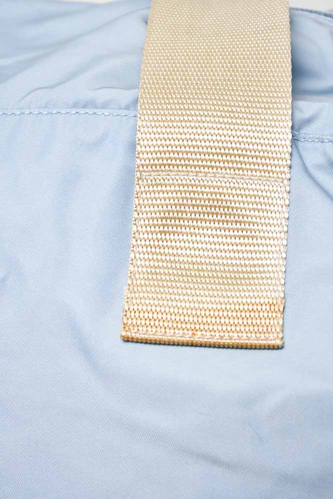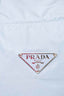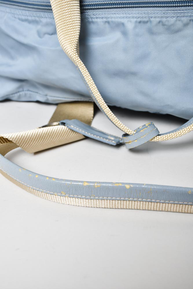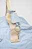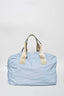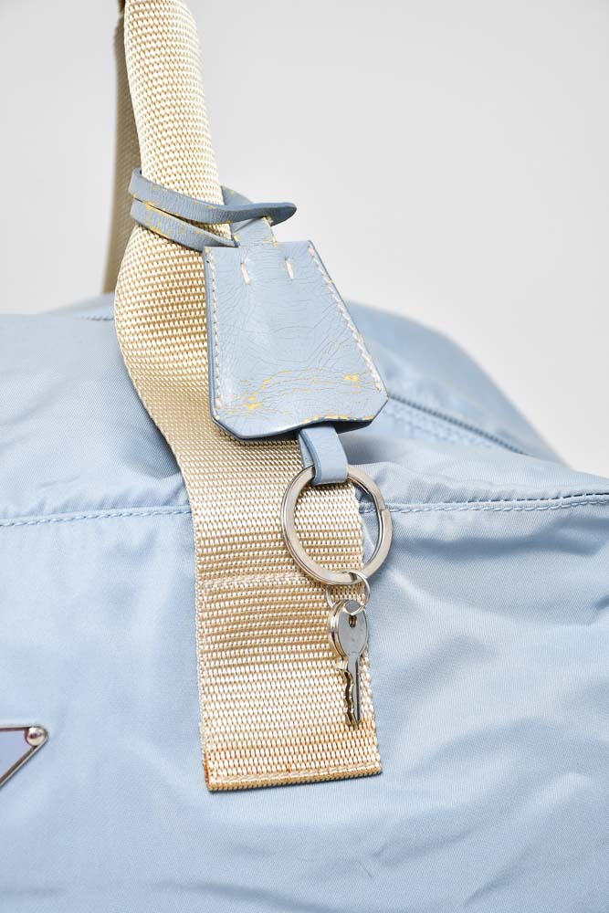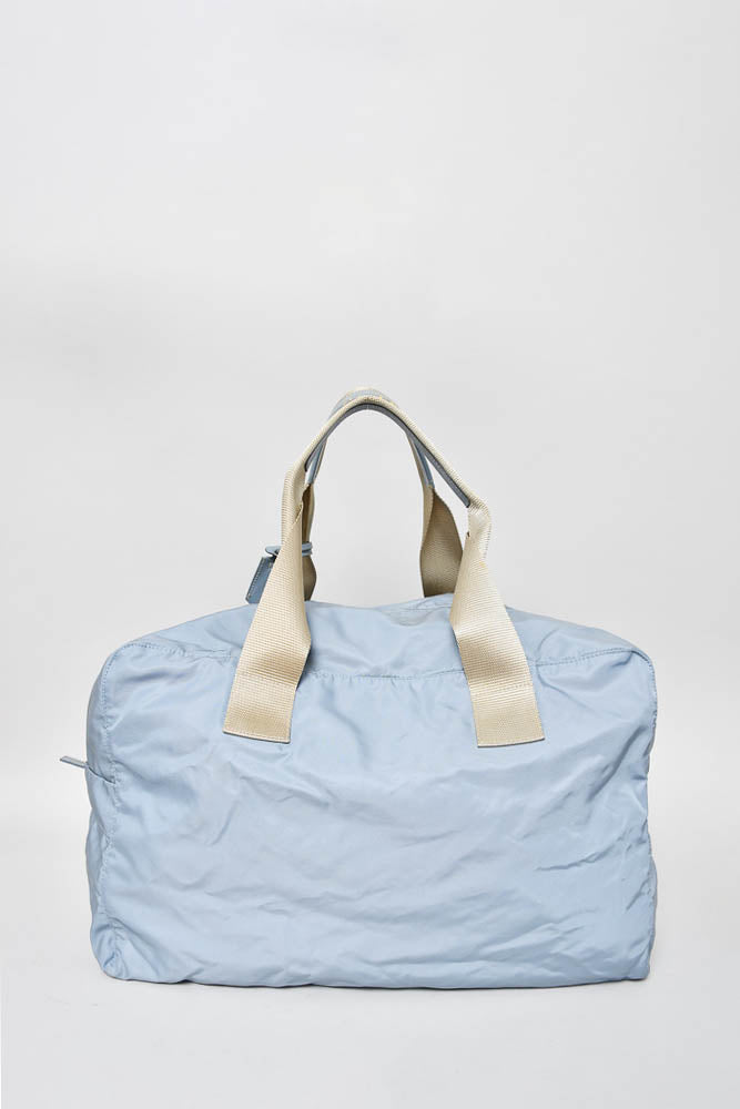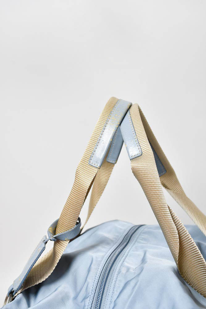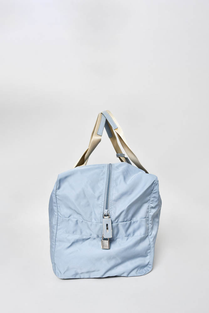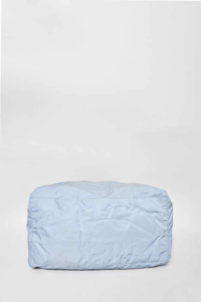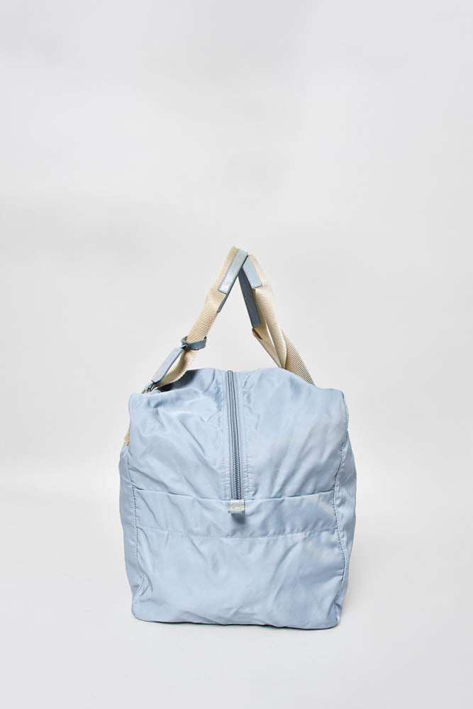 Prada Blue Nylon Boston Bag. Twin top handles with blue-wrapped detail. Comes with keys and lock. Top zip closure. Open interior. Silver-tone hardware. Tonal stitching.