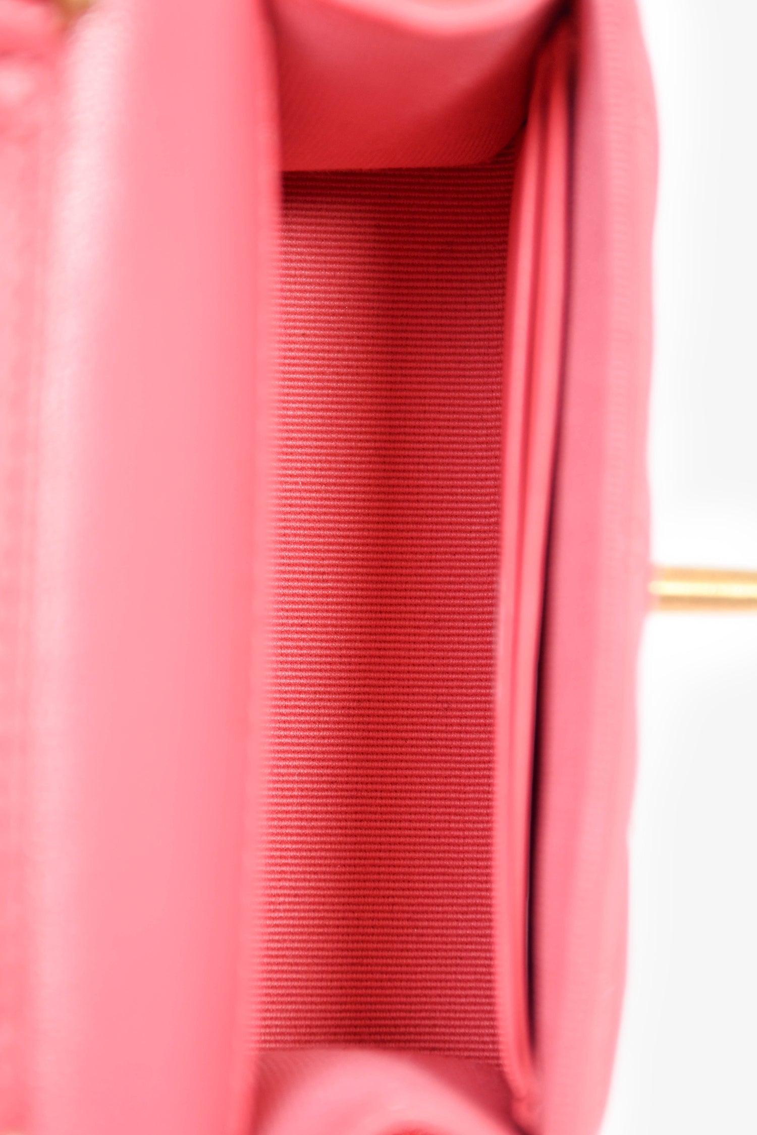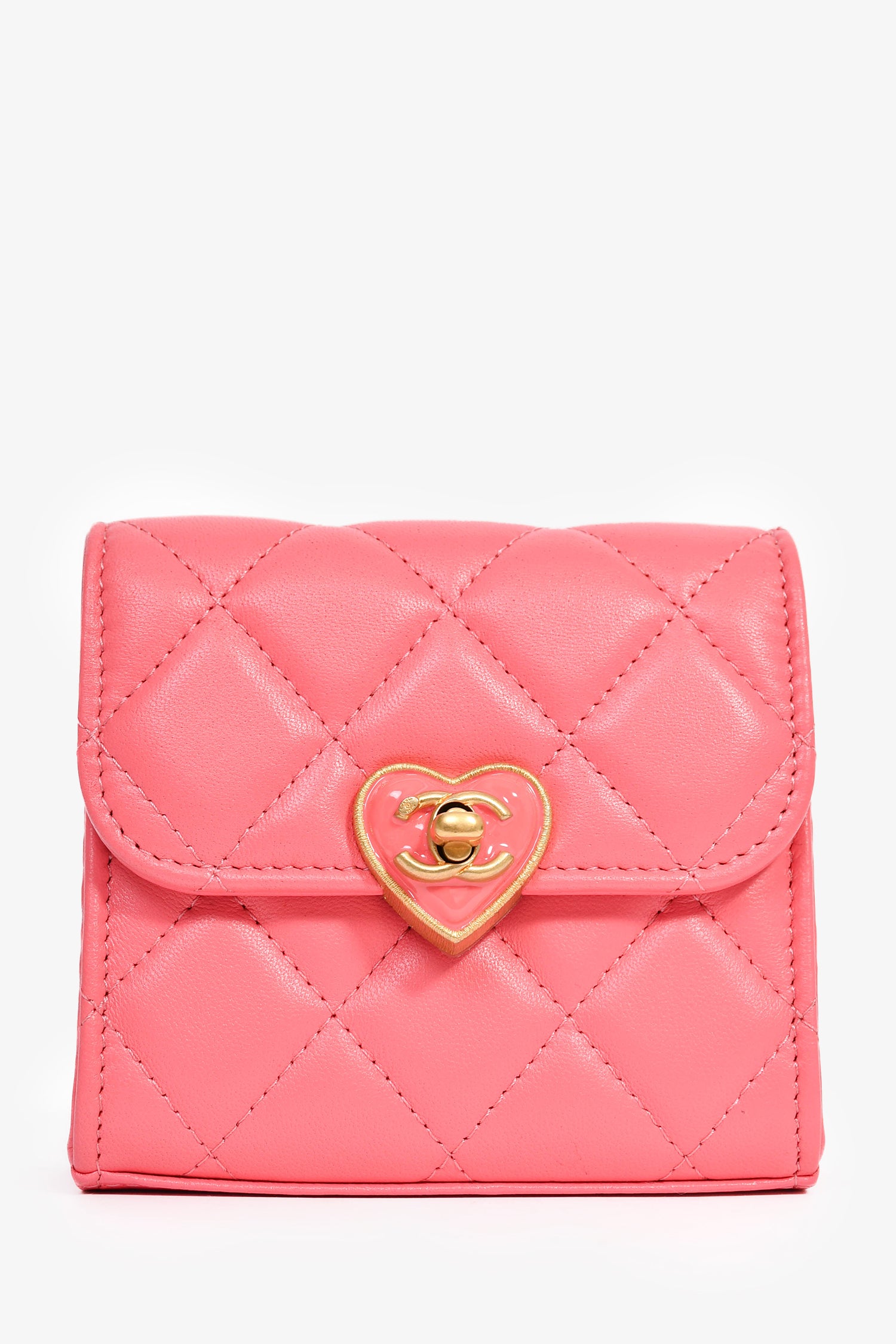 Refresh availabilityPre-Loved 2022+ Chanel™ Pink Mini Coco Love Flap Bag. Front fold-over flap with turn-lock closure. Chainlink crossbody strap. Tonal textile interior lining. 4 interior card slots. Gold-tone hardware. Tonal stitching.