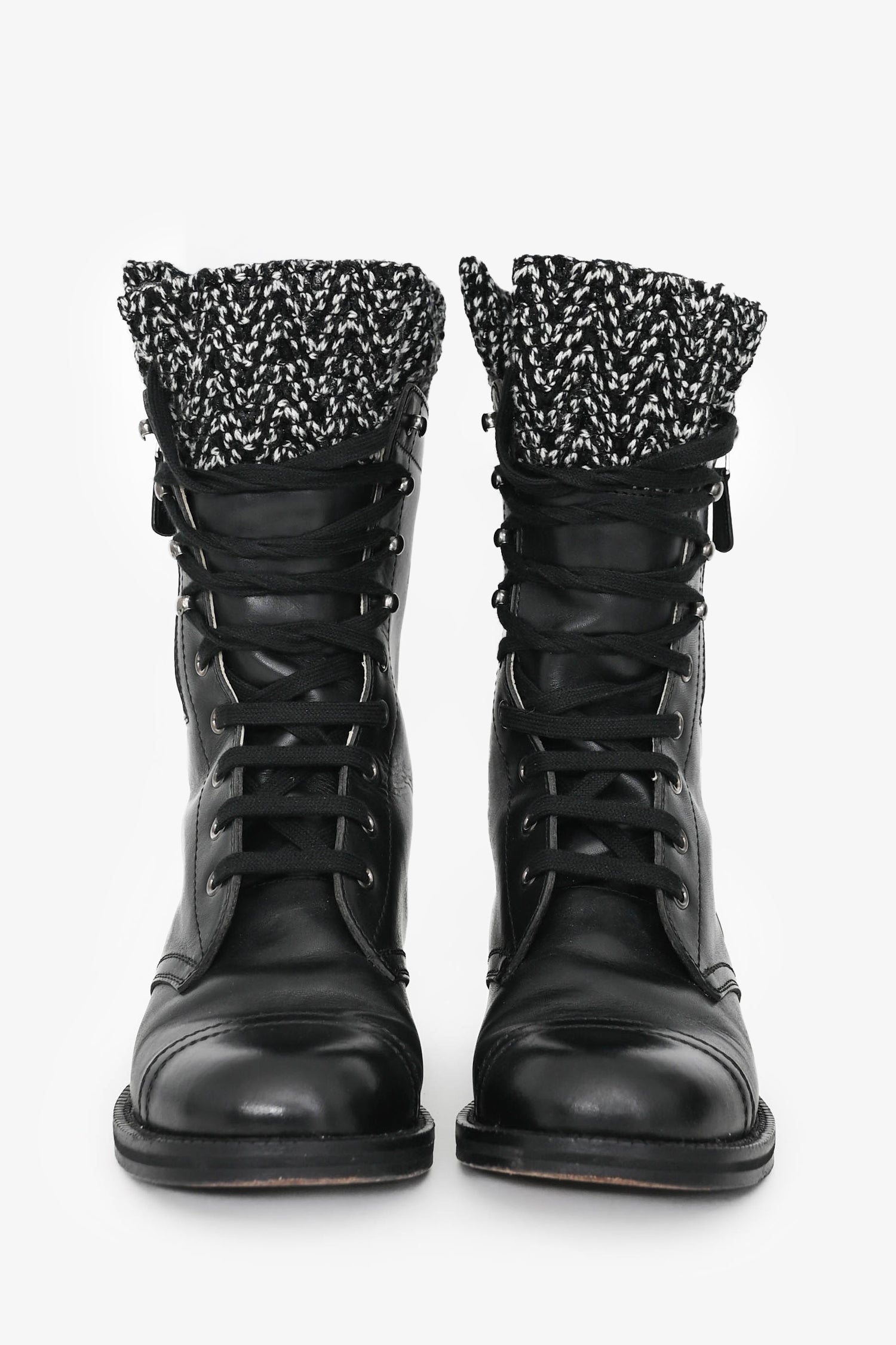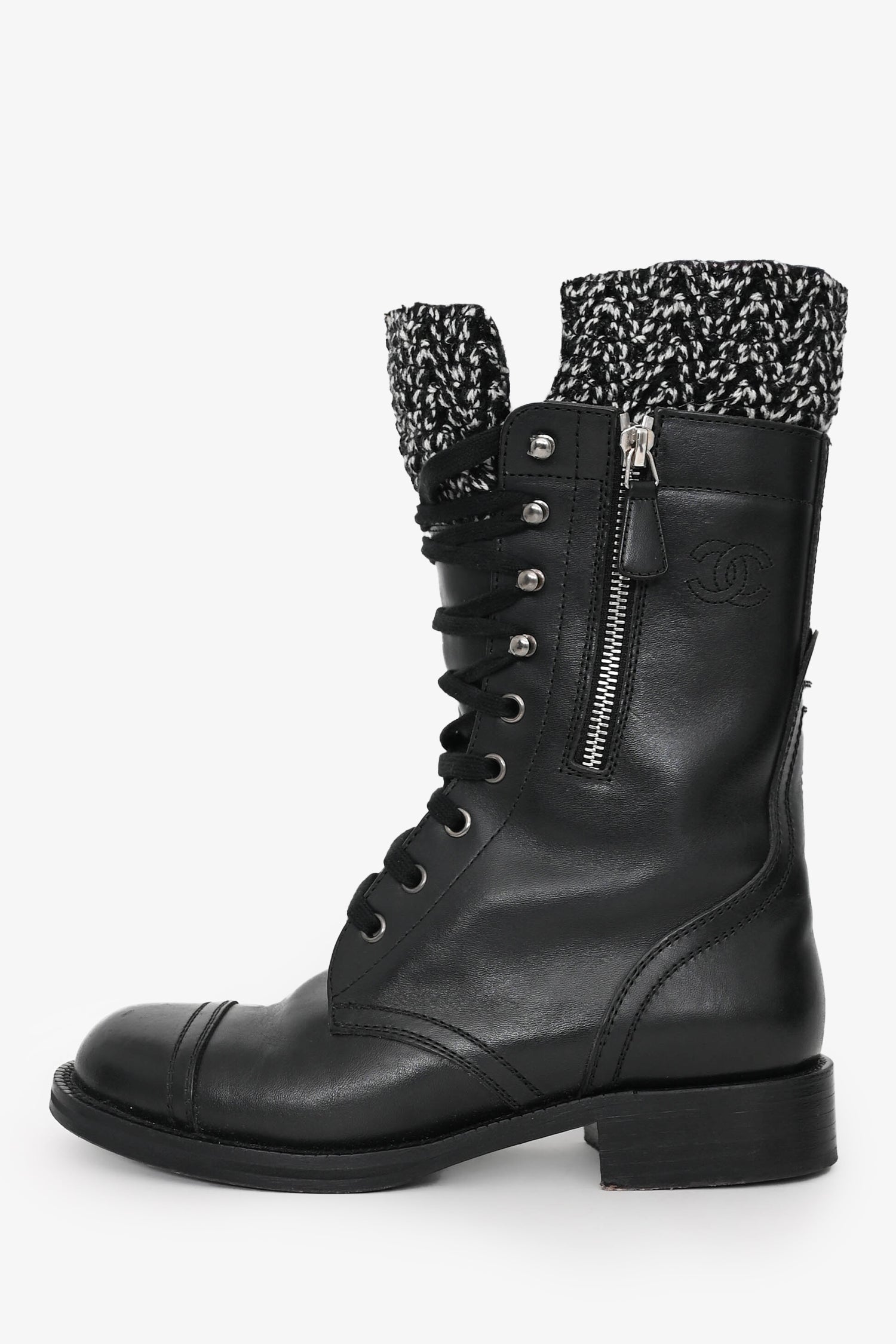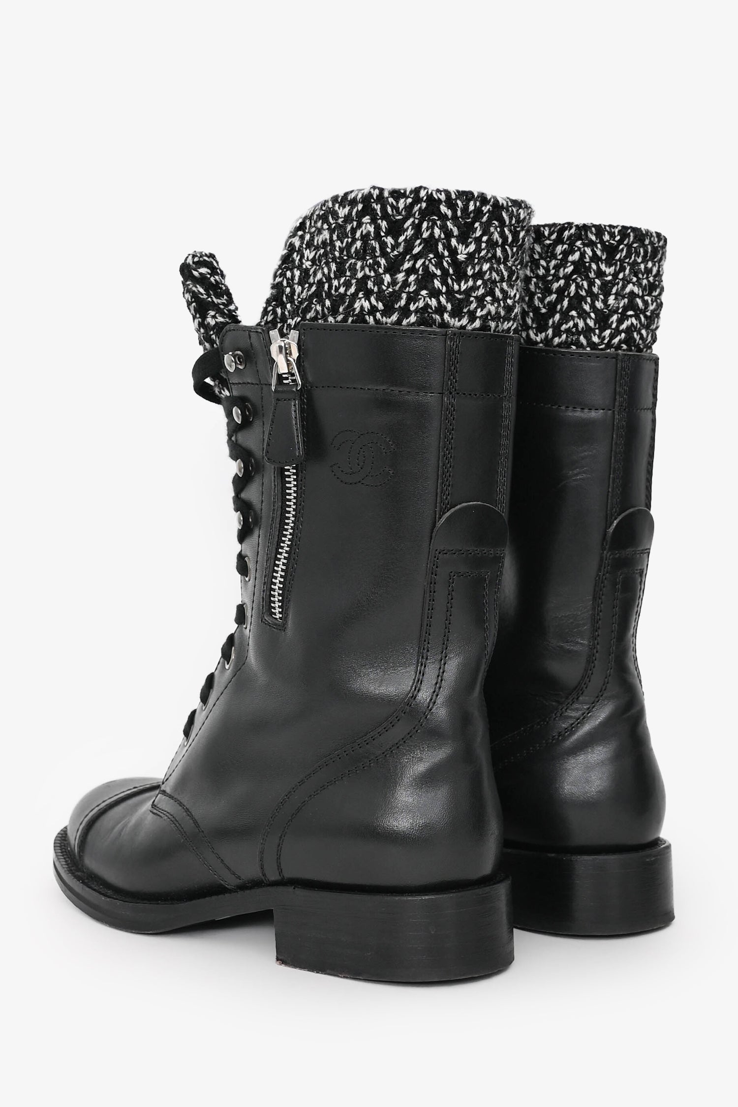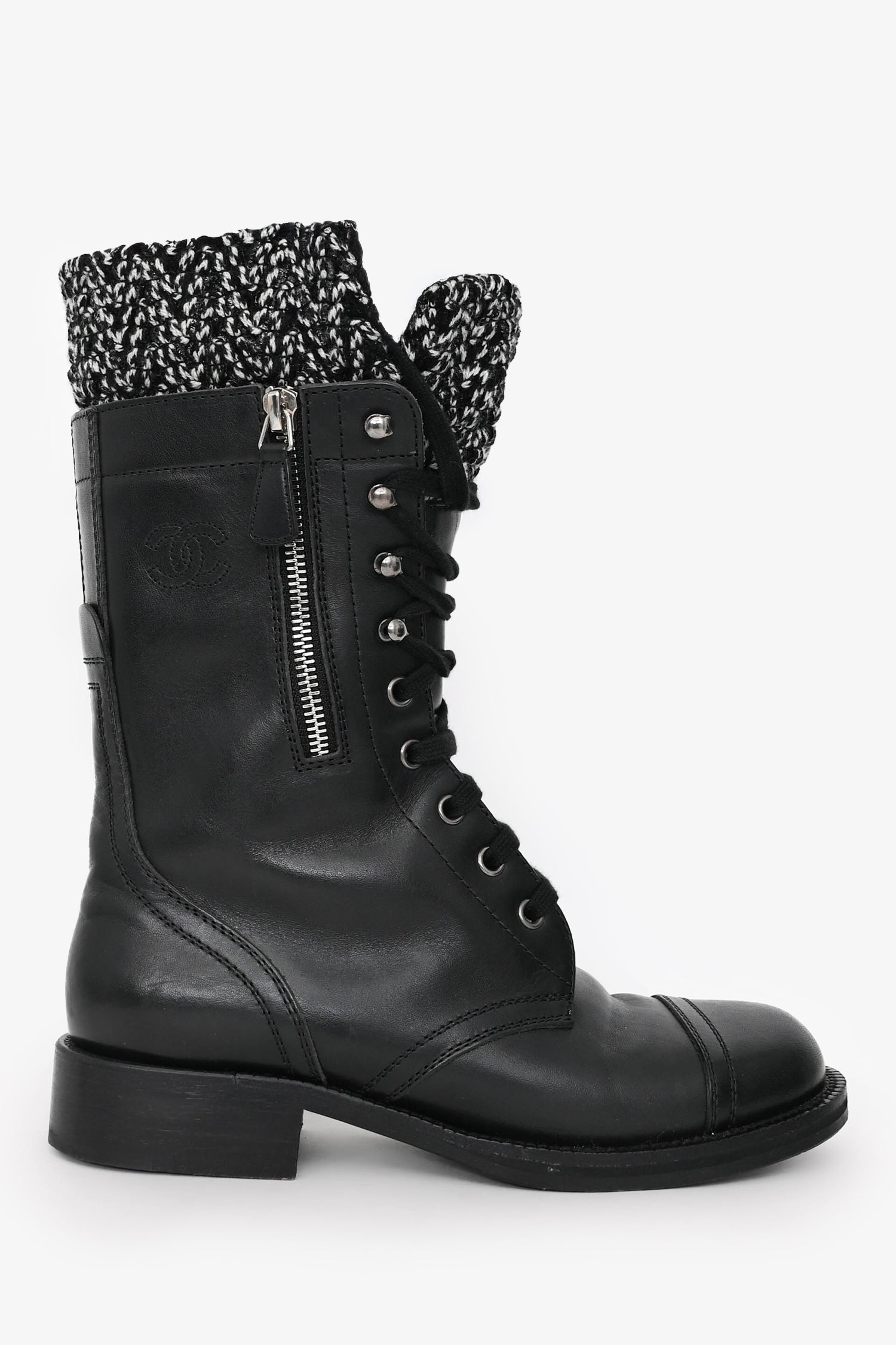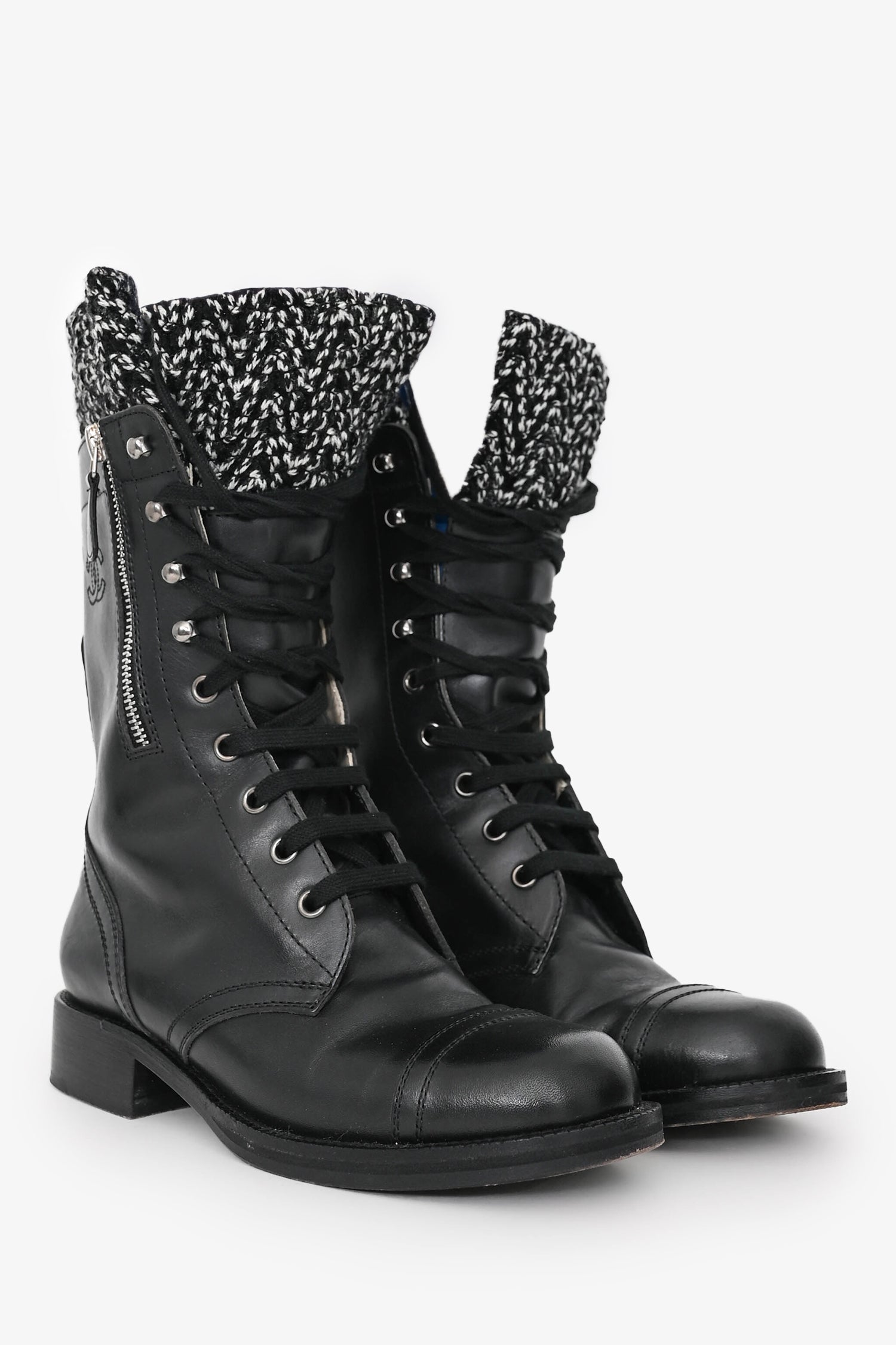 Pre-Loved Chanel™ 2011 Black Leather CC Knit Cuff Combat Boots. Round toe. Lace-up detail. Side zipper detail. Leather insole and interior. Wooden heel and sole. Silver-tone detail. Tonal stitching.
