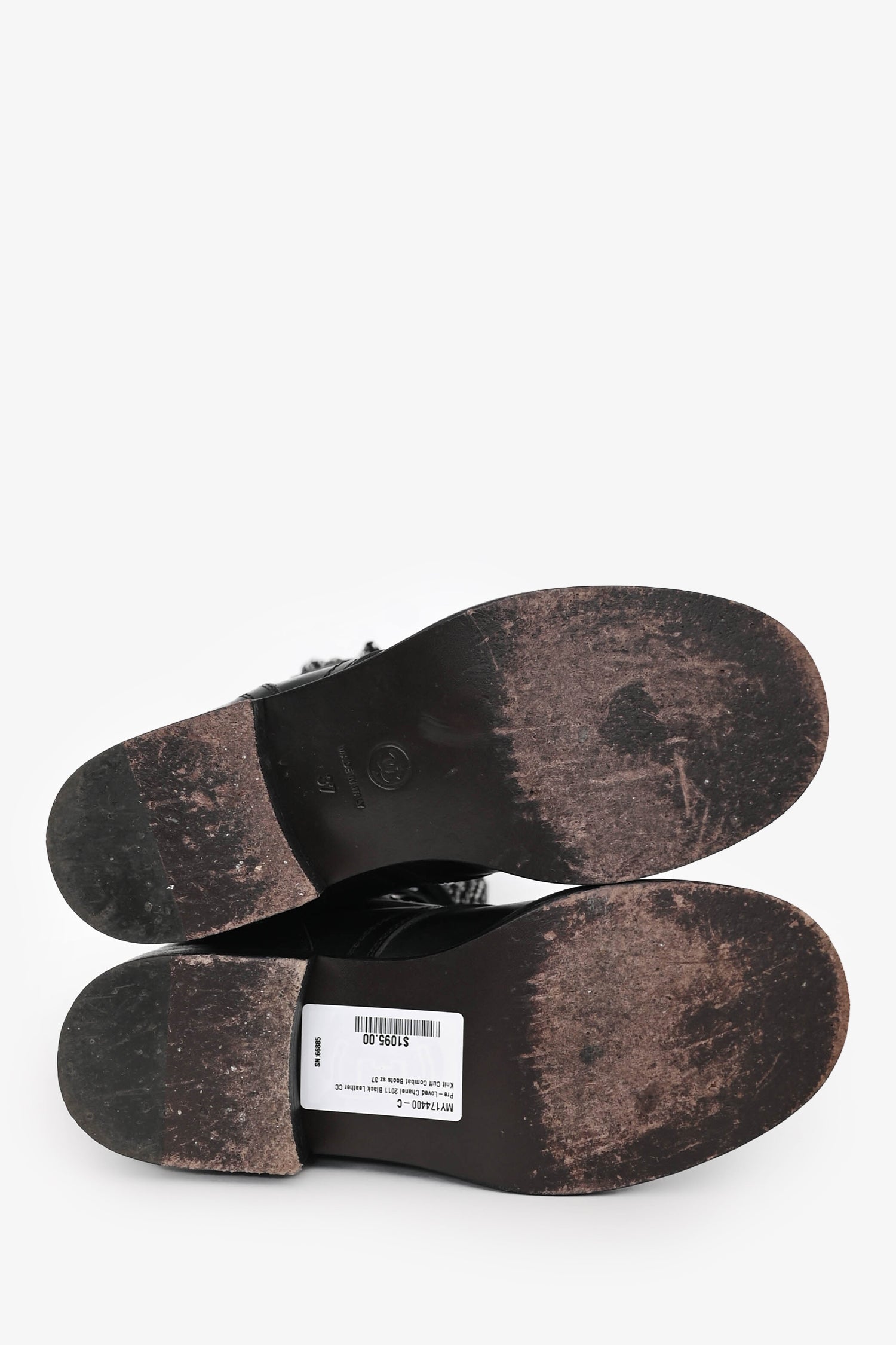 Pre-Loved Chanel™ 2011 Black Leather CC Knit Cuff Combat Boots Size 37