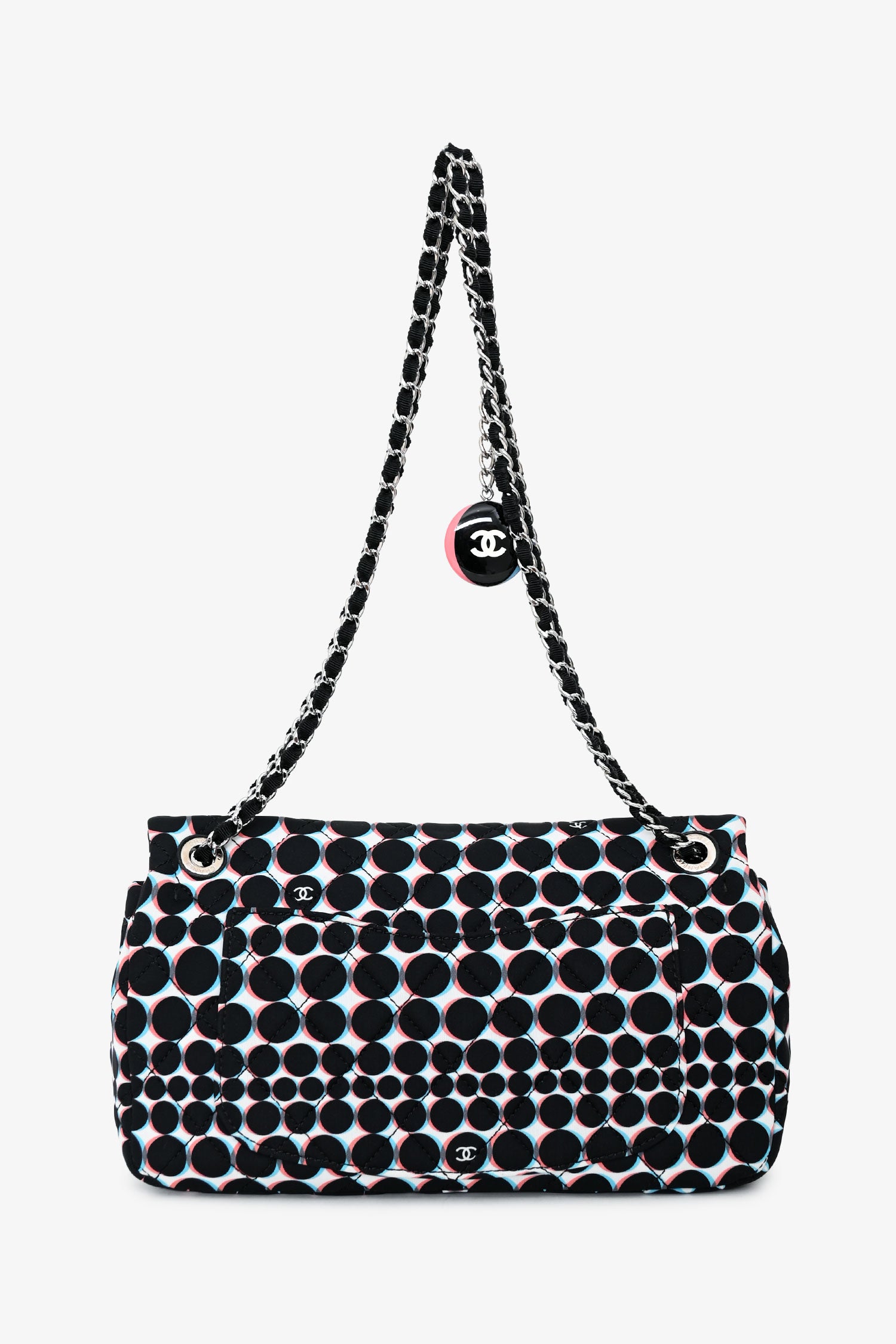 Pre-Loved Chanel™ 2014 Black/White Nylon Polka Dot Printed Medium Classic Single Flap Bag. Front flap with signature CC turn-lock closure. Fabric-woven chain and nylon shoulder strap with charm detailing. 1 exterior rear slip pocket; 1 interior zip pocket. Fabric lining. Silver-tone hardware. Tonal stitching.