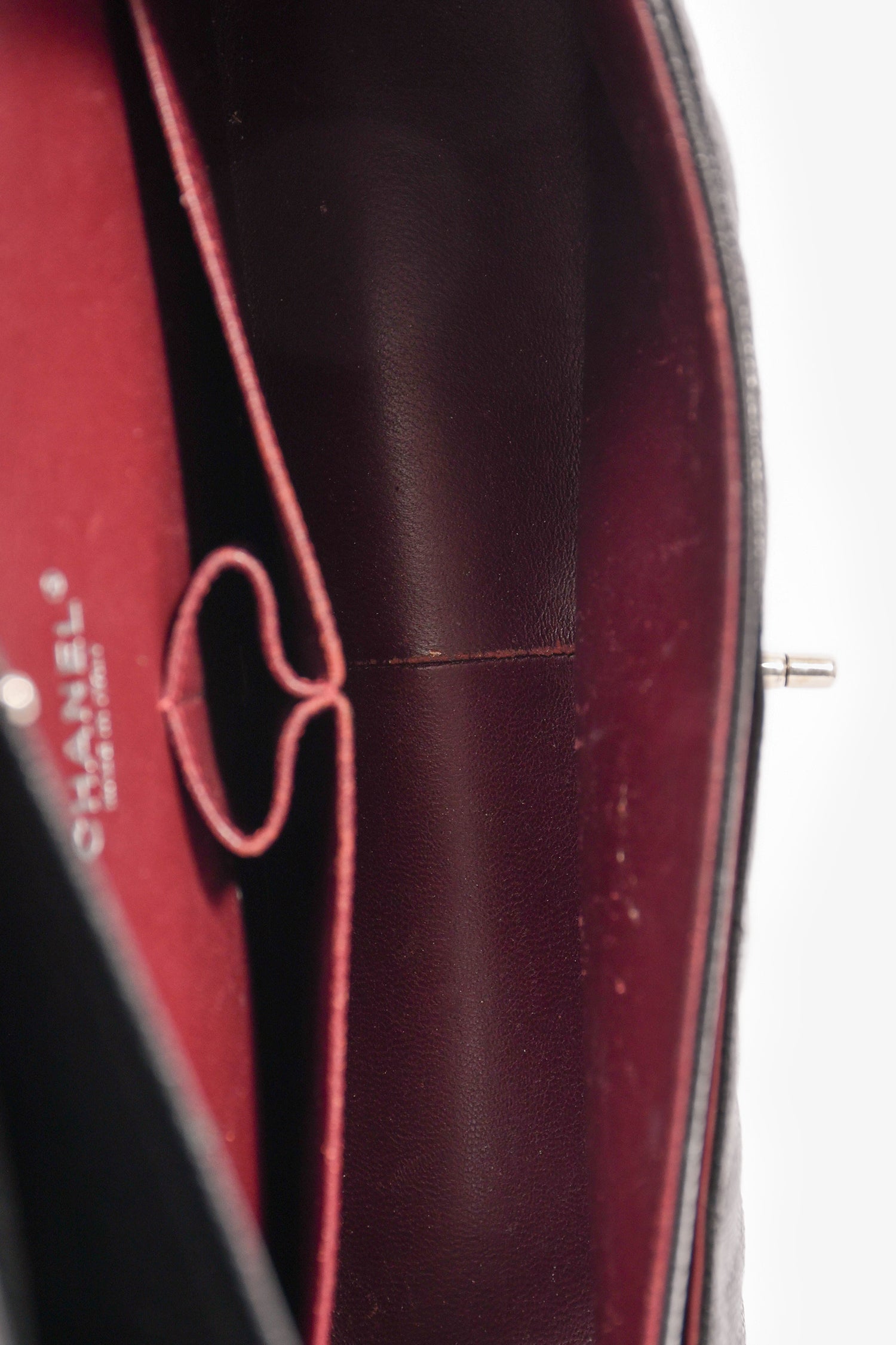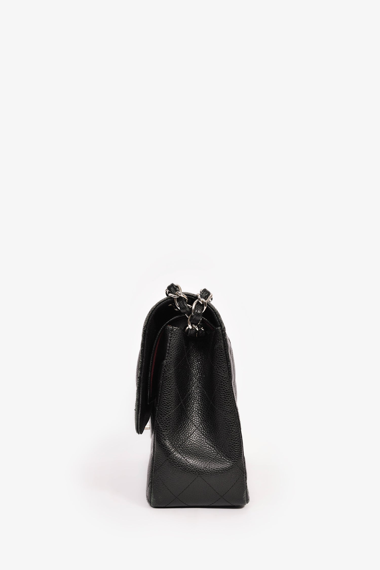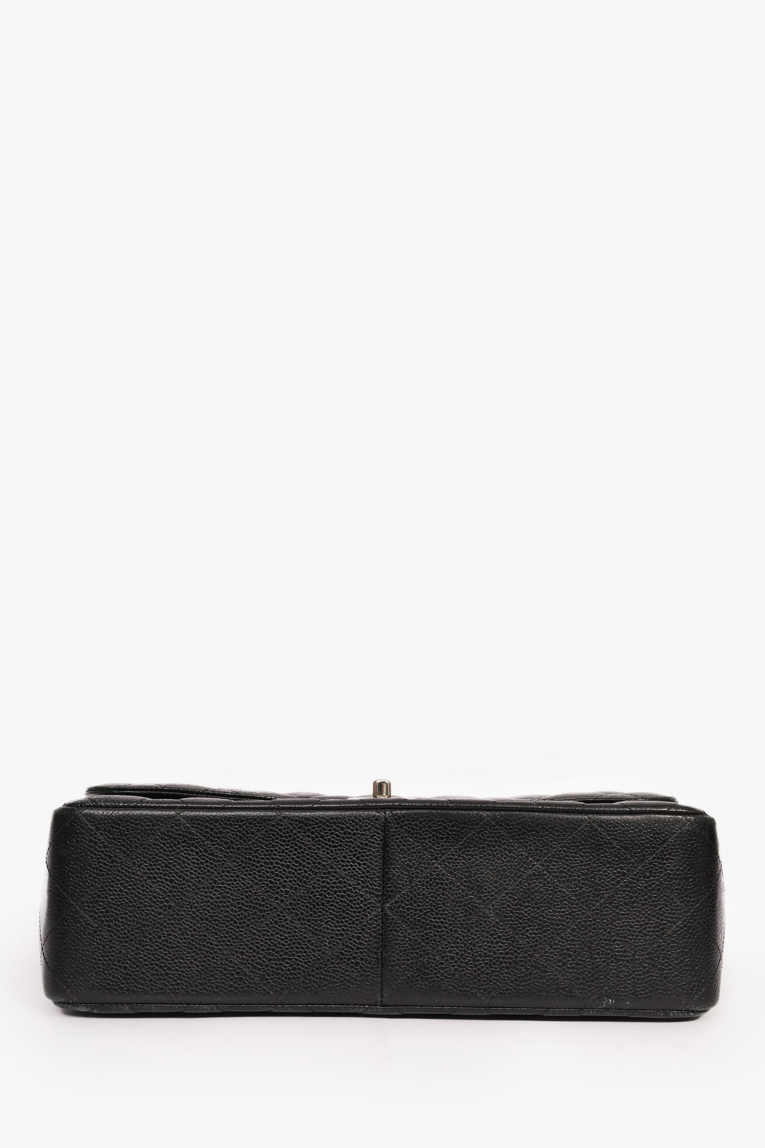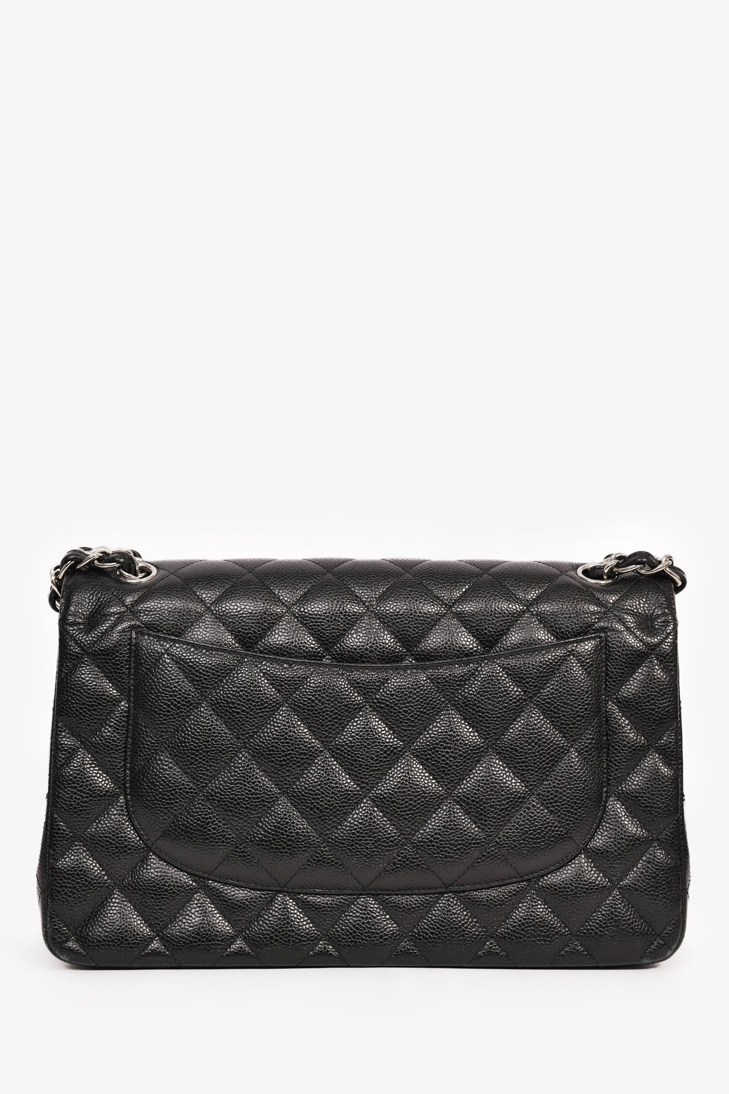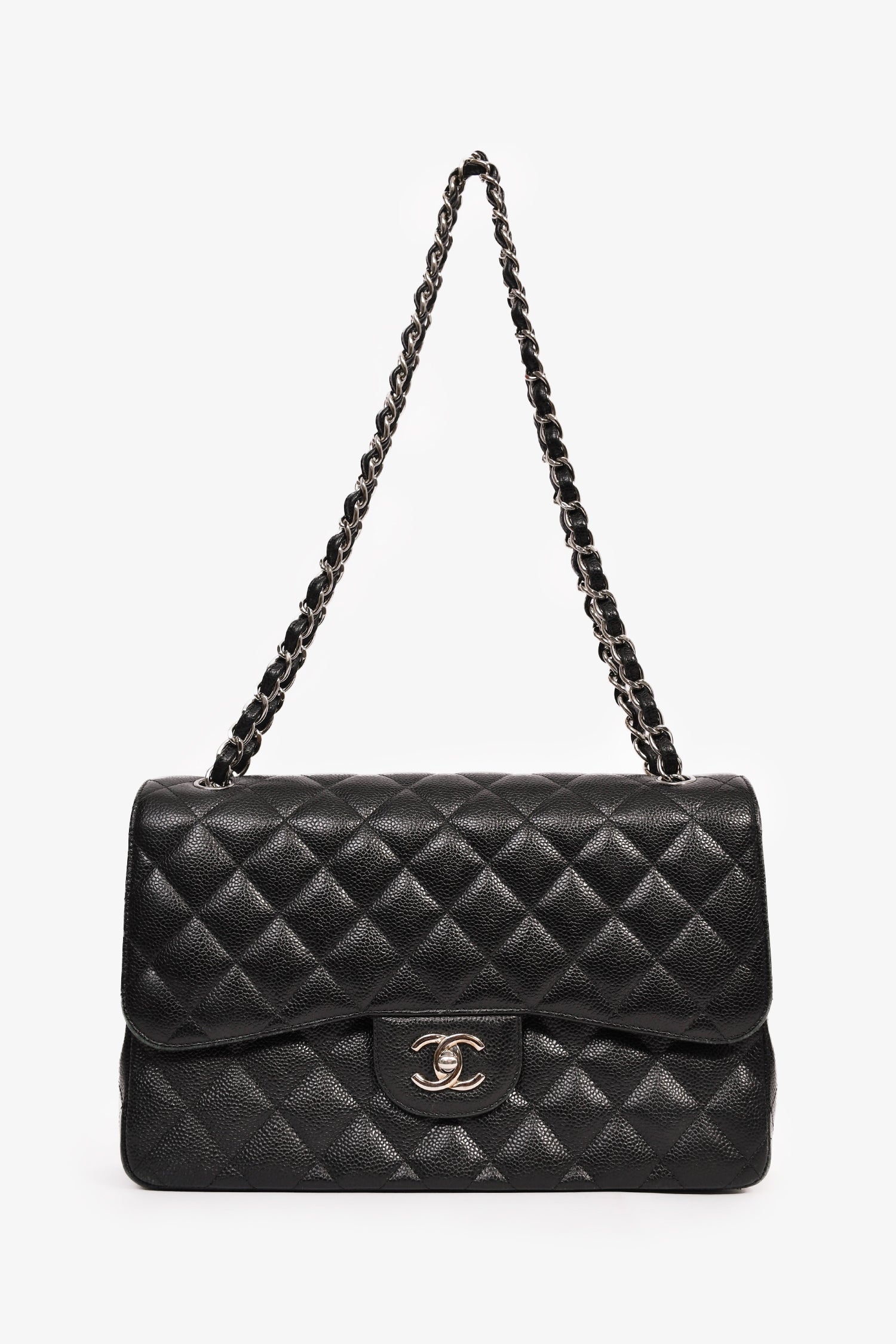Refresh availabilityPre-Loved Chanel™ 2016/17 Black Caviar Jumbo Double Flap. 2 fold-over flaps, 1 exterior and 1 interior. Silver-tone hardware. Turn-lock closure. 2 interior compartments and 2 pockets. 1 exterior slip compartment. Chain-link and leather shoulder strap. Tonal stitching.