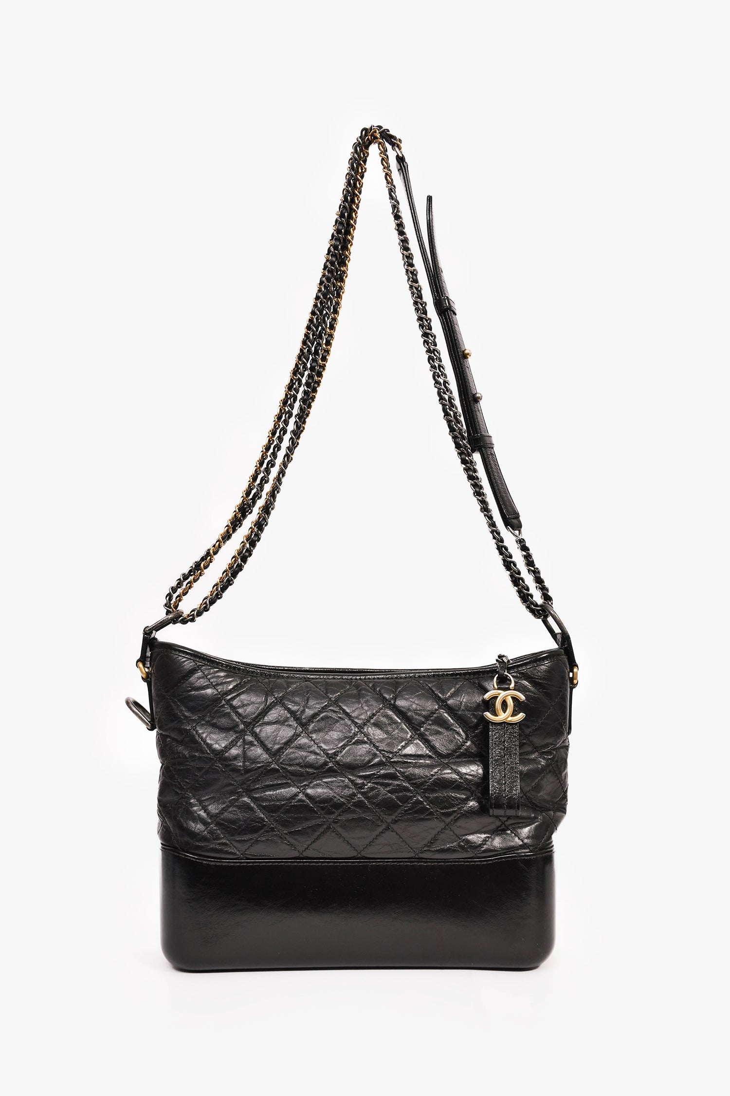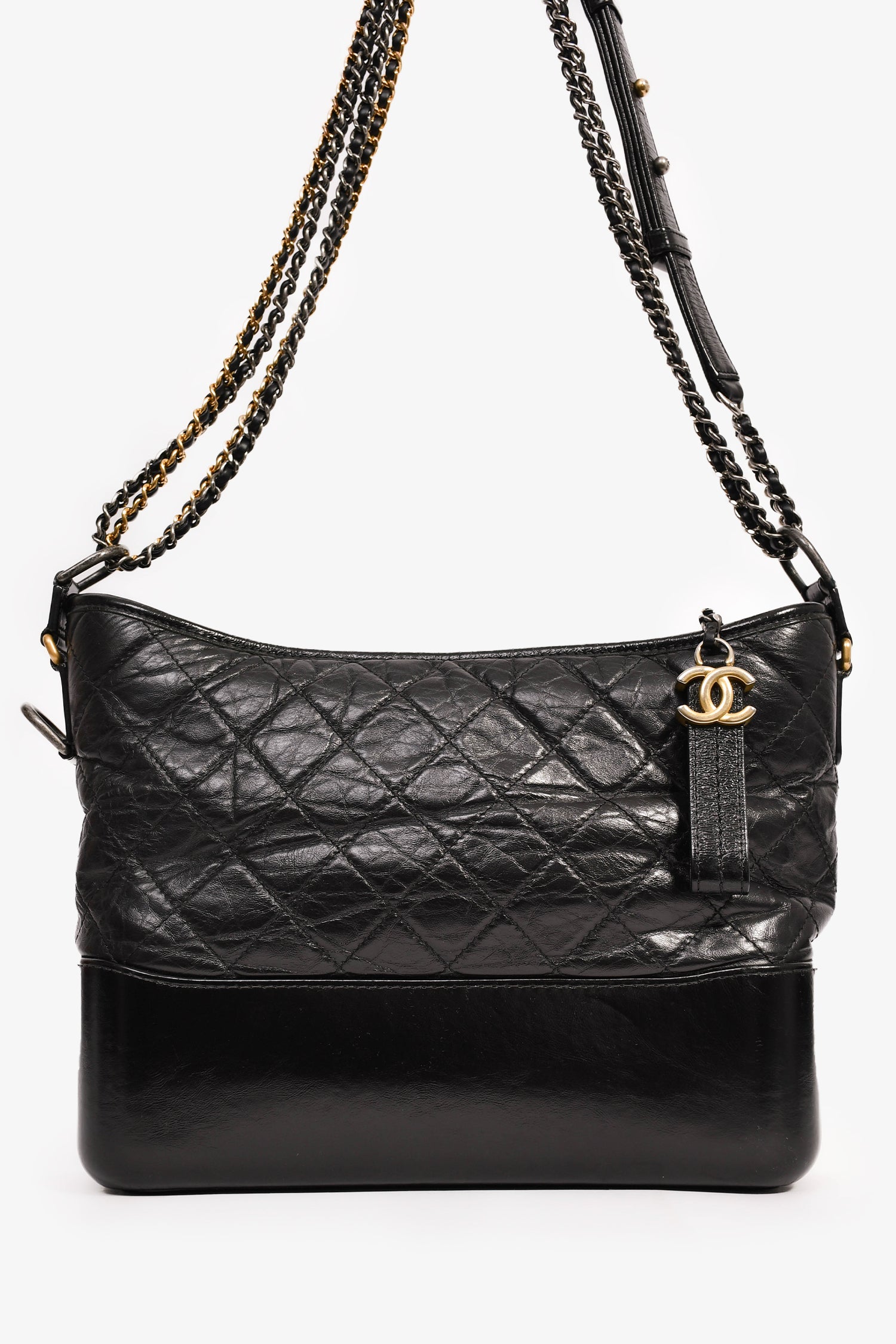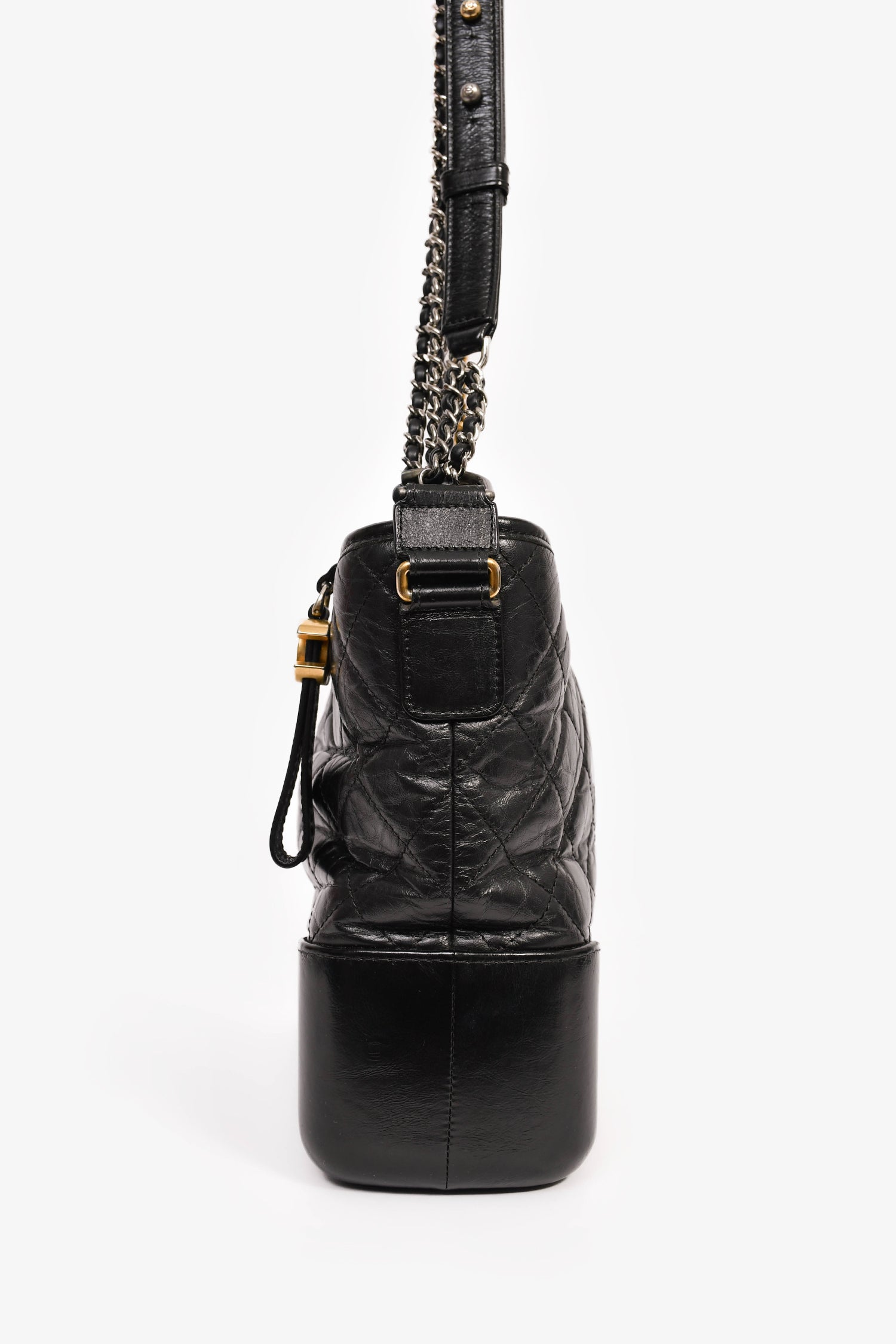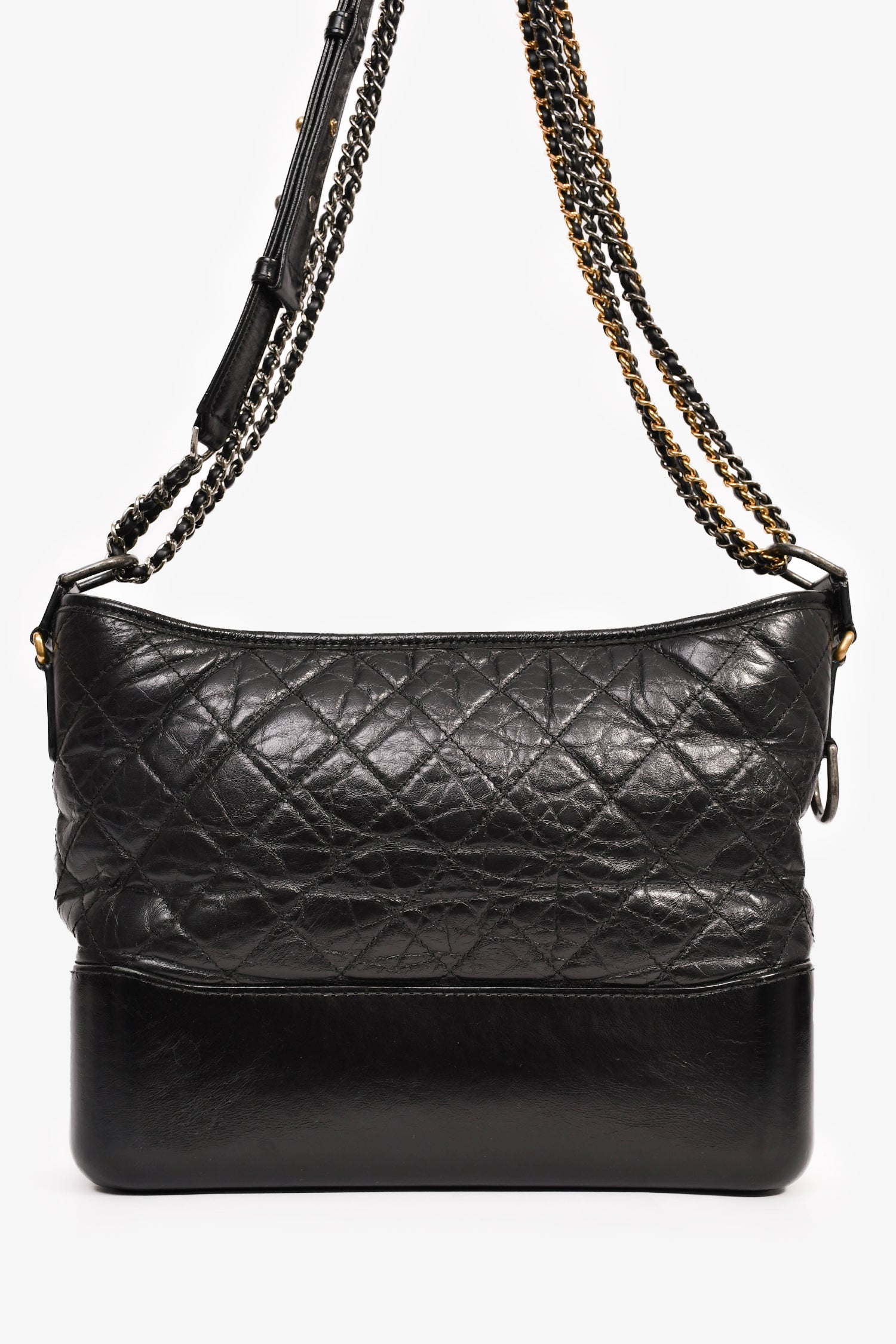 Pre-Loved Chanel™ 2017/18 Black Aged Calfskin Medium Gabrielle Hobo. Top zip closure. Chainlink and leather shoulder straps. Lined interior. 2 interior zip pockets. Gold and silver-tone hardware. Tonal stitching.