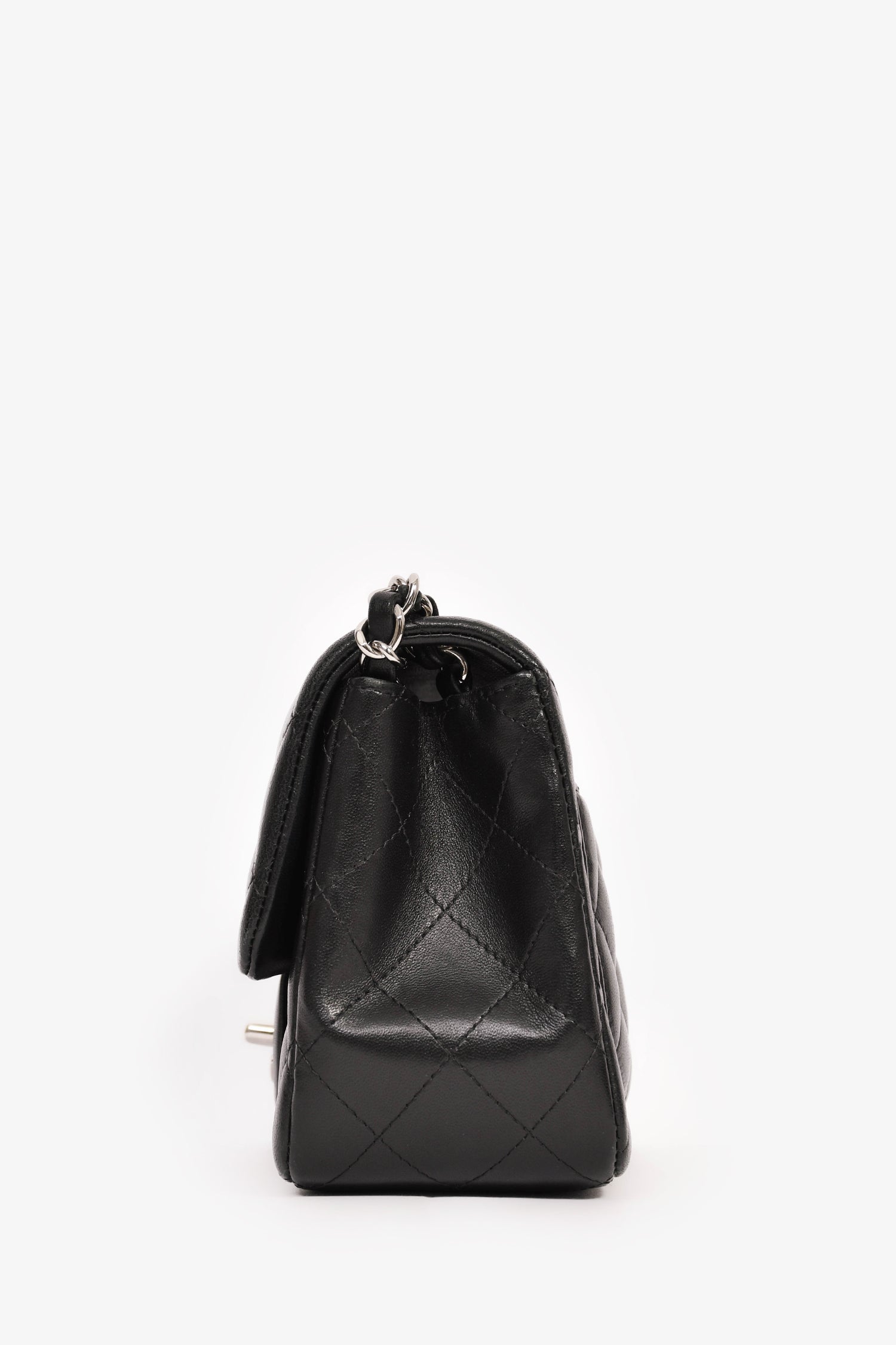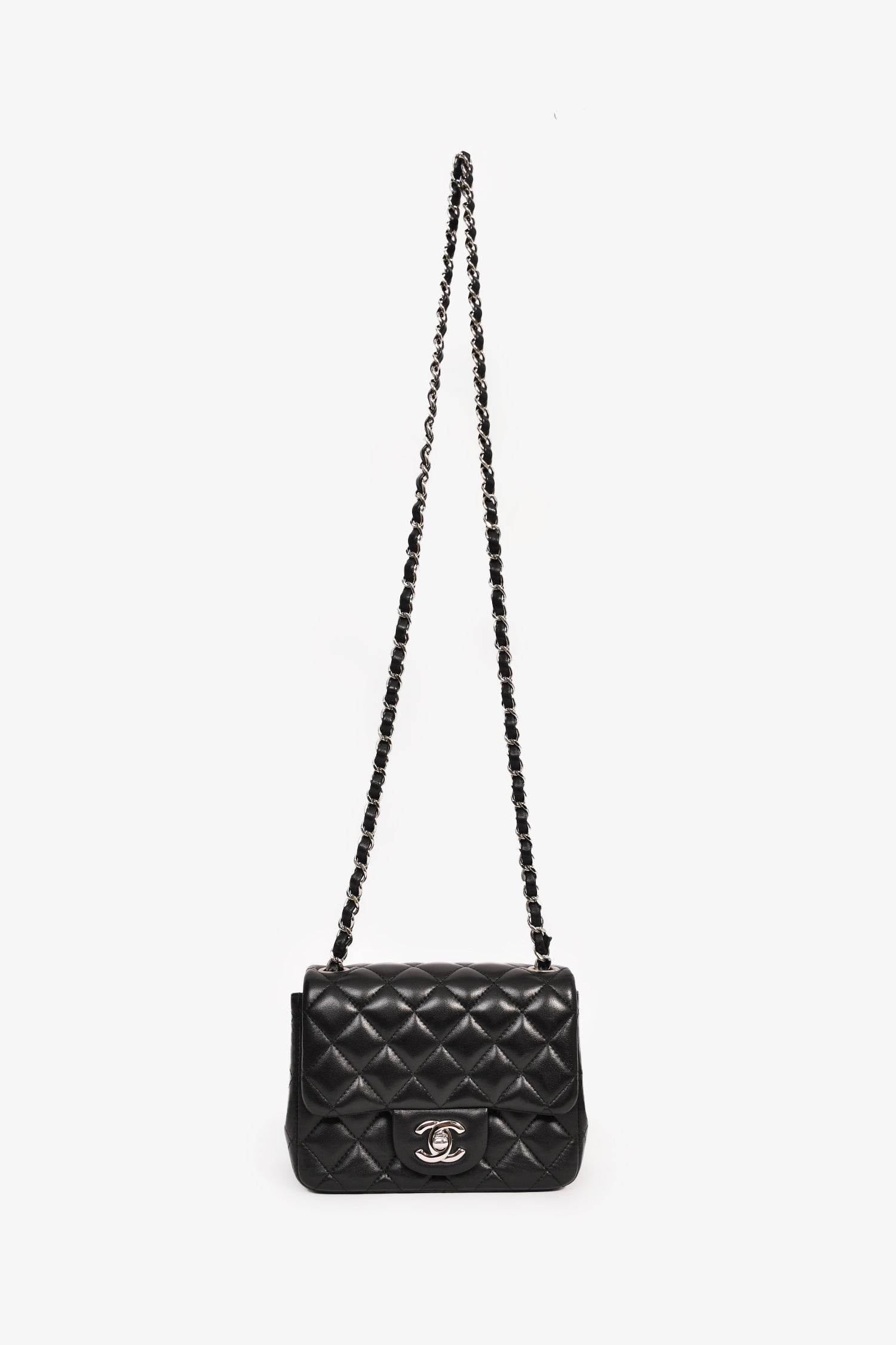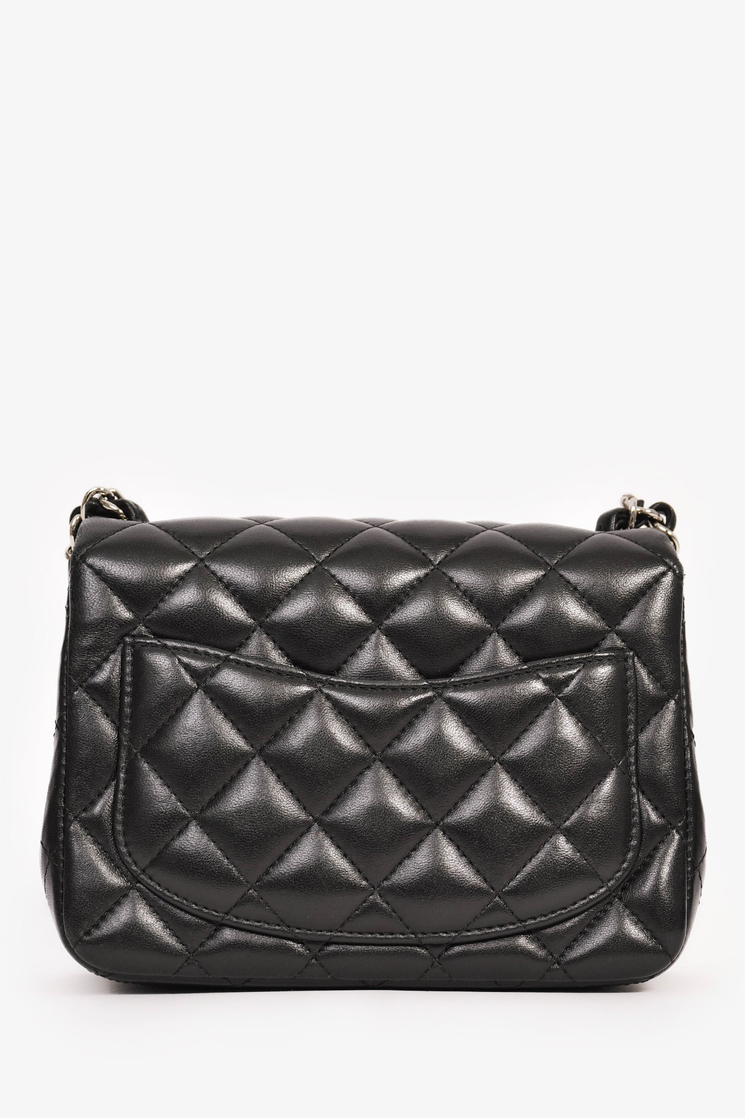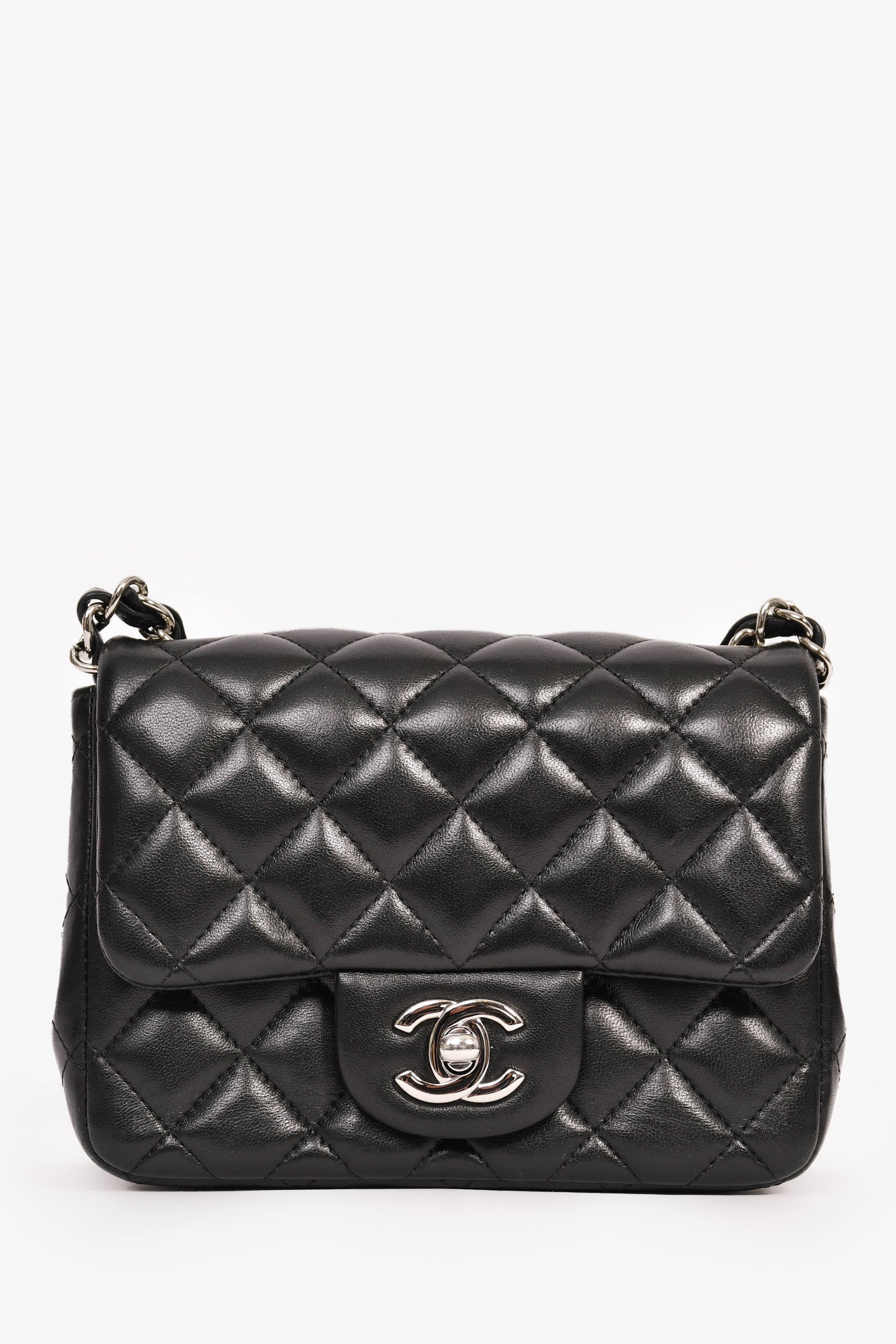 Pre-Loved Chanel™ 2019 Black Lambskin Mini Square Flap Crossbody. Front fold-over flap with turn-lock closure. Chainlink crossbody strap. Single rear exterior slip pocket. Leather-lined interior. 2 interior pockets; 1 slip and 1 zip. Tonal stitching. Silver-tone hardware.