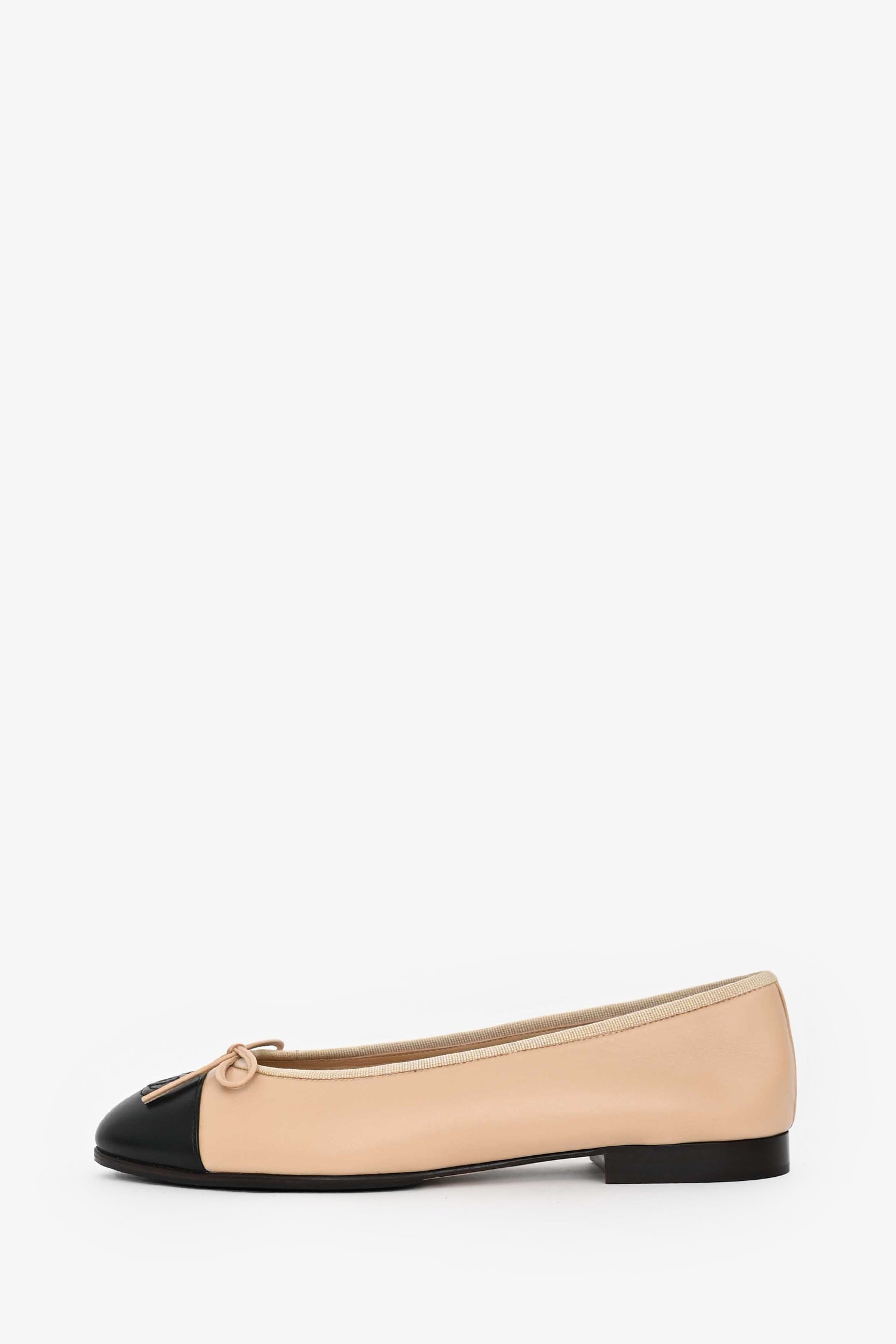 Refresh availabilityPre-Loved Chanel™ Beige Black Cap Toe CC Ballet Flats. Slip-on. Round toe. Tonal stitching.