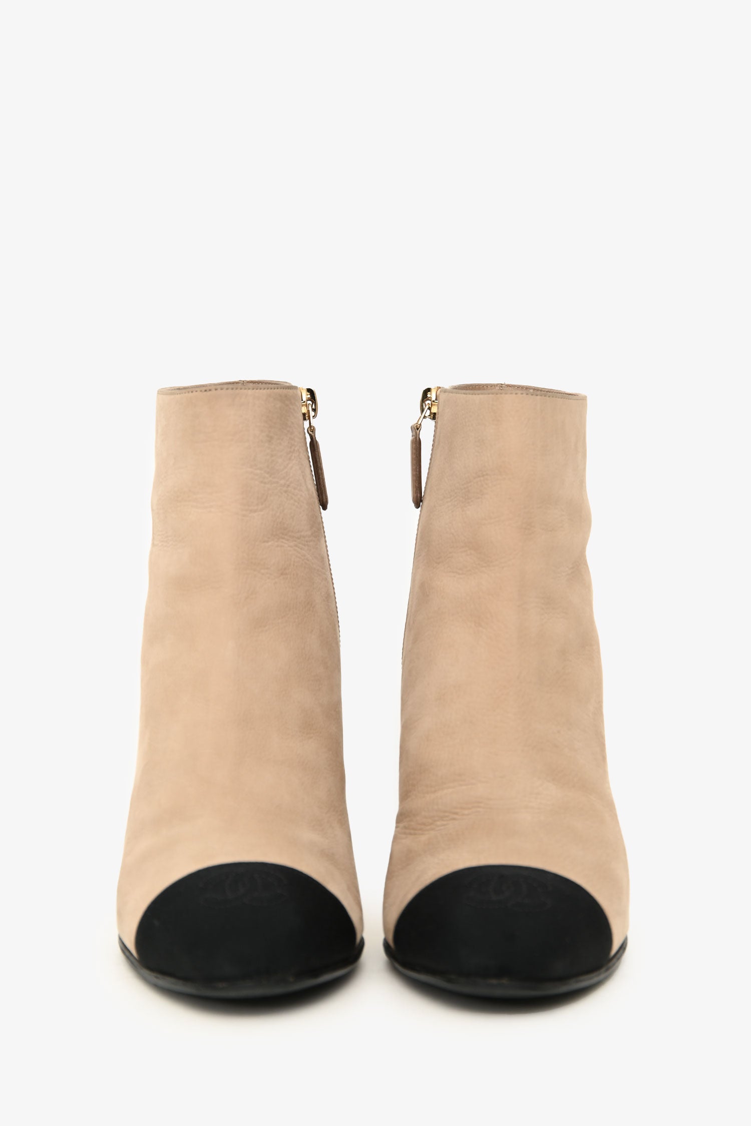 Refresh availabilityPre-Loved Chanel Beige Black CC Cap Toe Pearl Heel Boots. Pull-on. Round toe. Side zip closure. Leather lining and insoles. Gold-tone hardware. Tonal stitching.