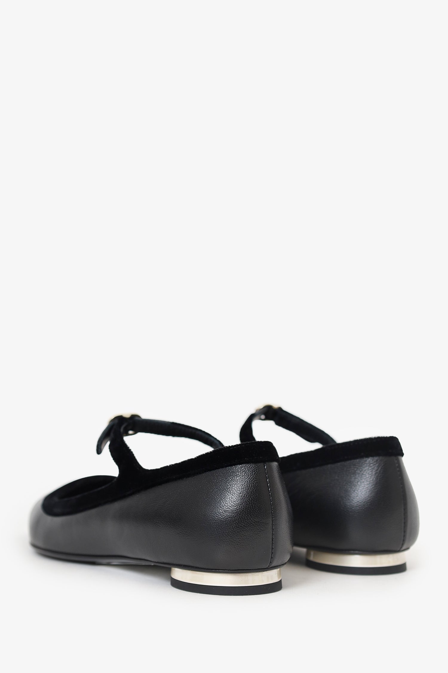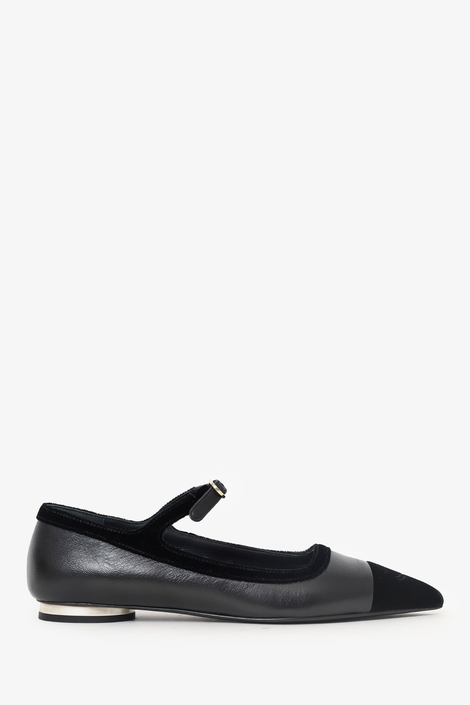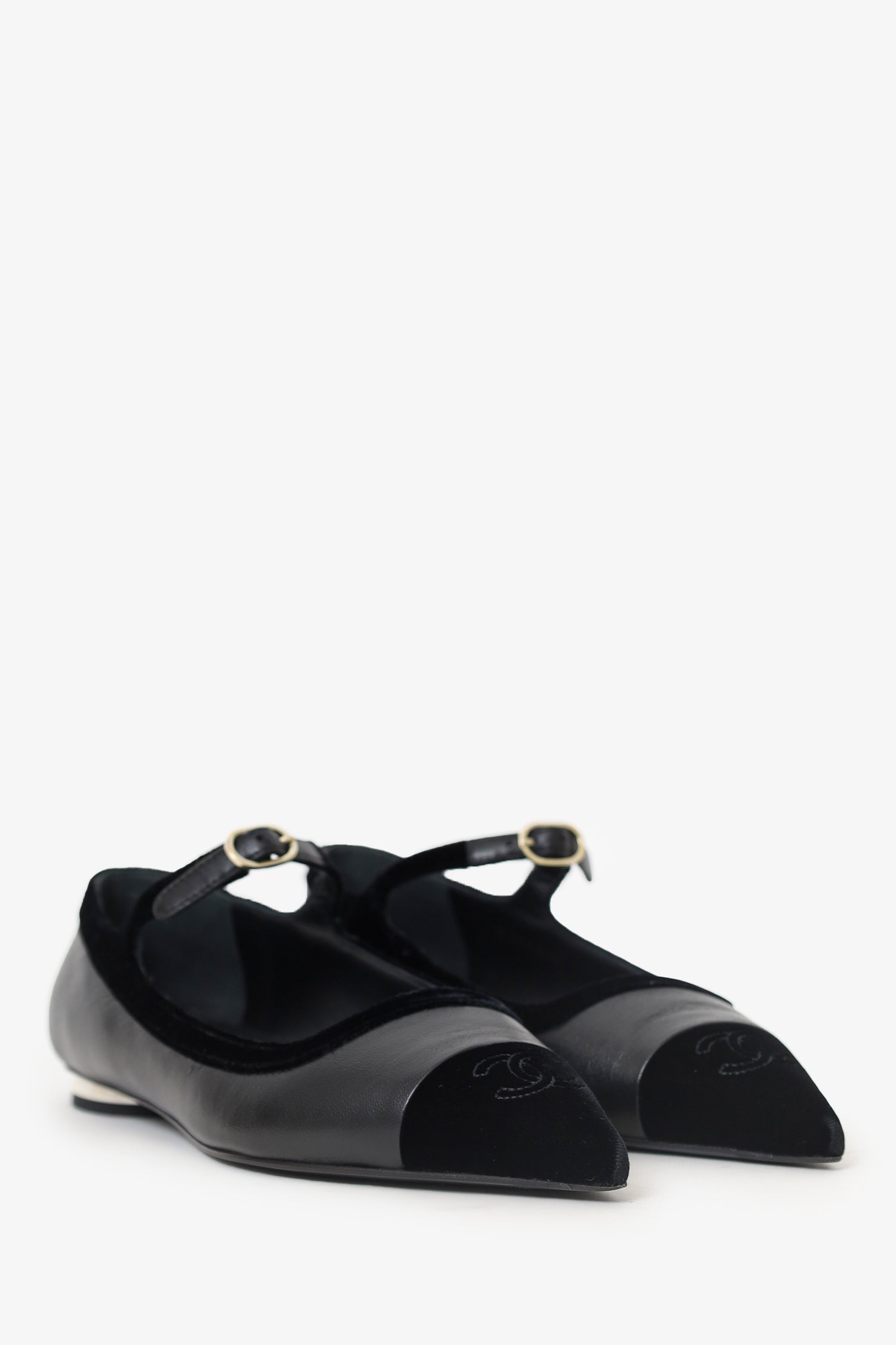 Refresh availabilityPre-Loved Chanel™ Black Leather/Velvet Mary-Jane Pointed-Toe Flats Size 36.5. Slip-on. Pointed toe. Top strap with adjustable buckle closure. Velvet toe box and lining. Lined interior. Silver-tone hardware. Tonal stitching.