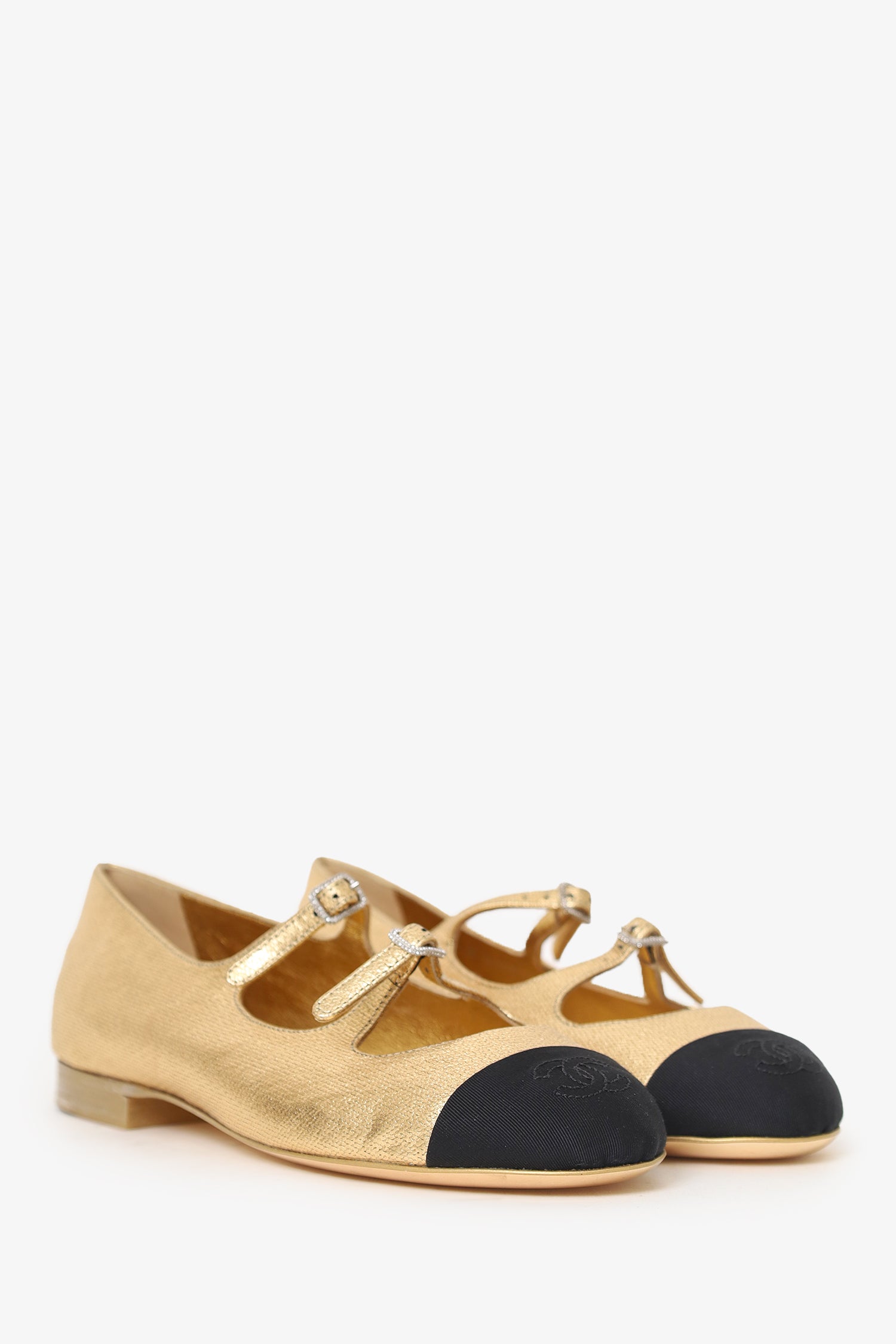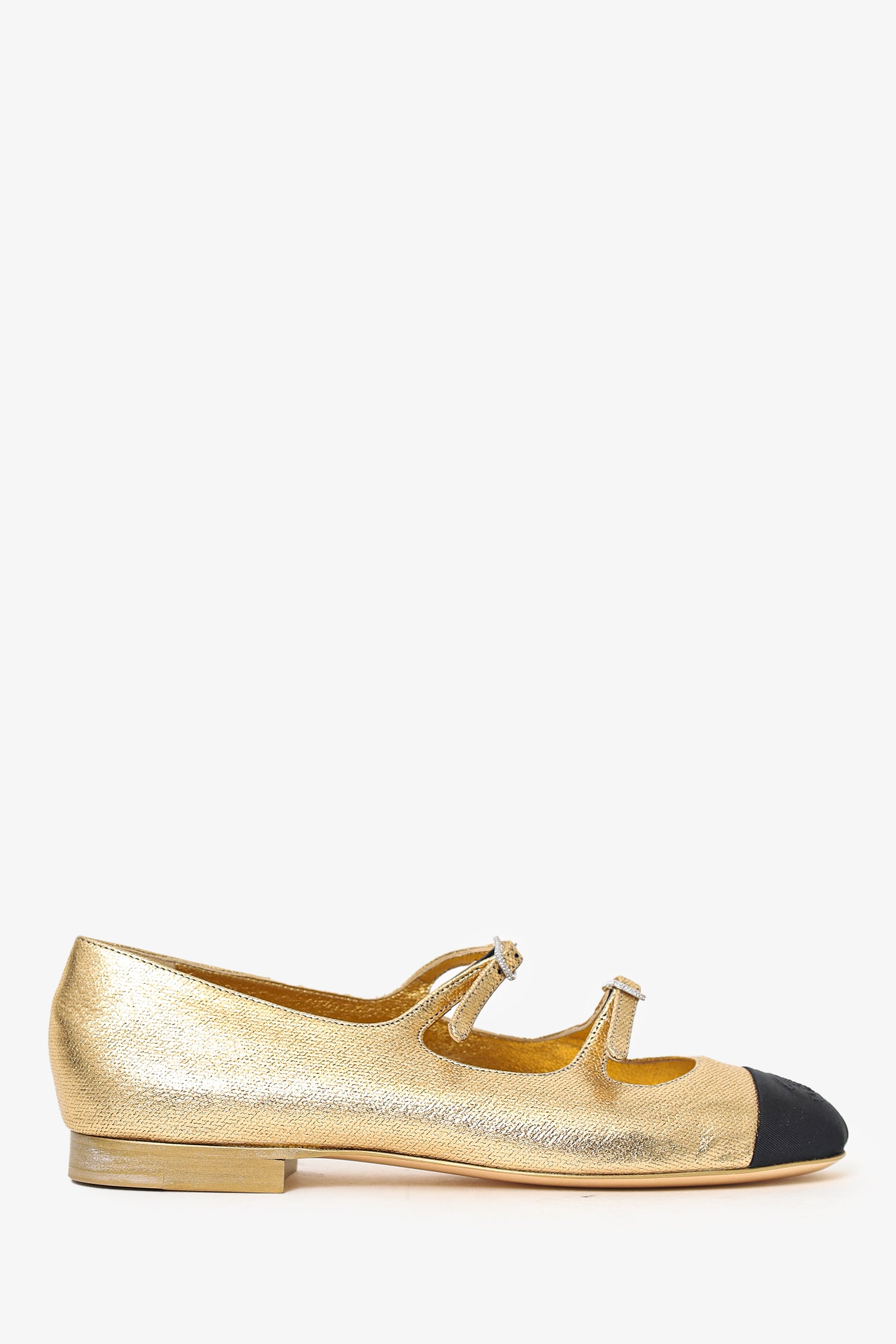 Refresh availabilityPre-Loved Chanel™ Gold Metallic Mary-Jane Ballerina Flats. Slip-on. Round toe. 2 top straps with adjustable buckle closure. Logo detail on toe box. Lined interior. Silver-tone hardware. Tonal stitching.