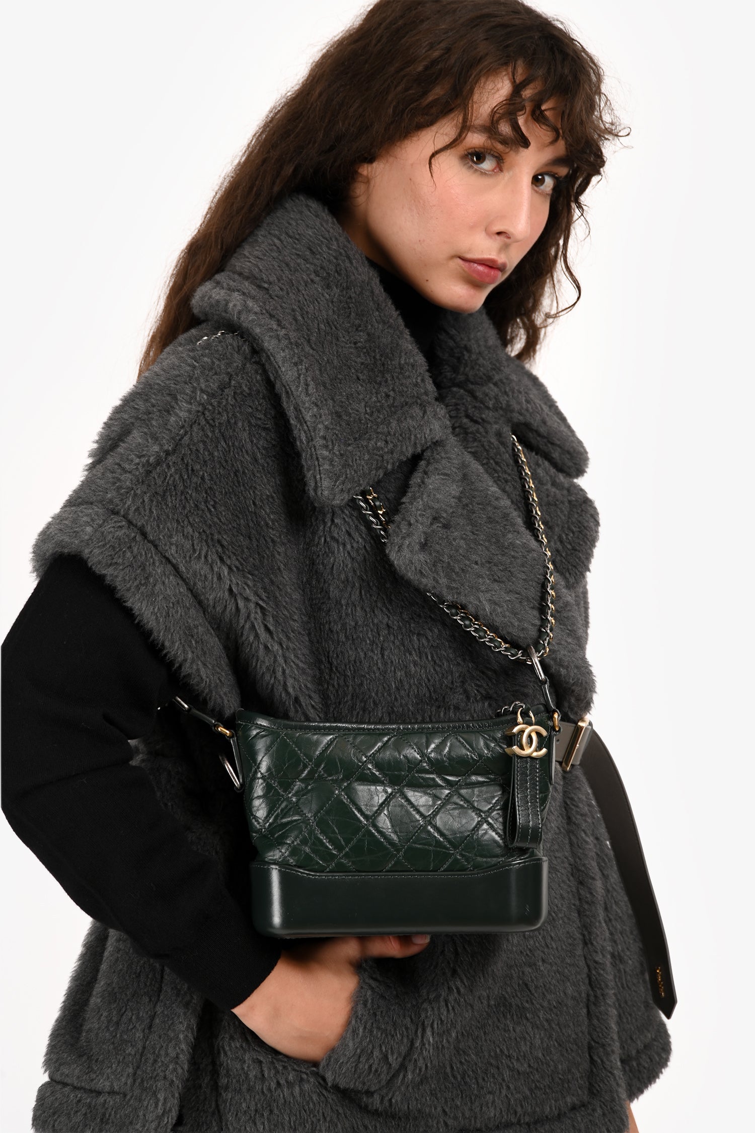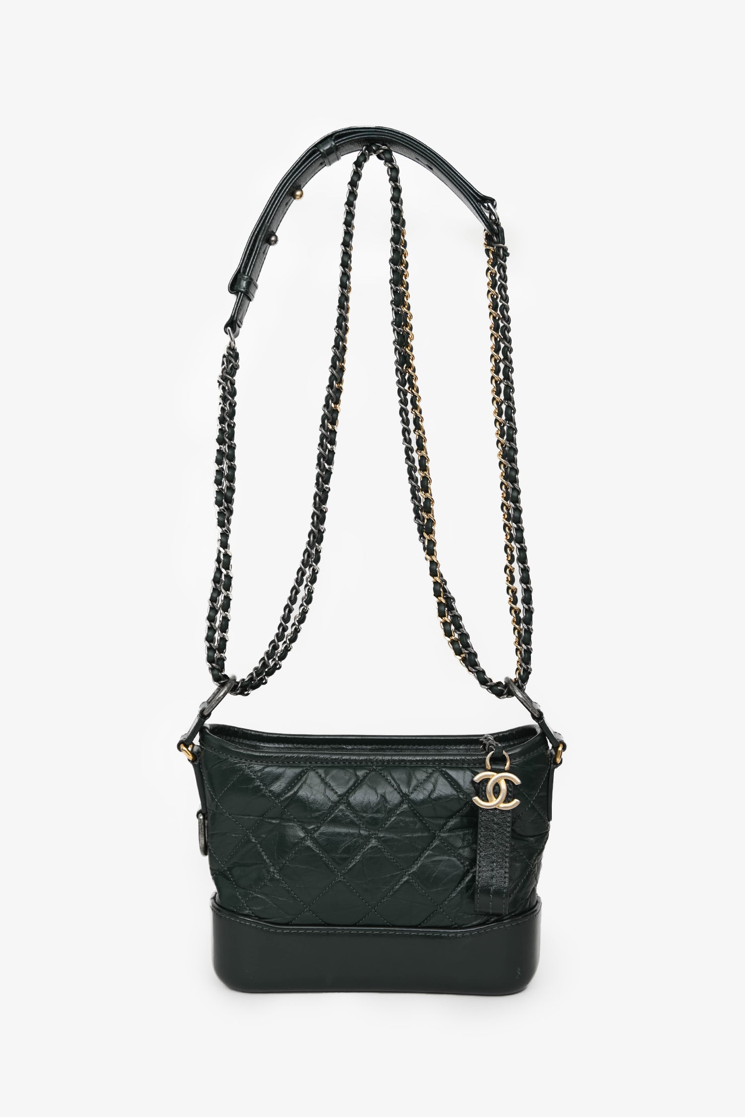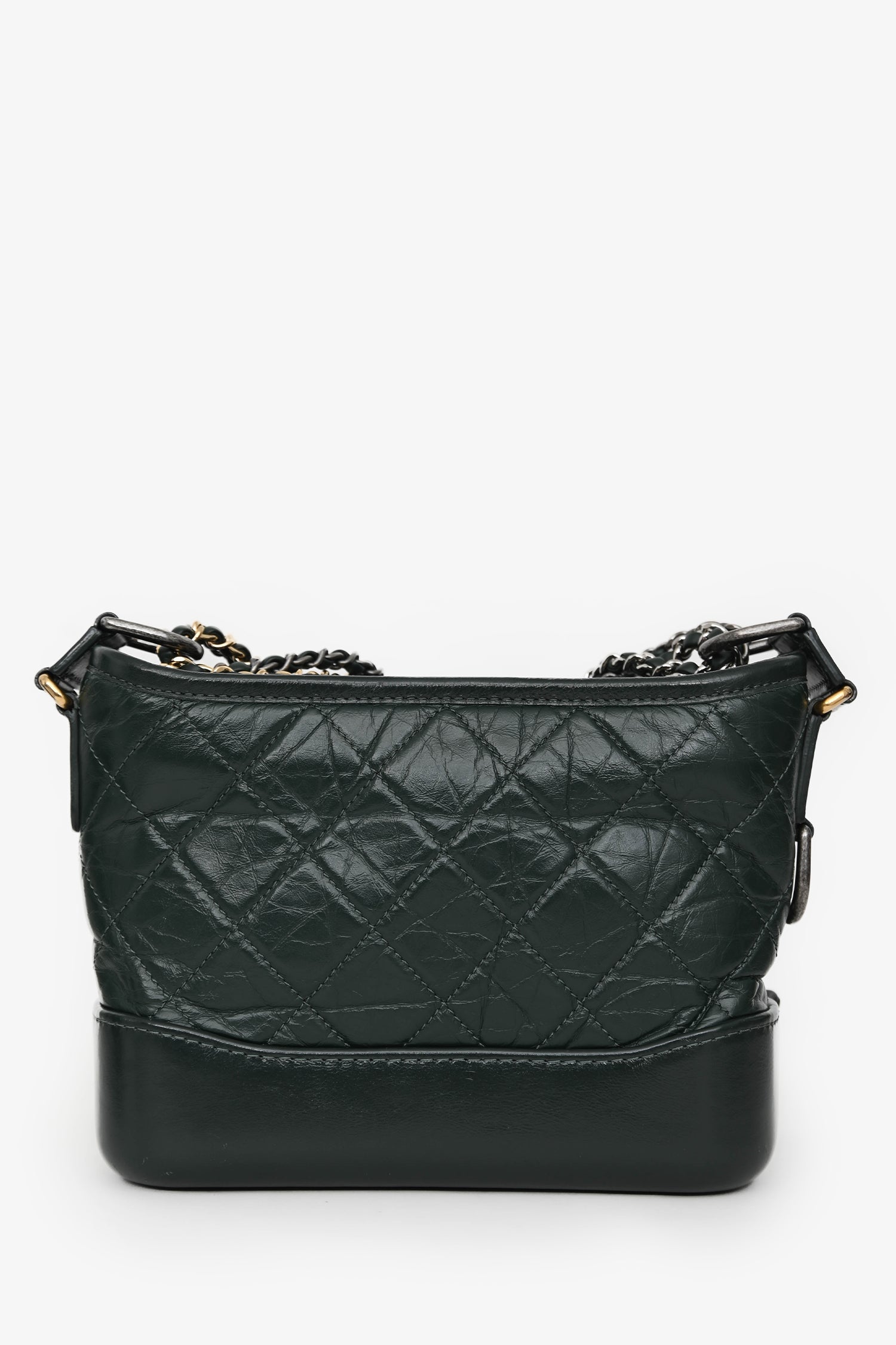 Refresh availabilityPre-Loved Chanel™ Green Aged Leather Small Gabrielle Crossbody. Zip closure at the top. Adjustable leather-and-chain crossbody strap. 1 interior compartment with 1 interior zip pocket; 2 interior slip pockets. Interior stap with lobster clasp. Gold-tone and silver-tone hardware. Tonal stitching.