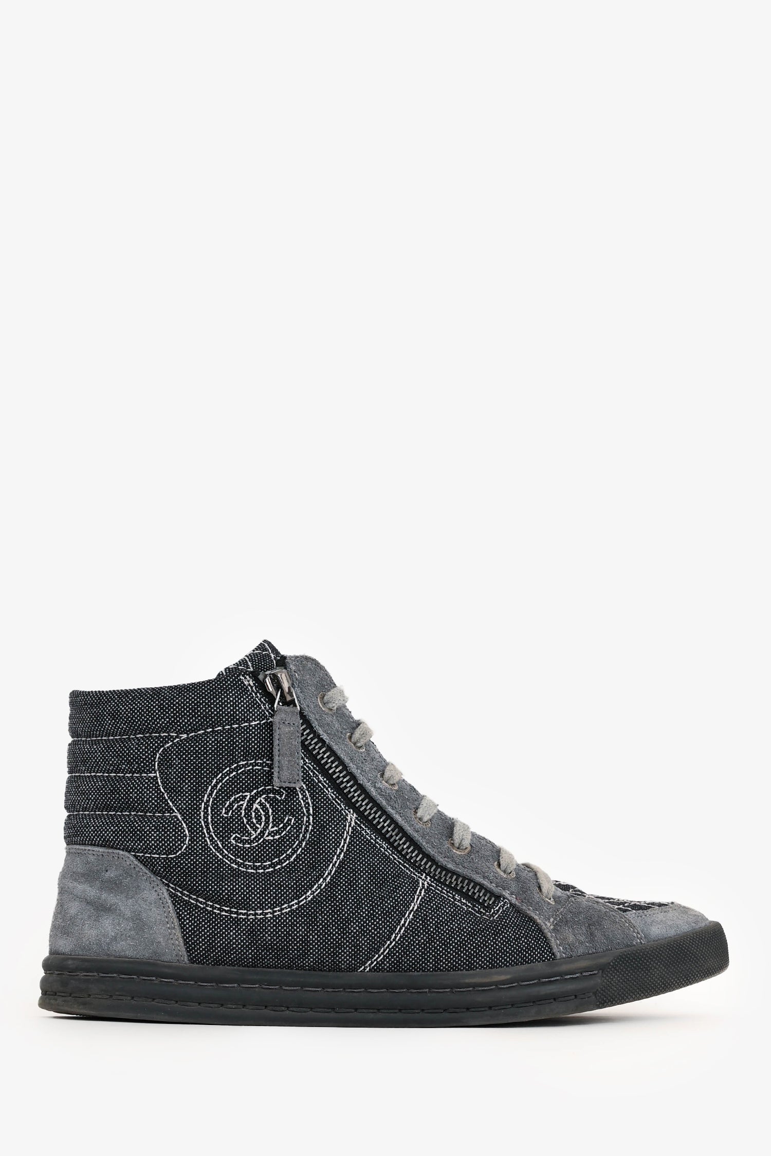 Refresh availabilityPre-Loved Chanel™ Grey/White Stitch Detail Mid Top Sneakers. Round toe. Side zipper and front lace-up closure. Leather insole. Suede backing and zipper pull. Silver-tone hardware. Contrast stitching.