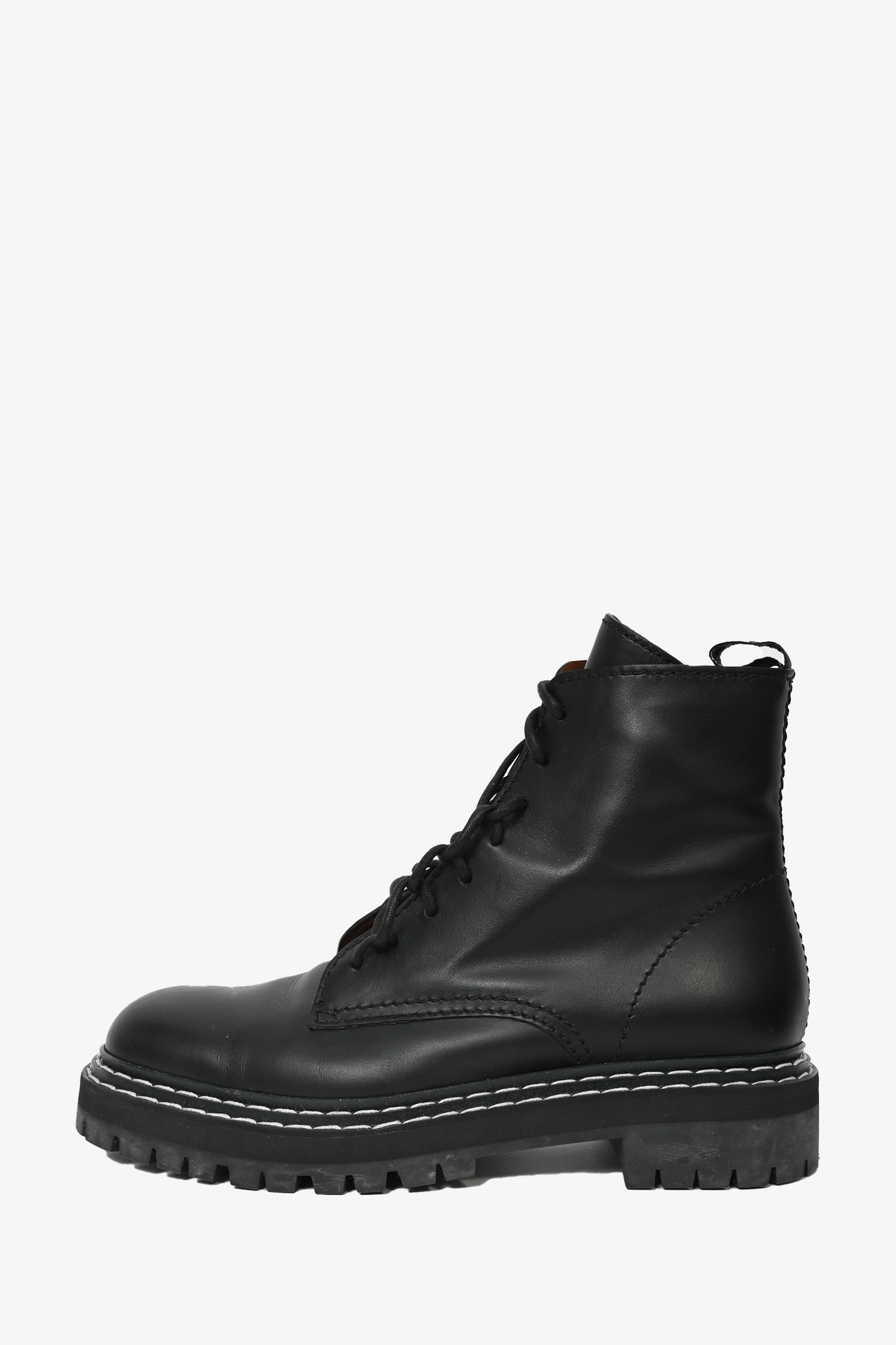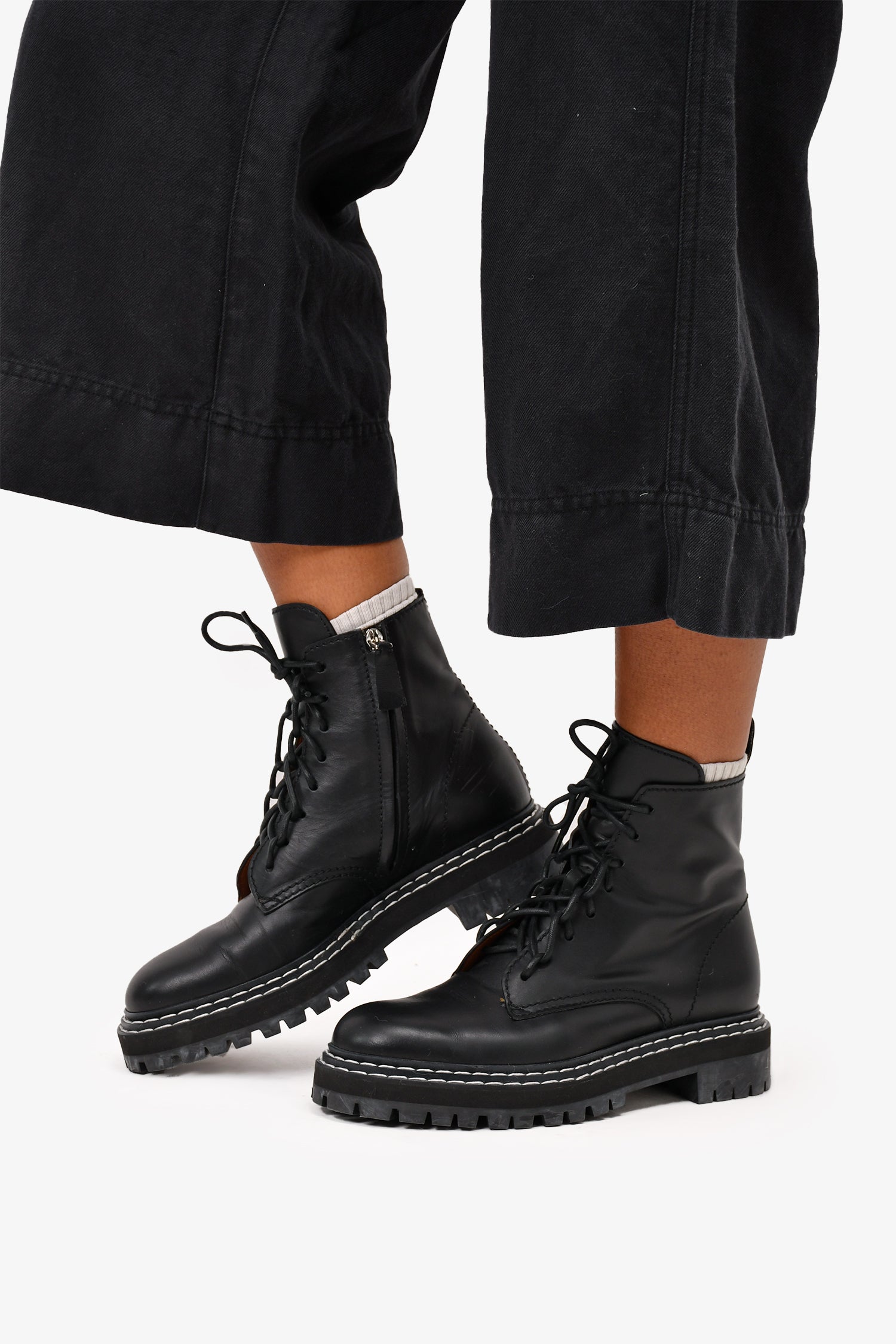 Refresh availabilityProenza Schouler Black Leather Lace-Up Combat Boots. Tie-up closure. Round toe. Contrast stitching.