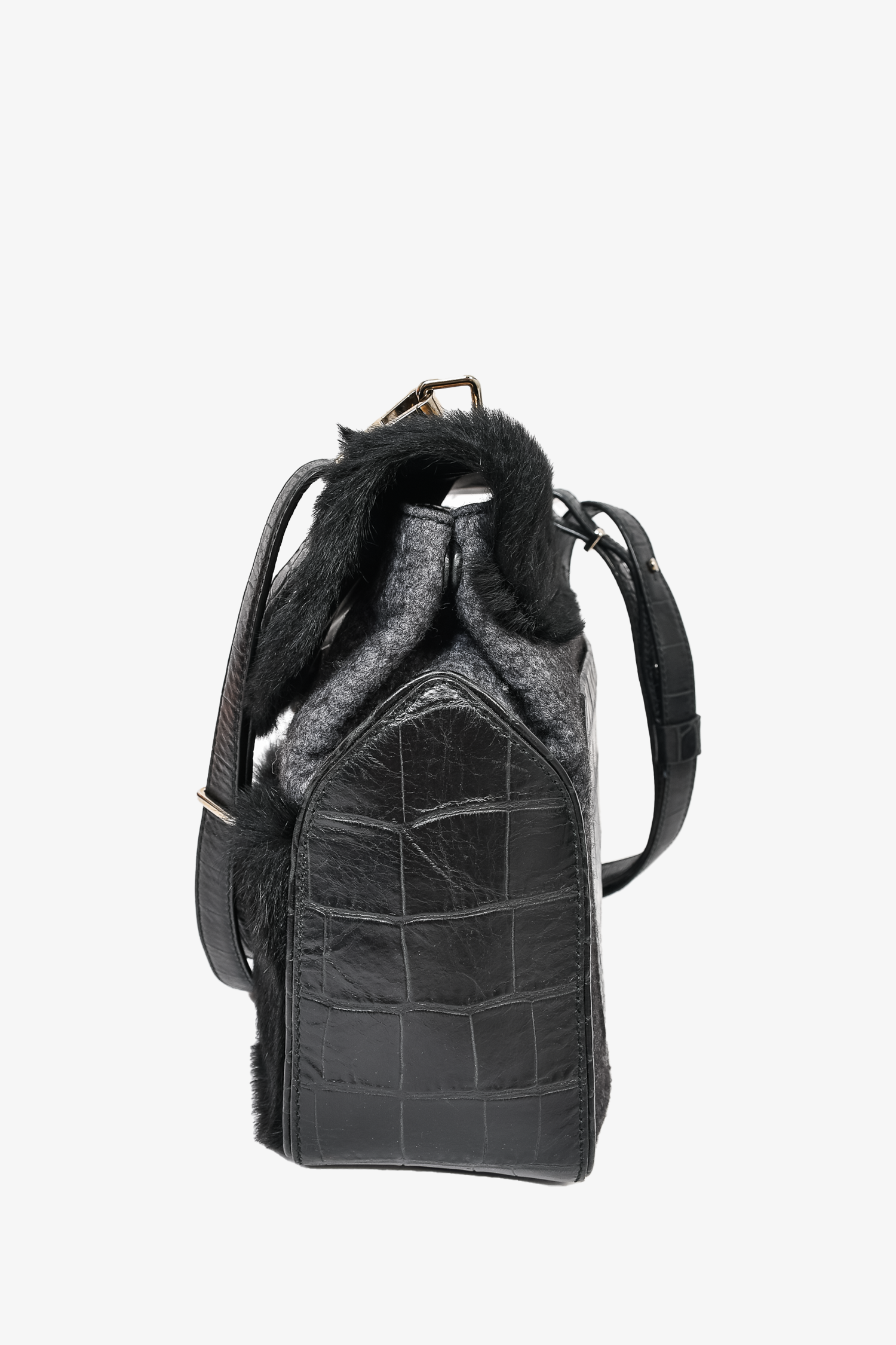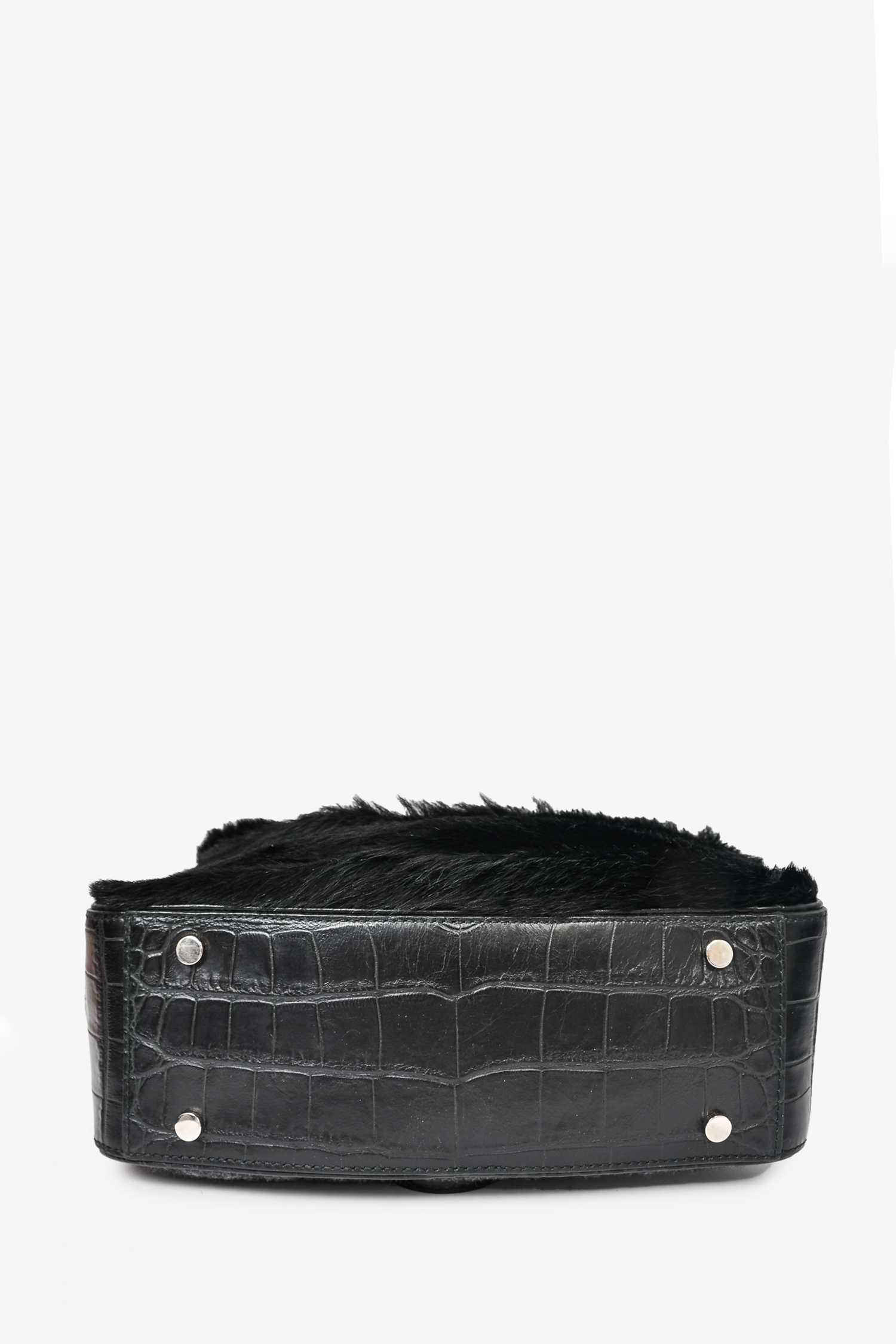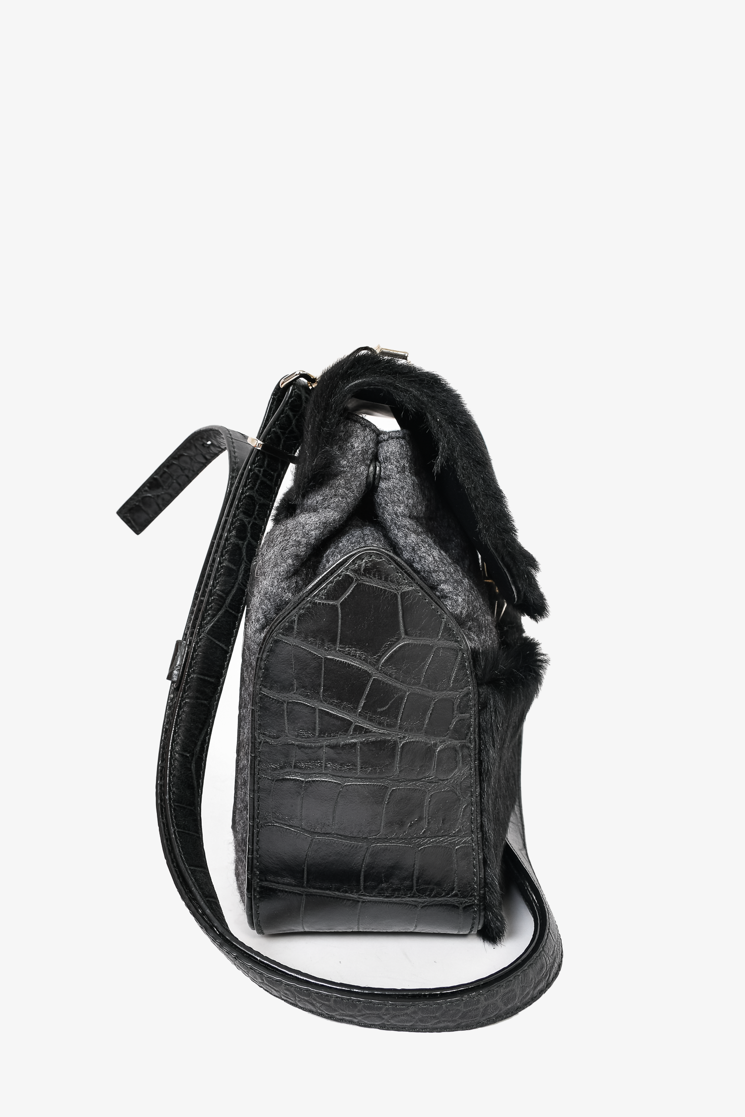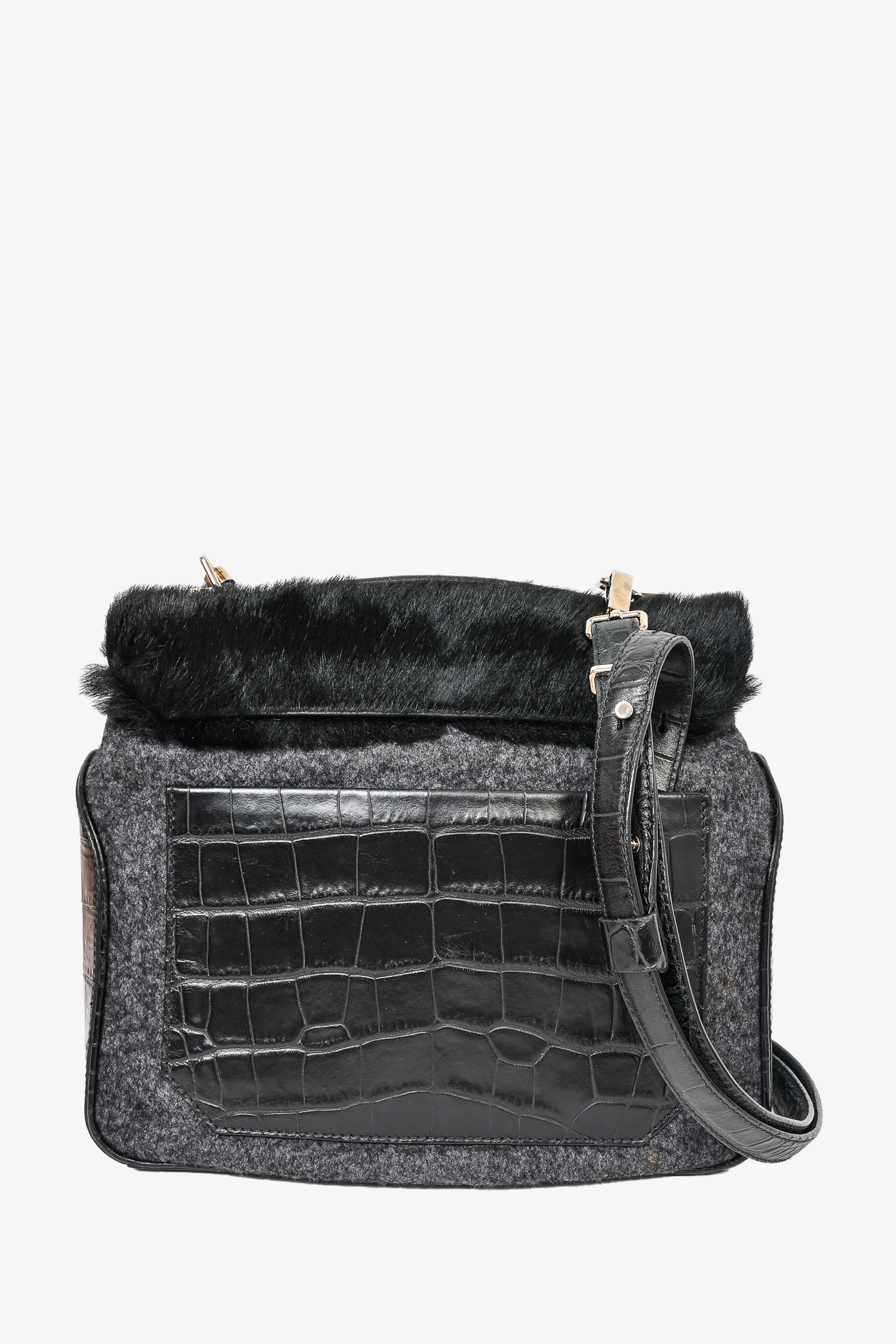 Refresh availabilityProenza Schouler Black Pony Calf Hair/Croc Embossed Leather Flap Bag with Strap. Front zip pocket. Front fold-over flap with push-lock closure. Grey textile interior lining. 2 interior wall pockets; 1 slip and 1 with zip closure. Protective metal bottom. Adjustable strap. Silver-tone hardware. Tonal stitching.