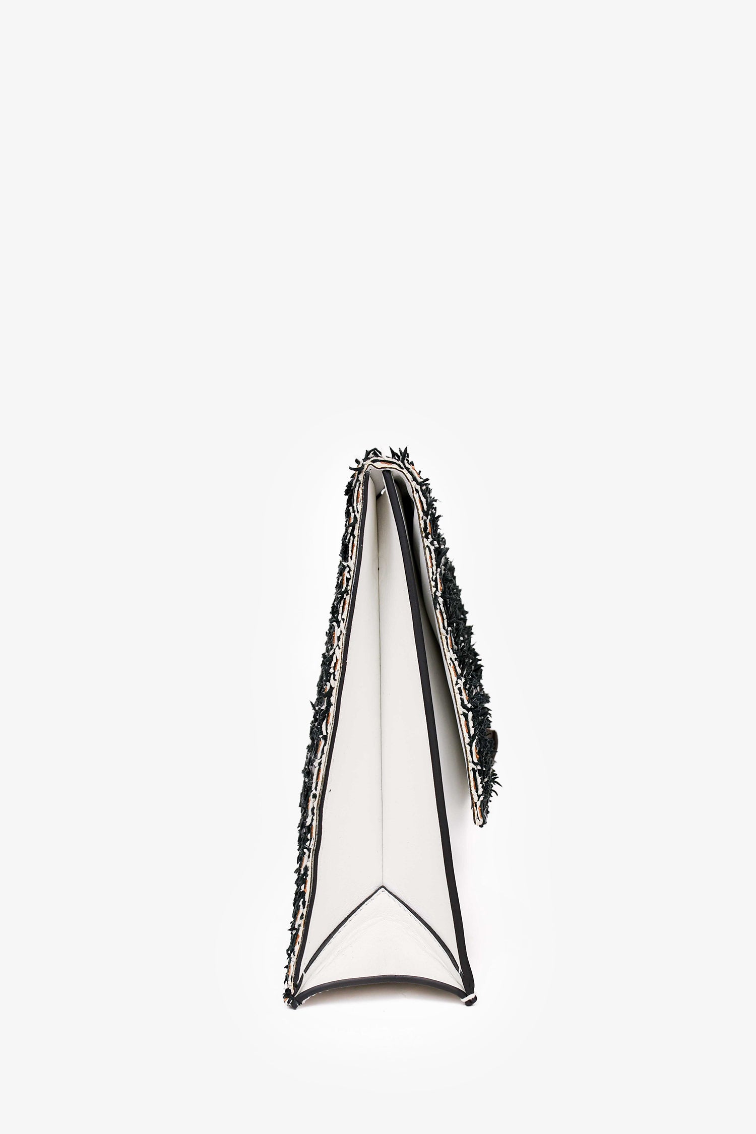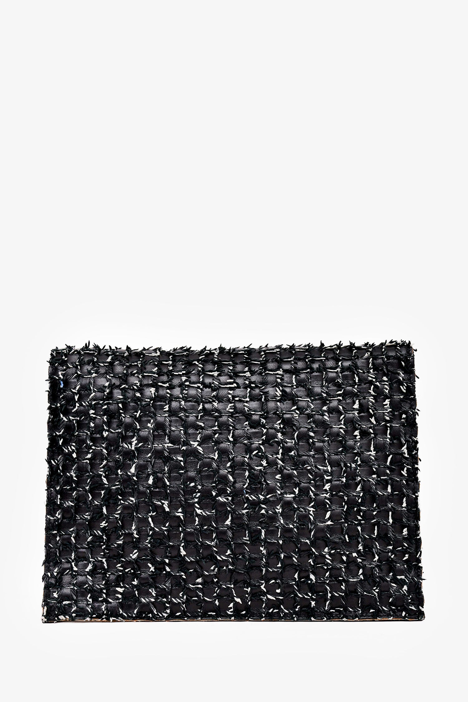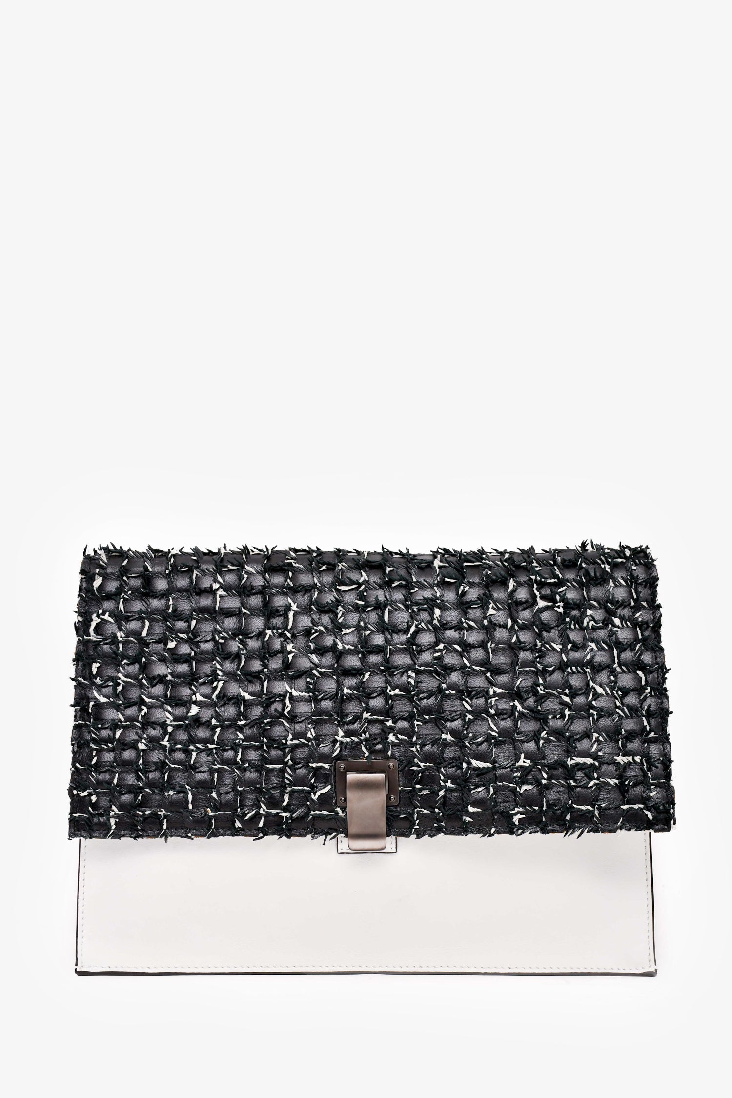 Refresh availabilityProenza Schouler Black/White Leather Woven Tweed Clutch. Front fold-over flap with flip-lock closure. Single interior slip pocket. Gunmetal-toned hardware. Tonal stitching.