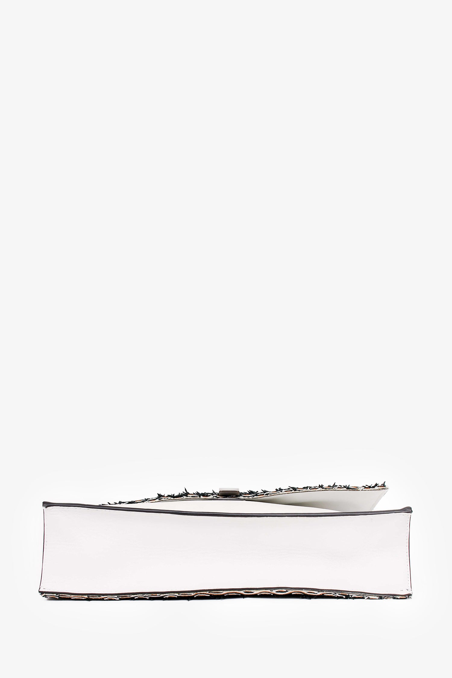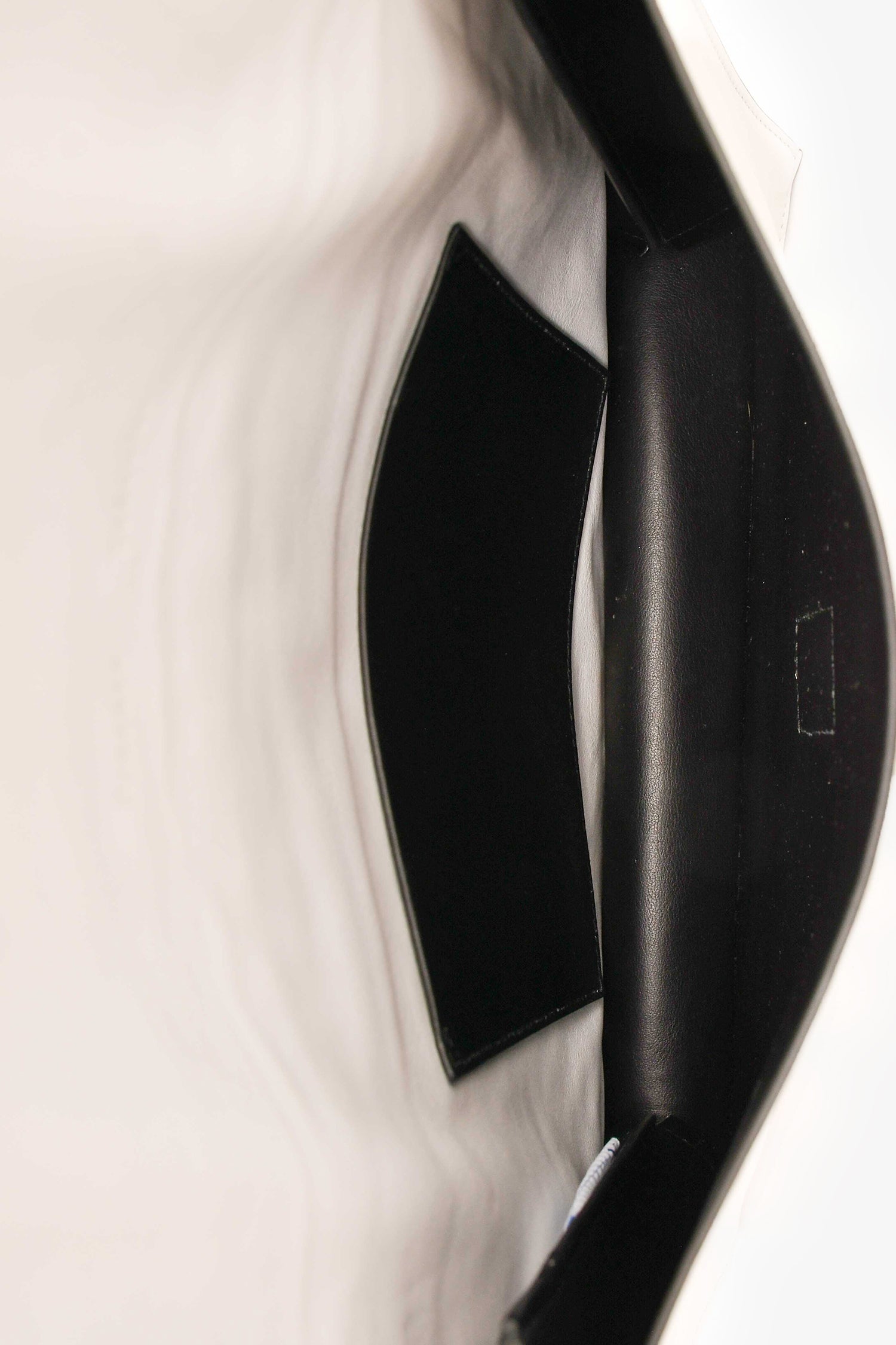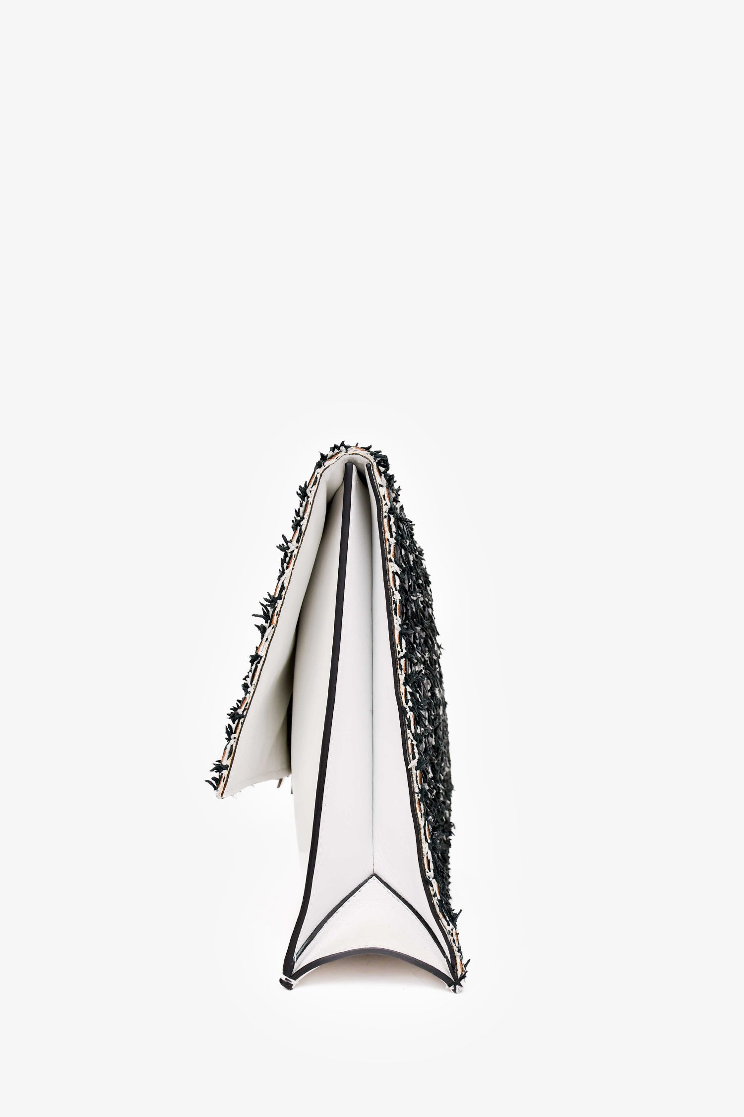 Refresh availabilityProenza Schouler Black/White Leather Woven Tweed Clutch. Front fold-over flap with flip-lock closure. Single interior slip pocket. Gunmetal-toned hardware. Tonal stitching.