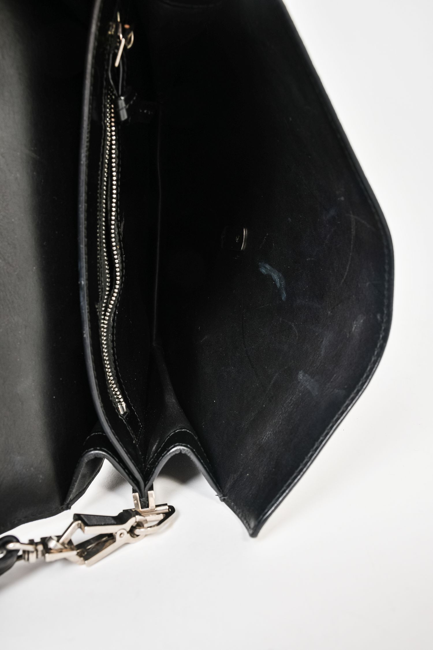 Condition: This item is in good pre-loved condition with stains throughout the outer. Scratches and discoloration on the hardware. Wear on the outer corners.