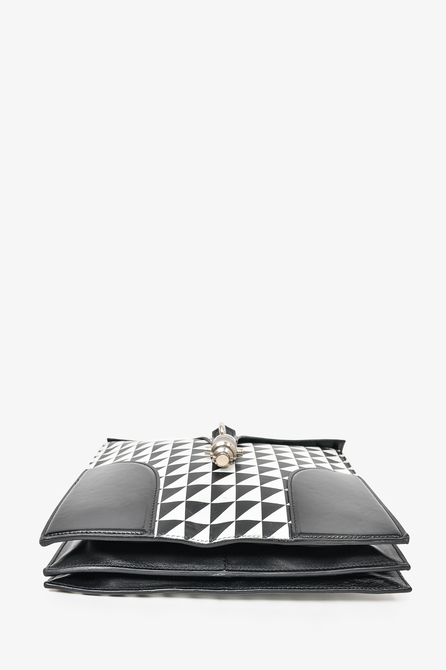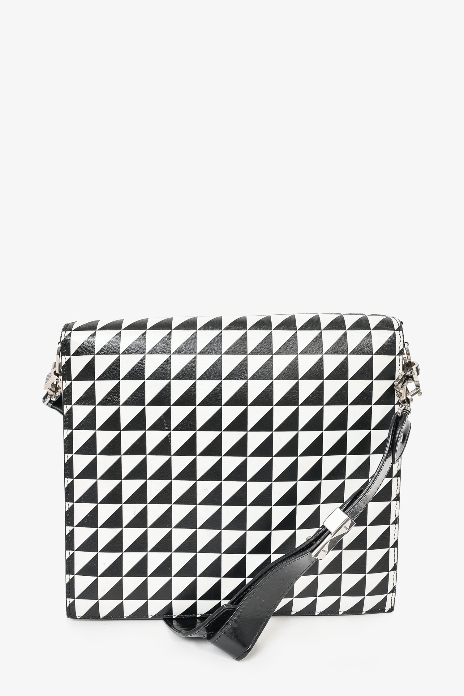 Refresh availabilityProenza Schouler White/Black Printed Leather Trimmed Shoulder Bag. Front foldover strap with pinch-lock closure. Black interior. 2 interior compartments; separated by a divider. 2 interior wall pockets; 1 zip and 1 with zip closure. Silver-tone hardware. Adjustable strap. Tonal stitching.