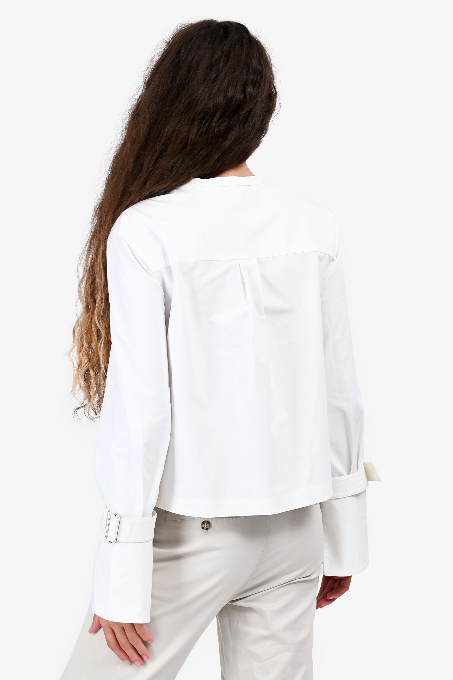 Refresh availabilityProenza Schouler White Cotton Poplin Cropped Mandarin Collar Shirt. Front button closure. Long sleeves with belted cuffs detail. Tonal stitching.