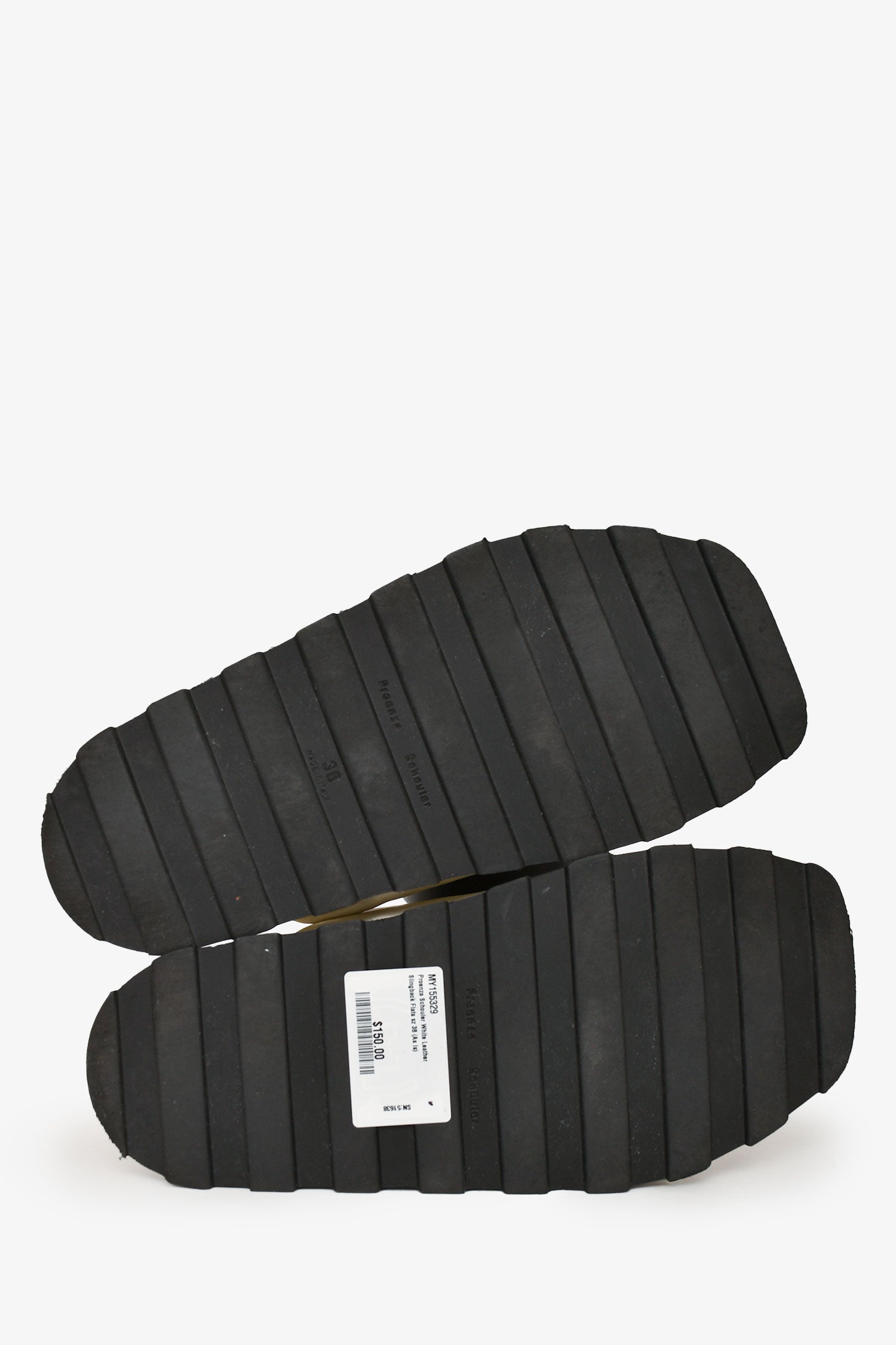 Condition: This item is sold as is. Shows slight scuffing and creasing on the leather. Minor staining marks on the left shoe leather. Wear on the soles.