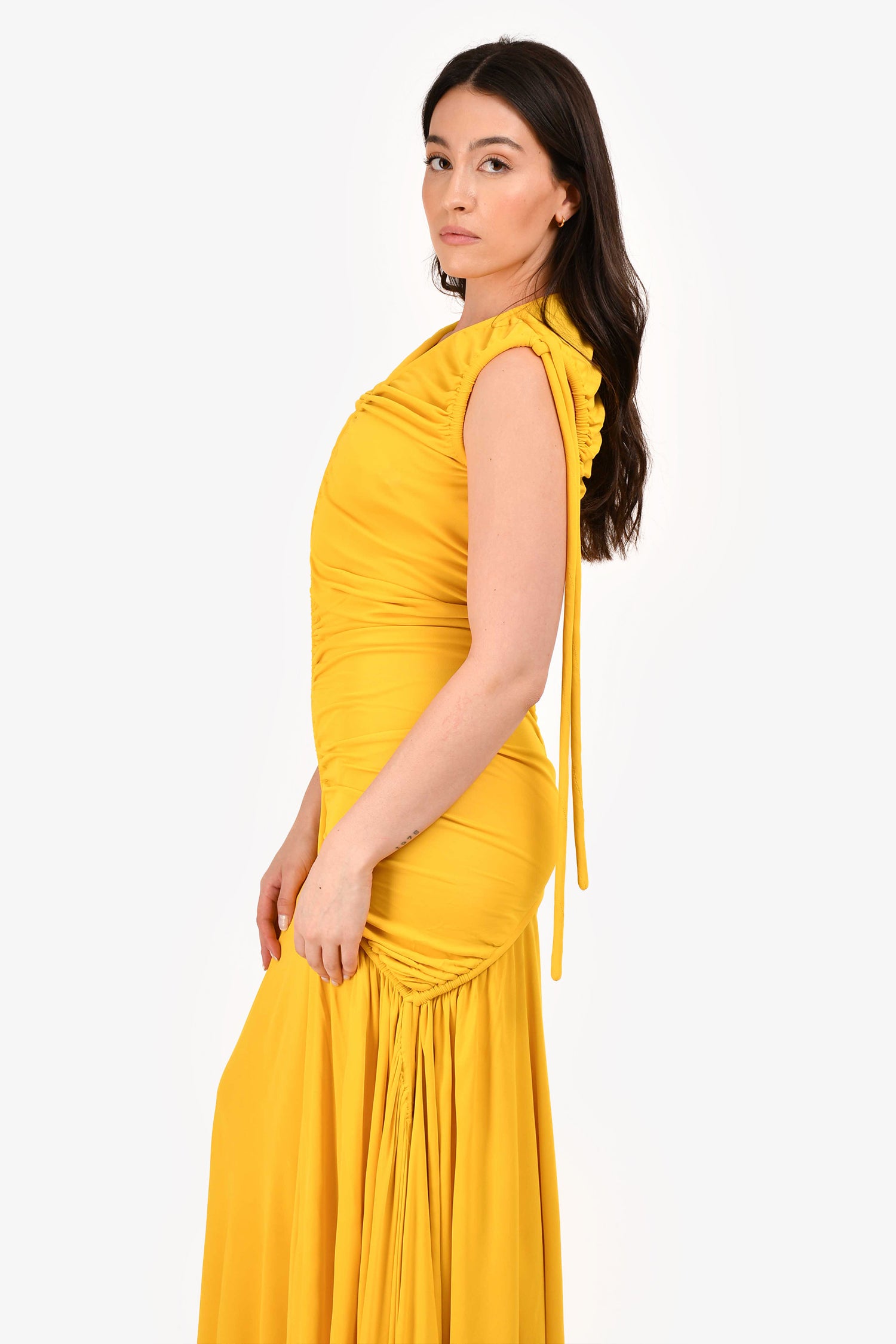 Refresh availabilityProenza Schouler Yellow Jersey Ruched Maxi Dress. Crew neckline. Sleeveless. All-over ruching detail. Fitted silhouette. Back zip-up closure. Tonal stitching.
