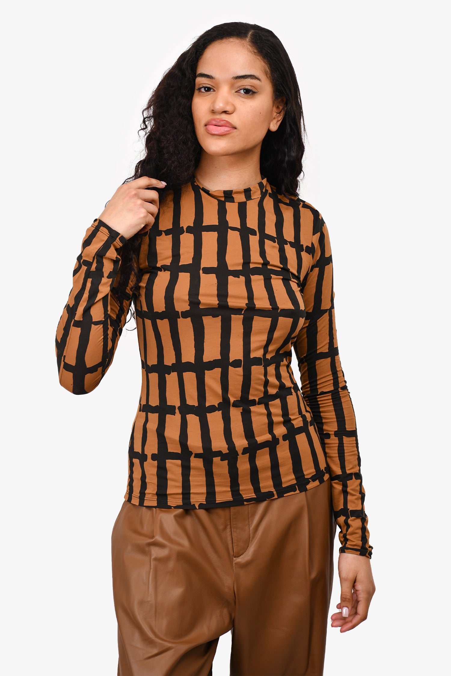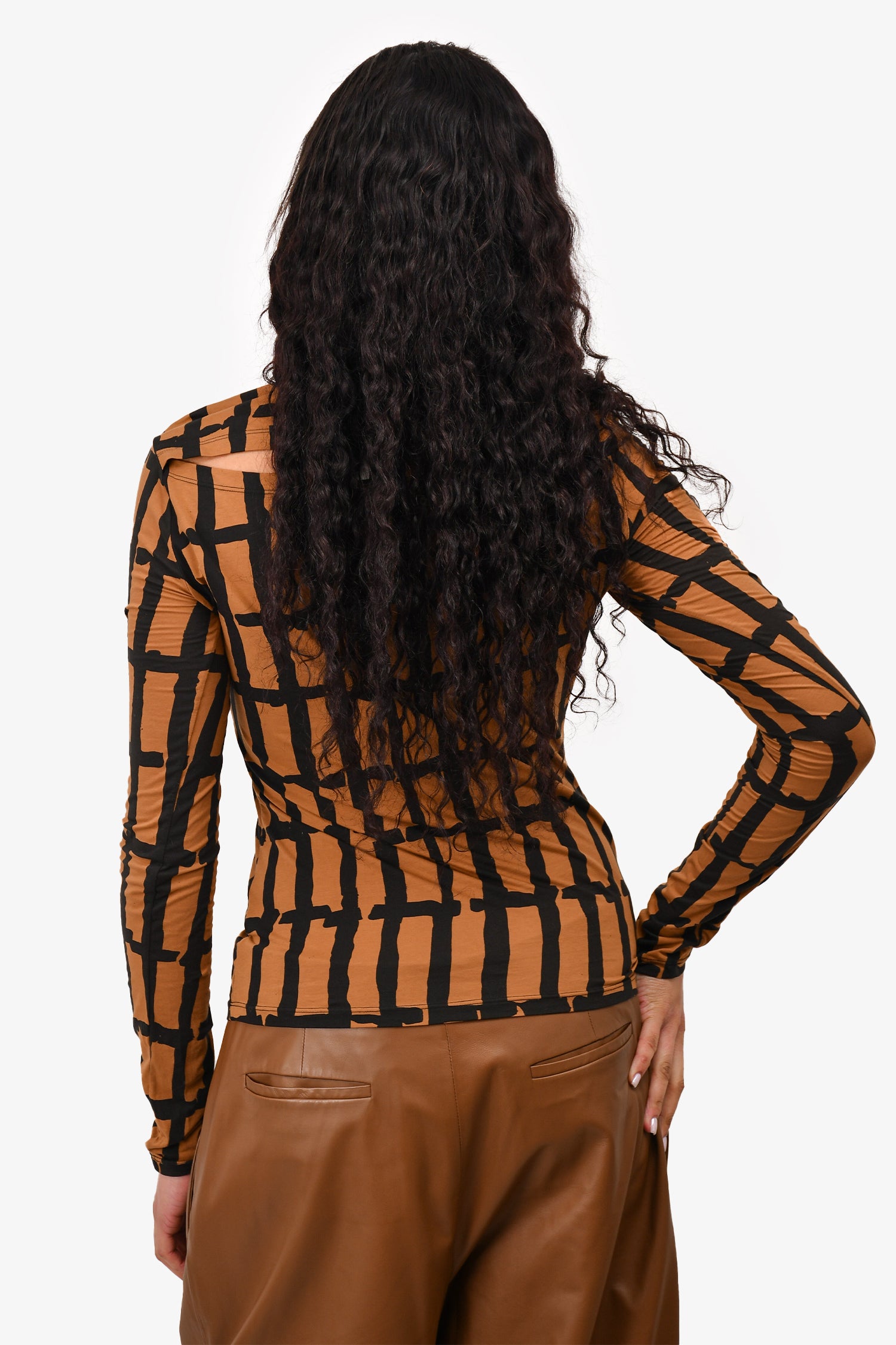 Refresh availabilityProenza White Label Brown/Black Printed Top. Tonal stitching. Eyelet detail at the back exterior with a button closure.