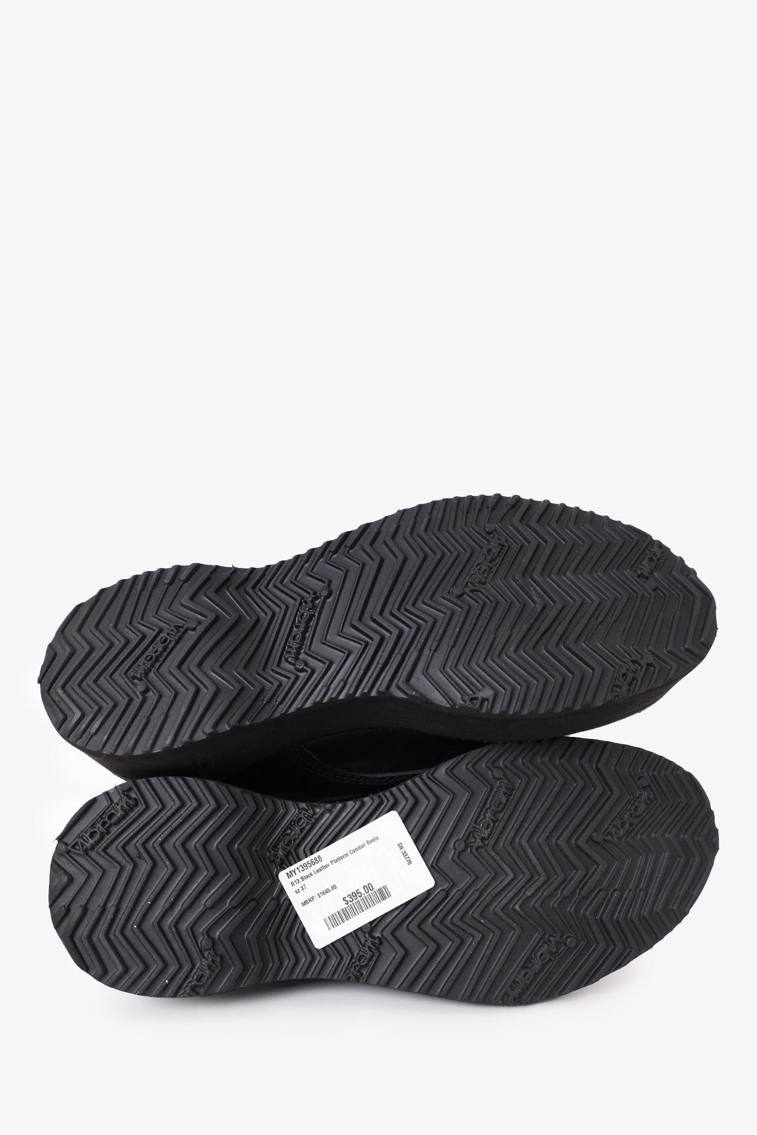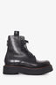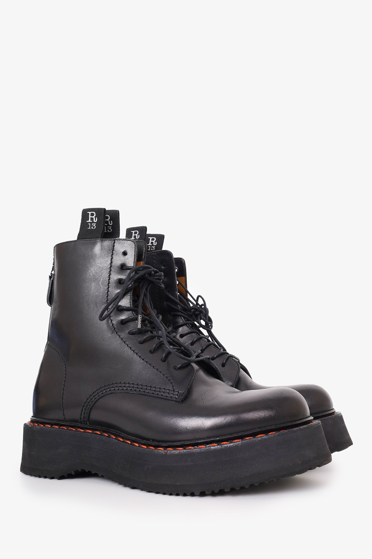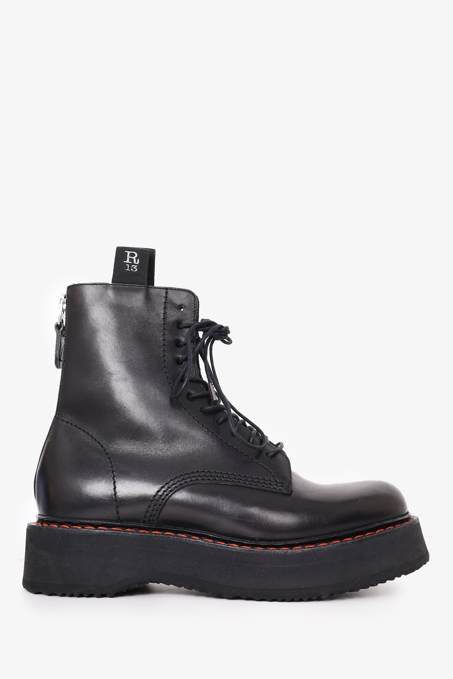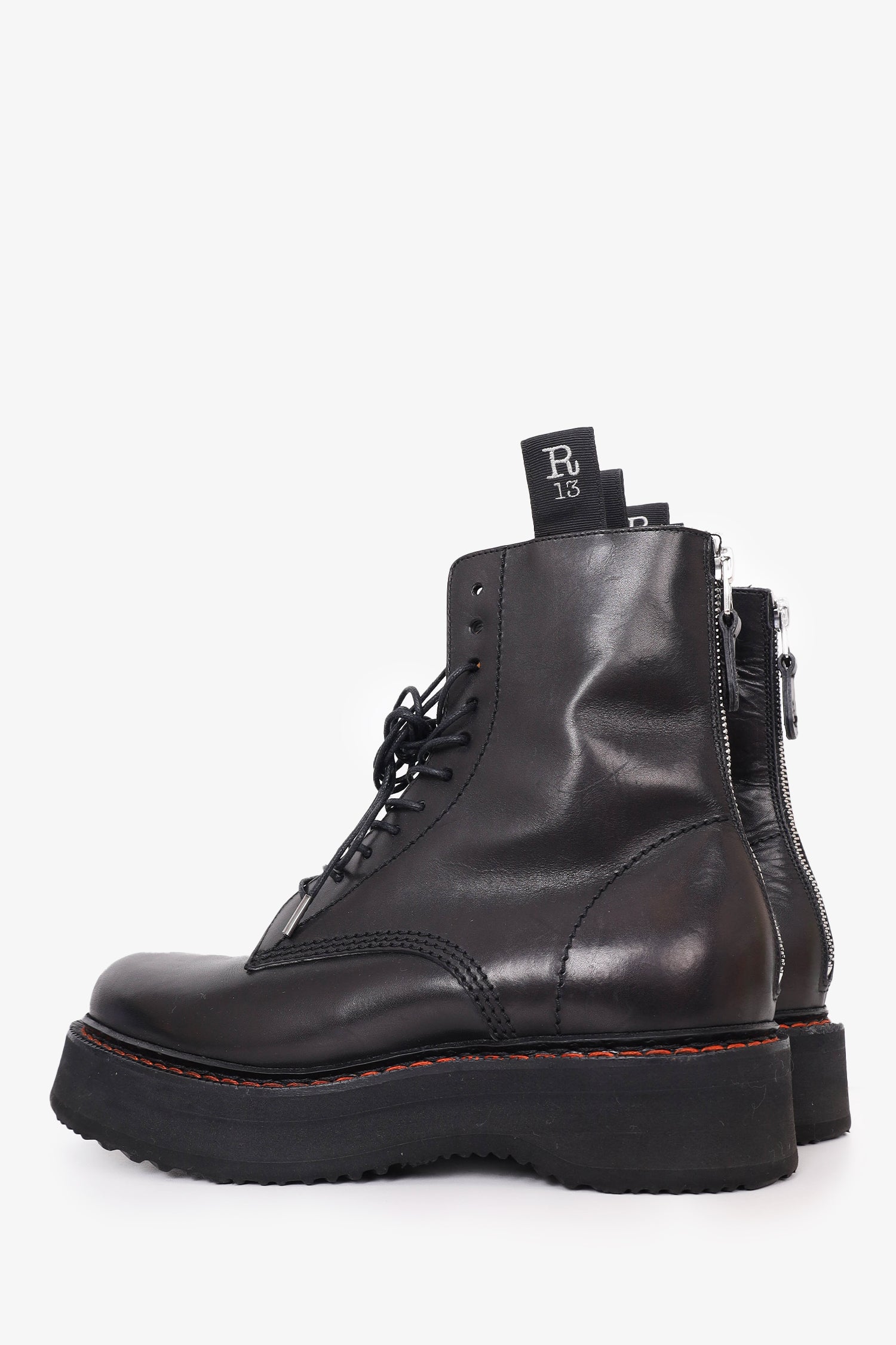 Refresh availabilityR13 Black Leather Platform Combat Boots. Rear zip closure. Round toe. Side pull tabs. Contrast stitching.