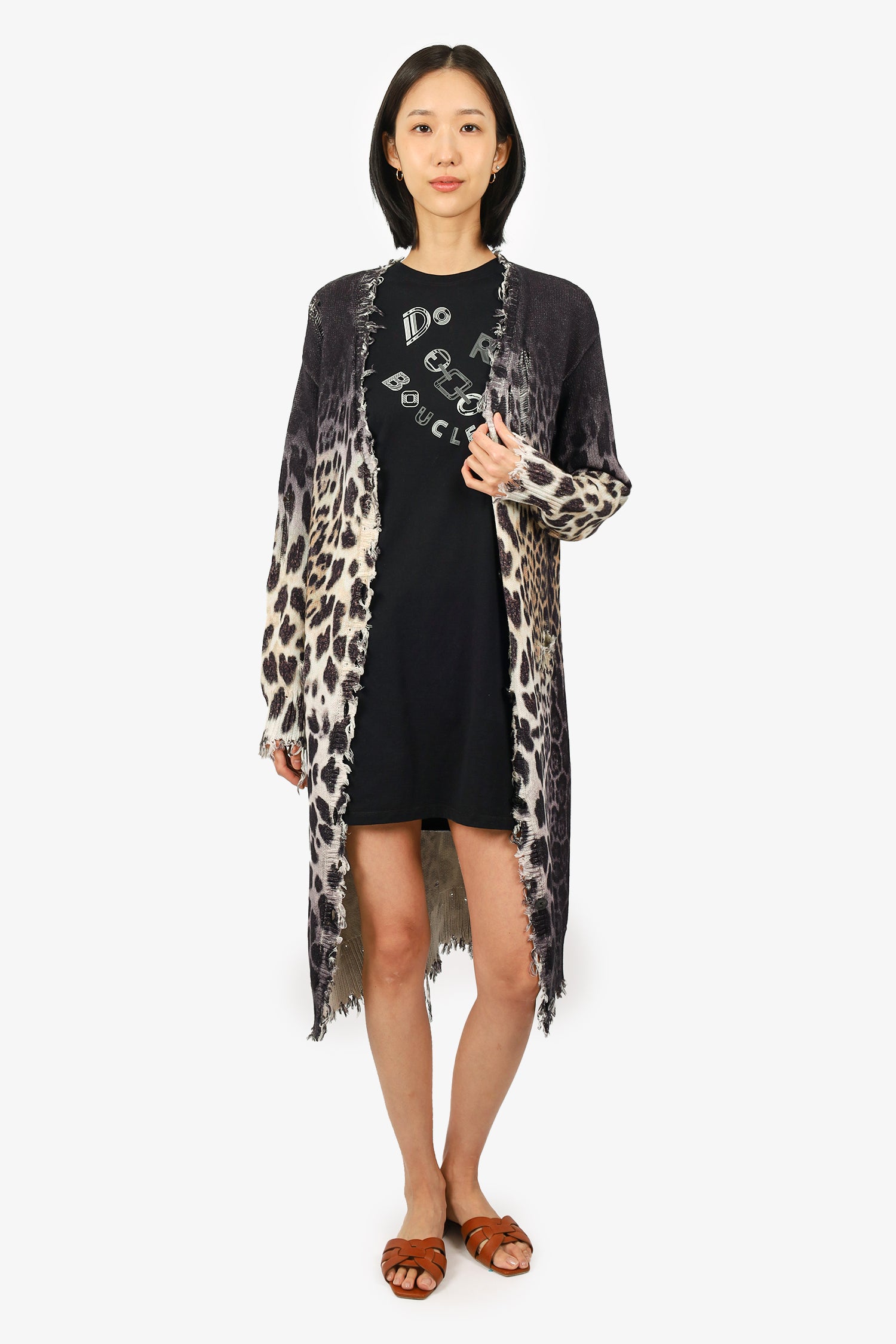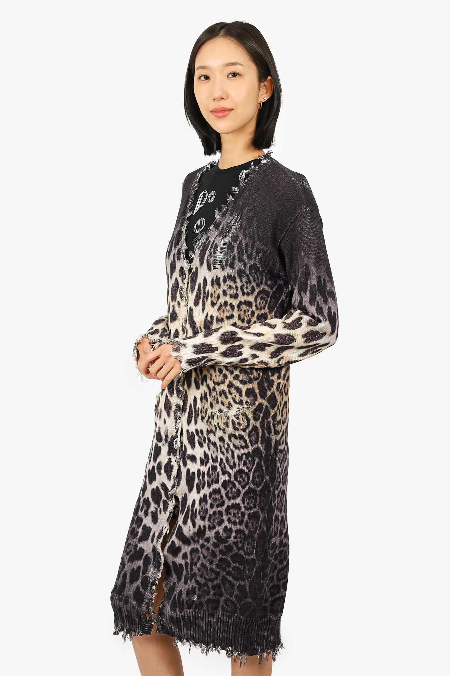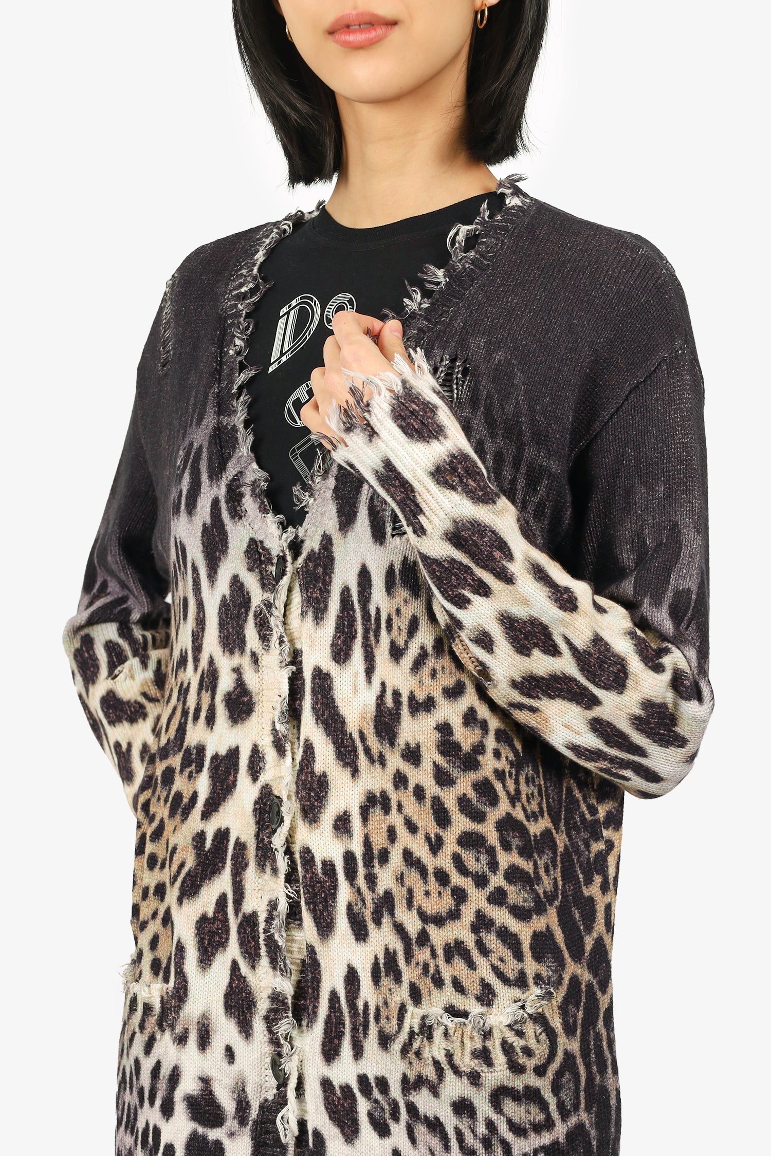 Refresh availabilityR13 Faded Leopard Distressed Knit Long Cardigan. V-neckline. Front button-up closure. Distressed throughout. Frayed hem. Tonal stitching.
