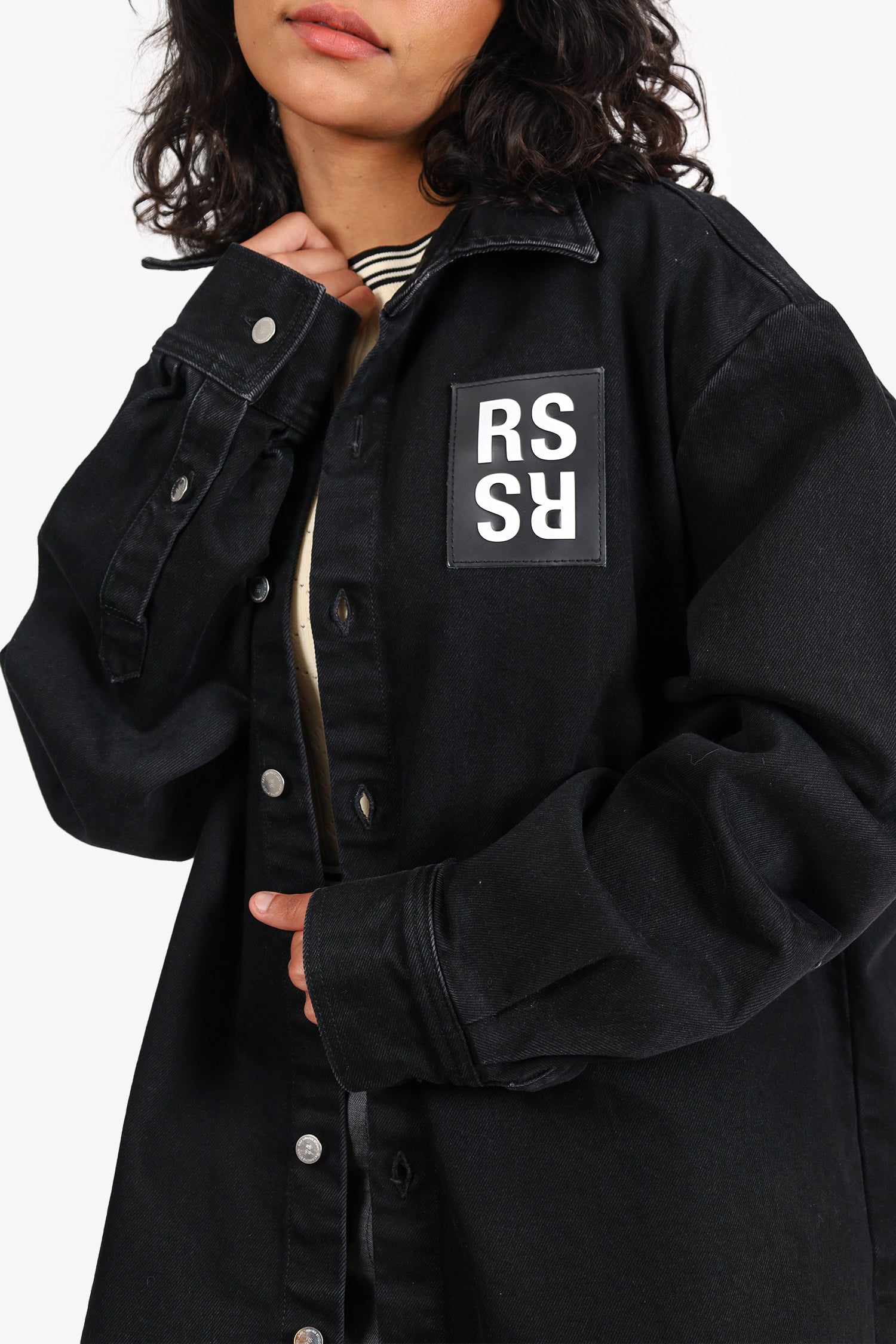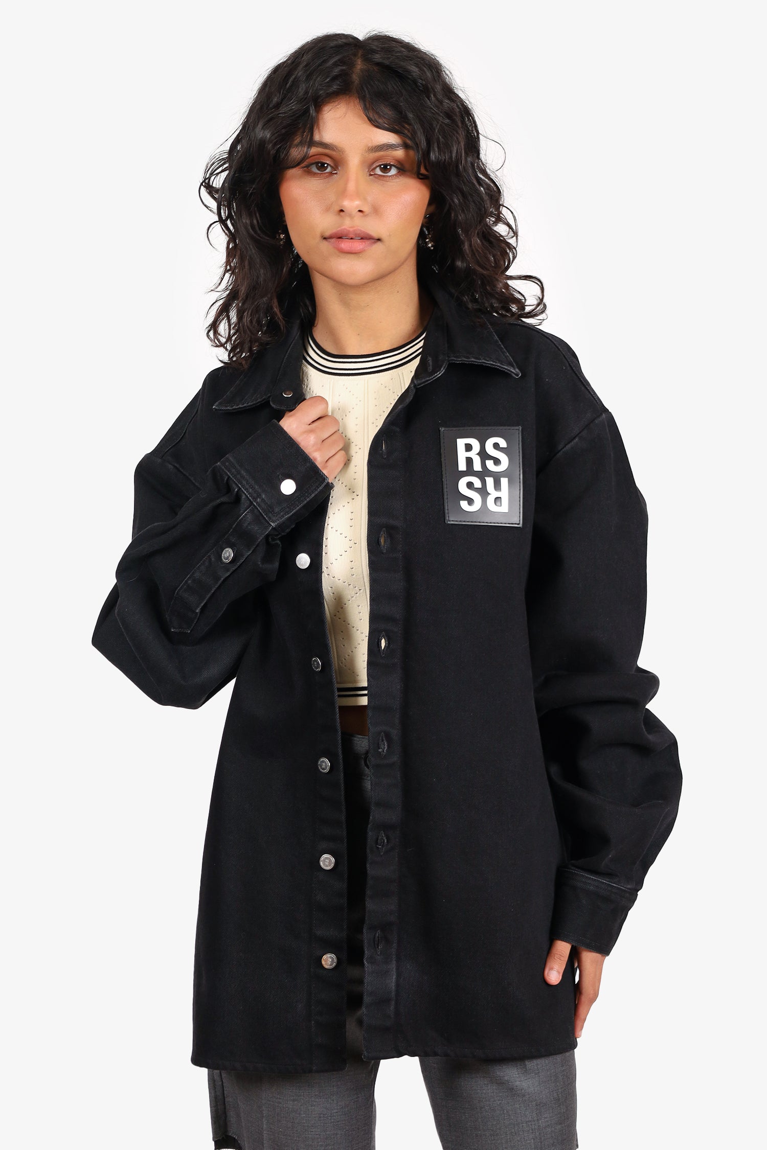 Refresh availabilityRaf Simons Black Denim Logo Patched Shirt. Pull-on. Collared-neckline. Front button-up closure. Sleeve cuffs with button-up closure. Silver-tone hardware. Tonal stitching.