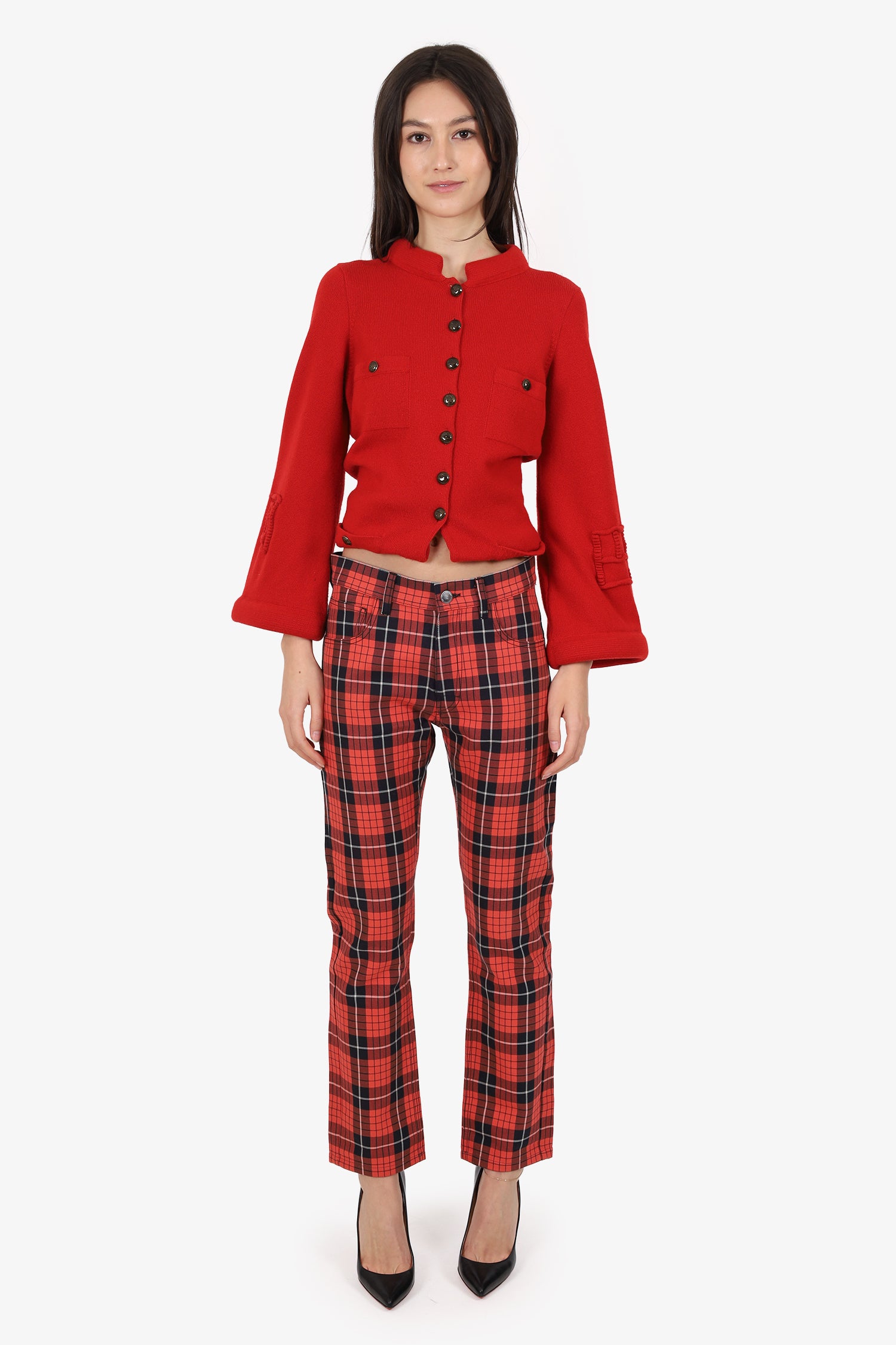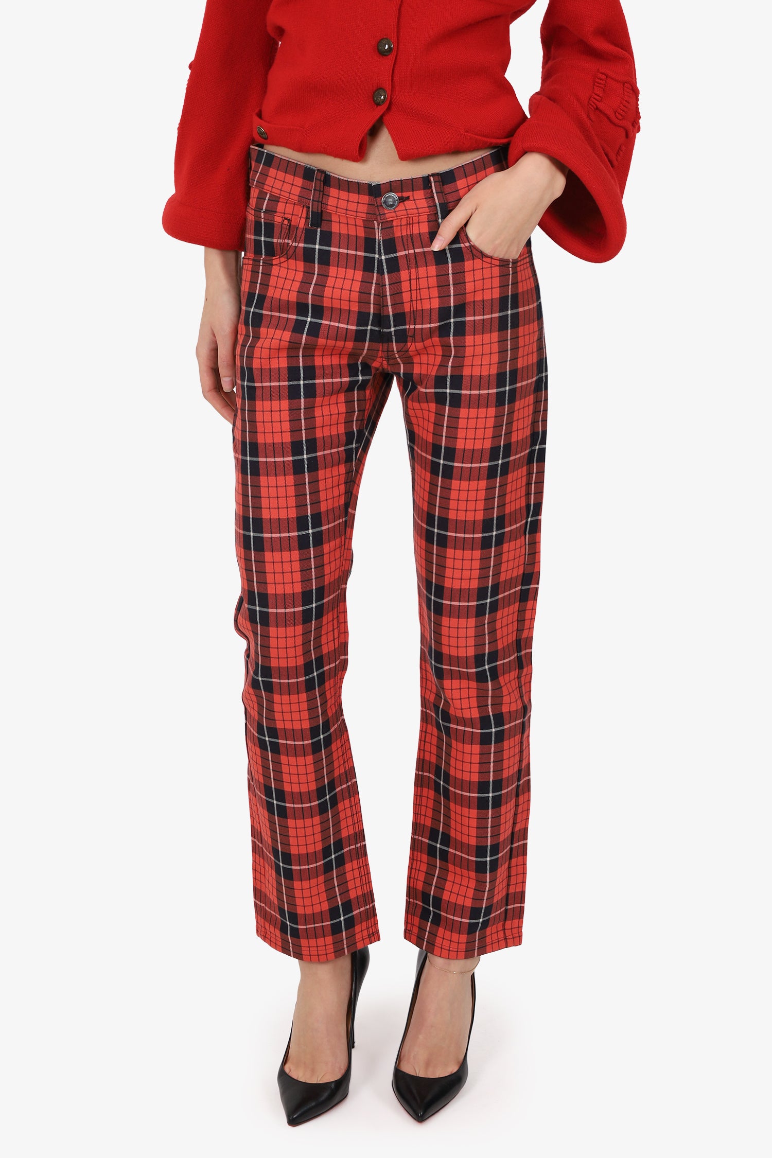Refresh availabilityRaf Simons SS18 Red Check Classic Tartan Jeans. Slip on. Front zip with button-up closure. Waistband belt-loops. 5 exterior pockets; 2 front slip, 1 mini compartment, and 2 rear slip. Silver-tone hardware. Tonal stitching.