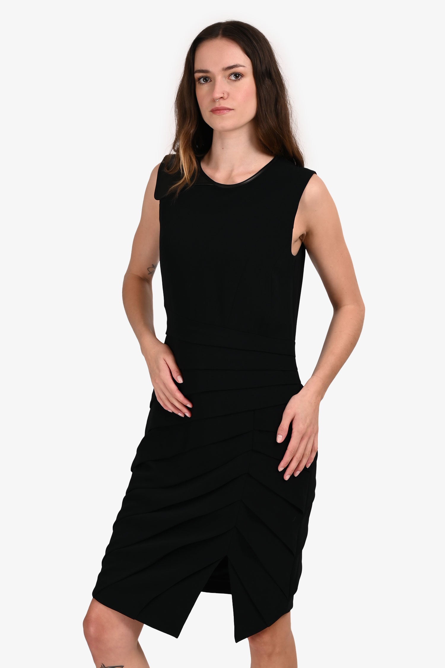 Refresh availabilityRag & Bone Black Leather Trimmed Midi Dress. Slip-on. Round neckline. Rear zipper closure. Leather shoulder detailing. Side slit. Lined interior. Gold-tone hardware. Tonal stitching.
