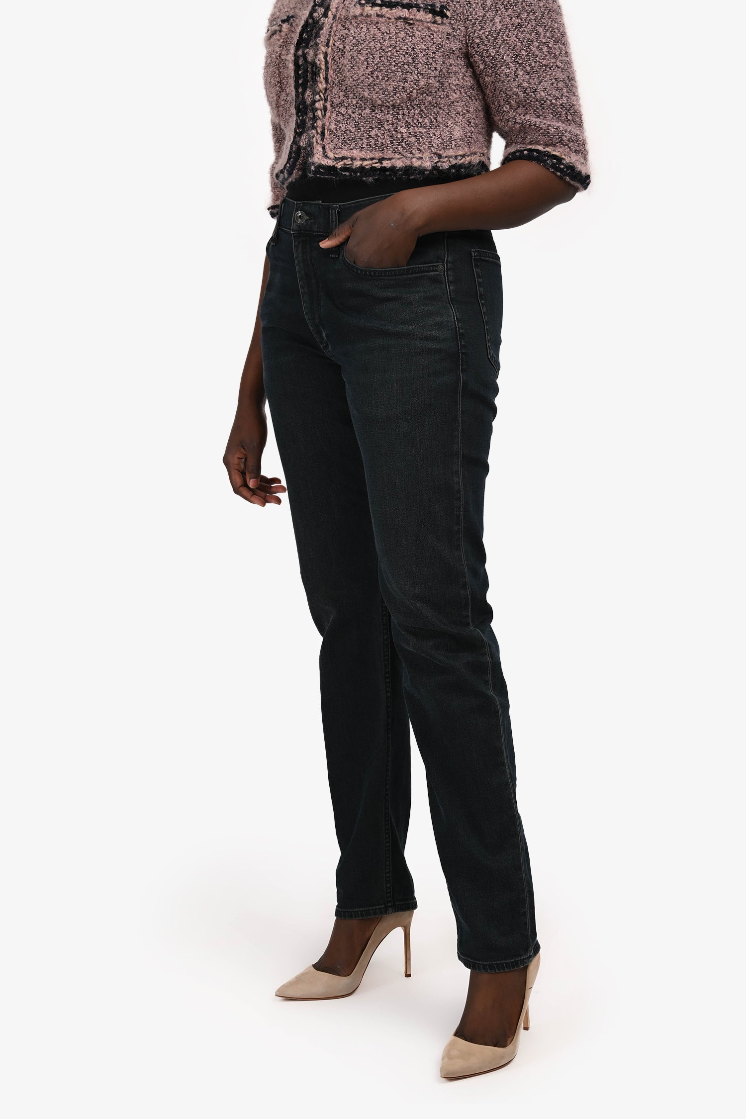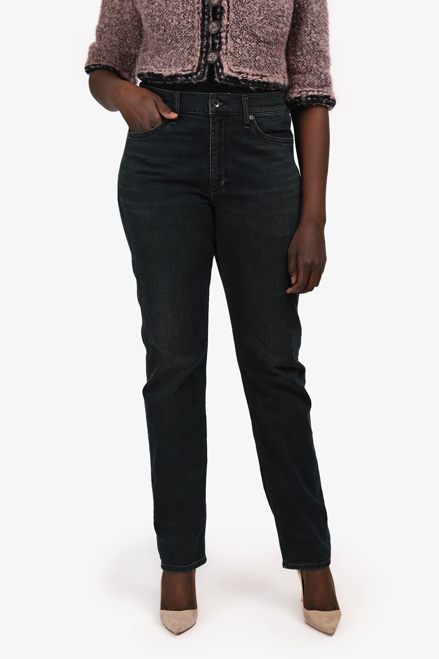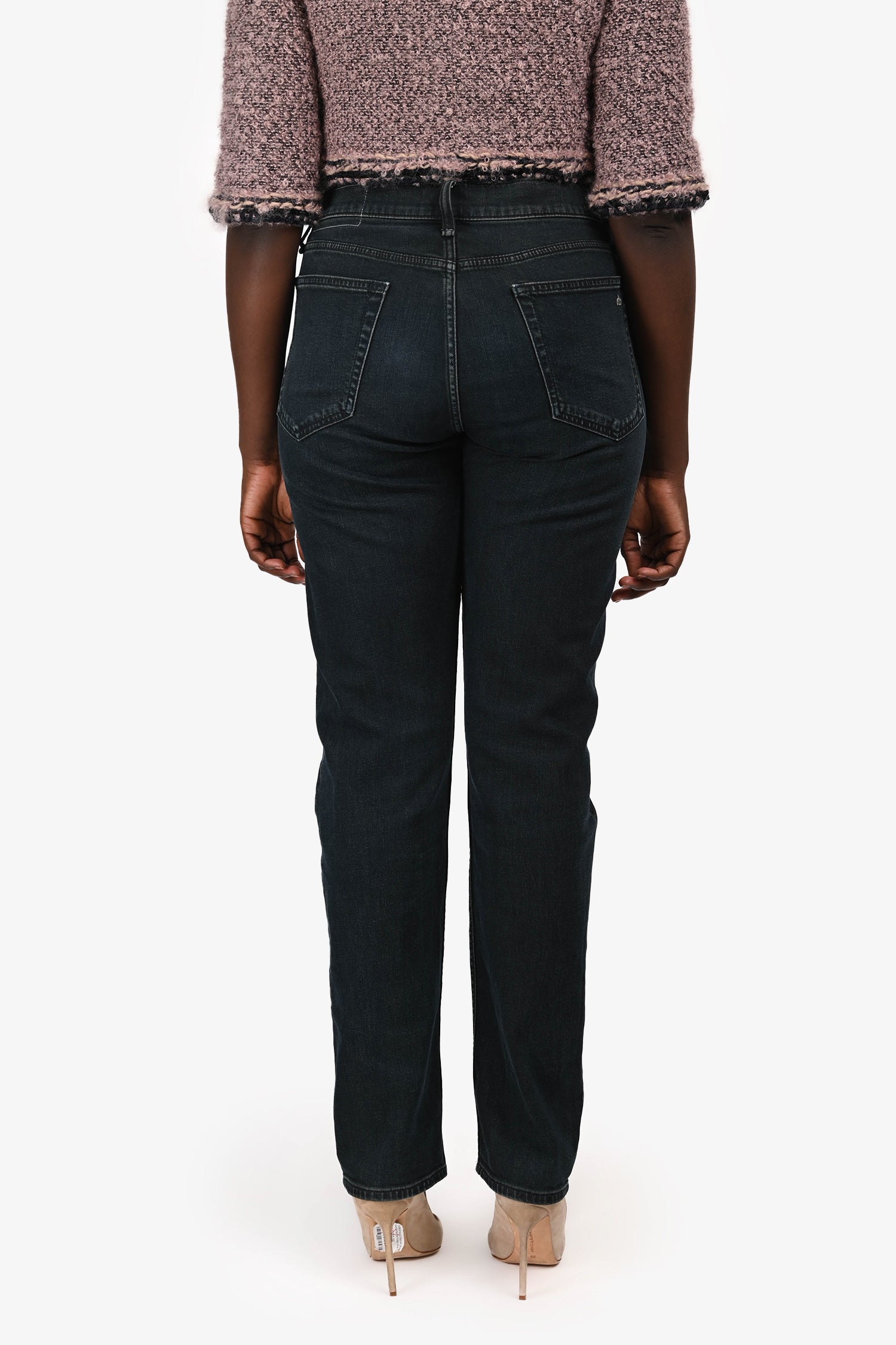 Refresh availabilityRag & Bone Dark Wash Slim Fit Jeans. Slip-on. Front zip with button closure. Waistband belt loops. 5 exterior pockets; 2 side slip and 1 mini compartment, 2 rear slip. Silver-tone hardware. Contrast stitching.