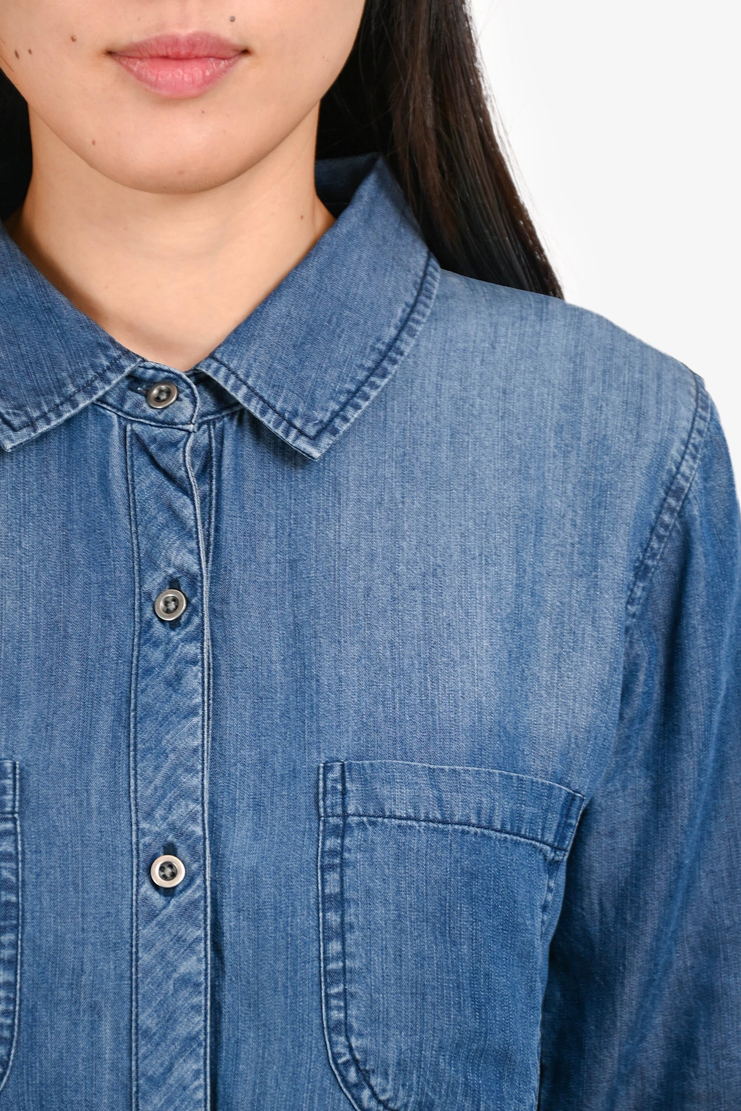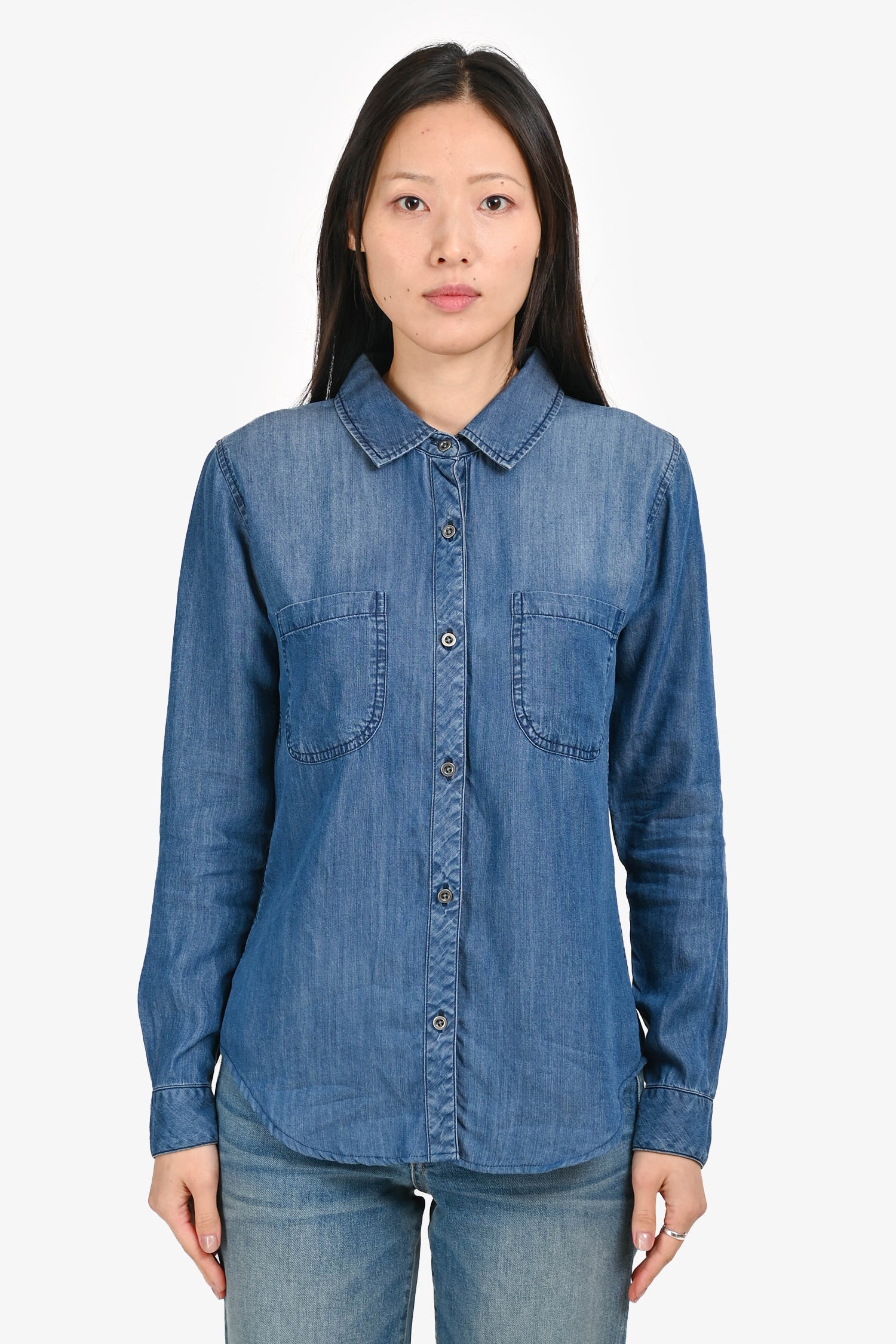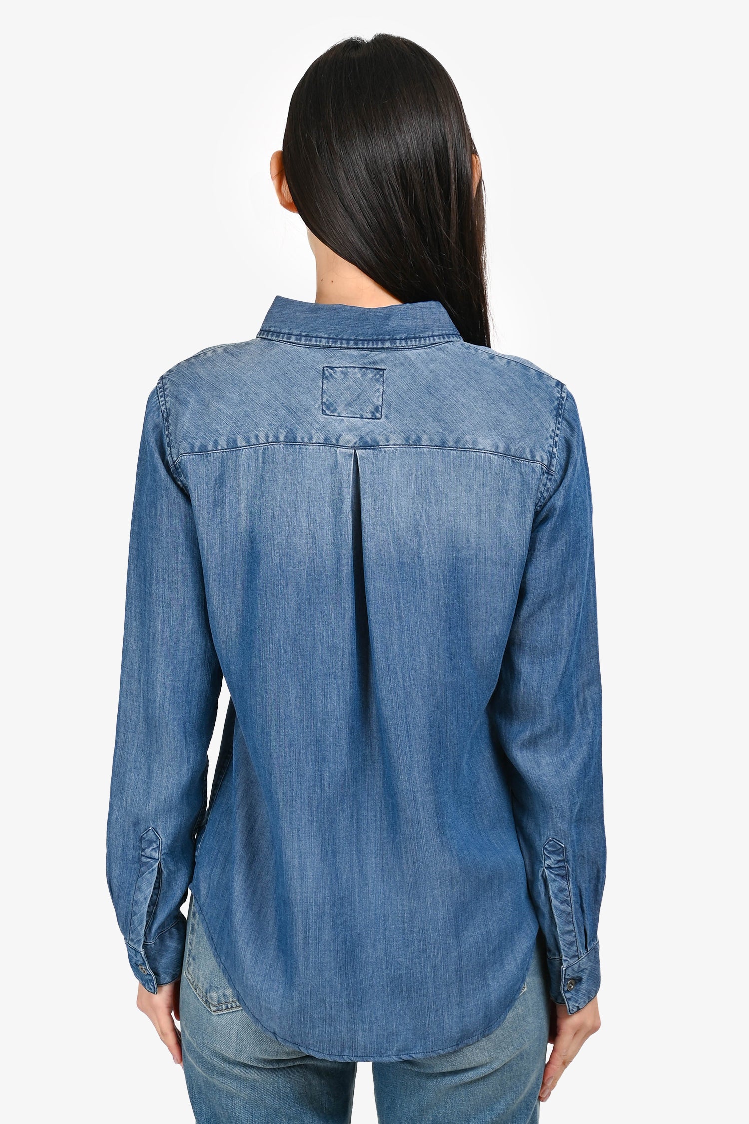 Refresh availabilityRails Blue Denim Button Up Top. 2 patch pockets. Pleating and button detailing on the cuffs. Tonal stitching.