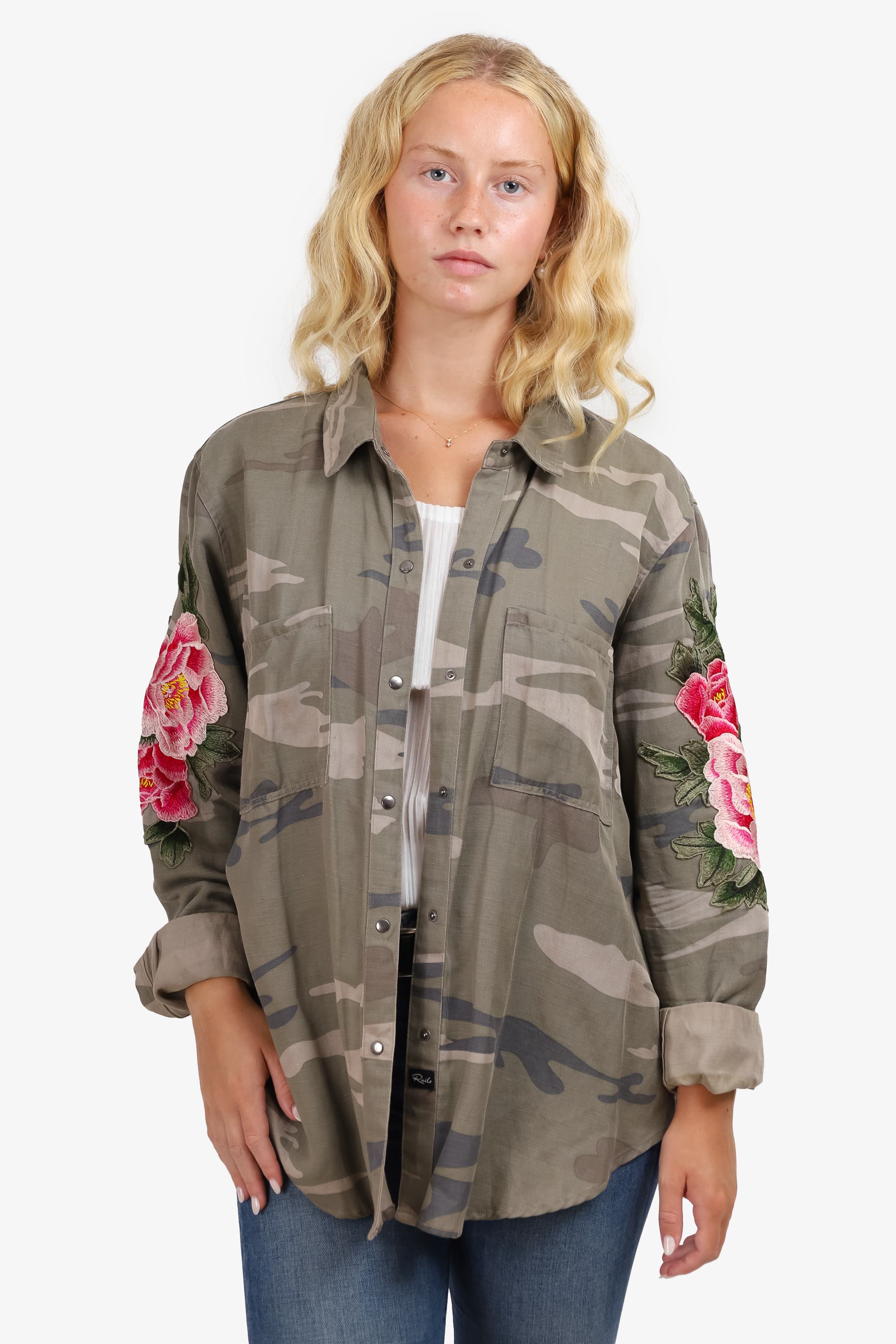 Refresh availabilityRails Sage Camo Marcel Button Down with Floral Embroidery. Collared neckline. Front snap button closure. 2 front slip pockets. Tonal stitching.