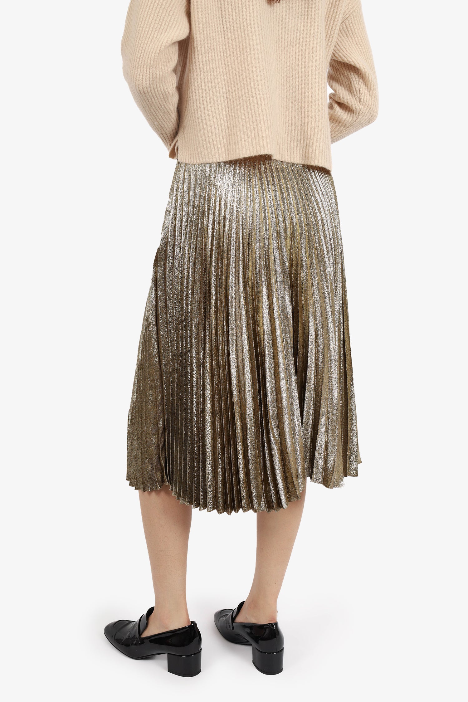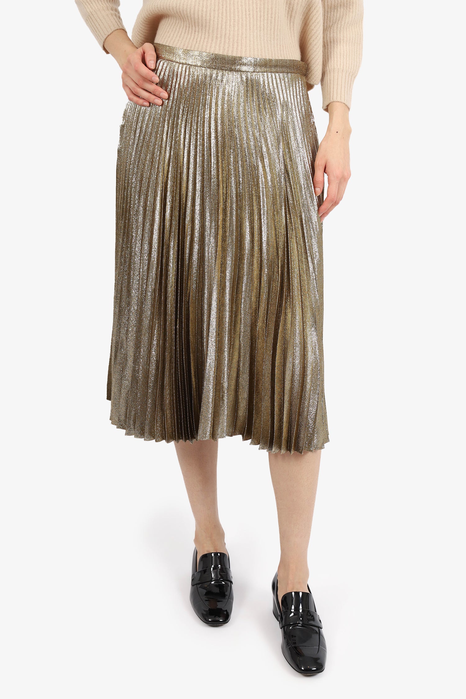 Refresh availabilityRalph Lauren Purple Label Gold Pleated Midi Skirt. Side zip closure. Lined. Tonal stitching.