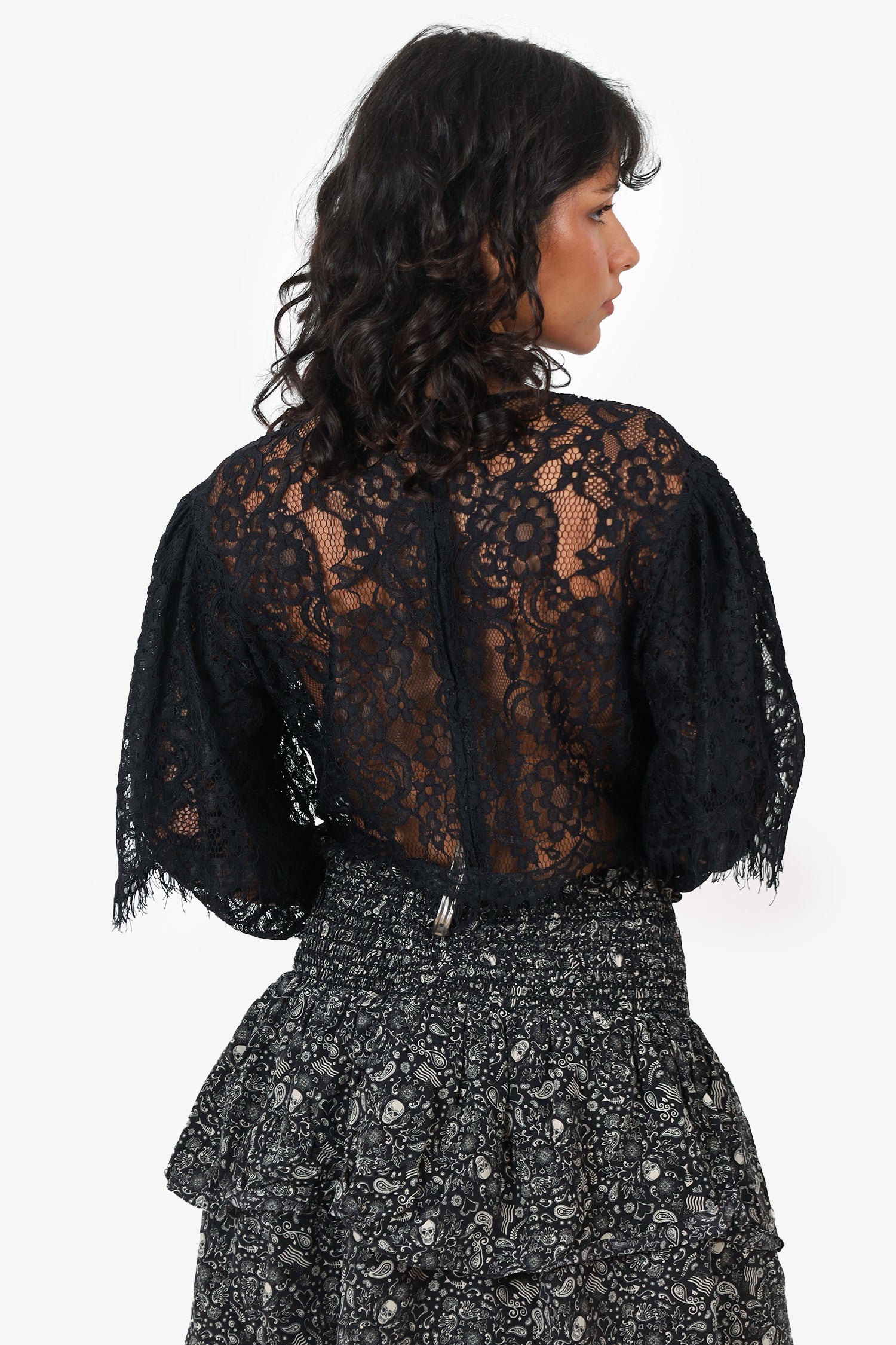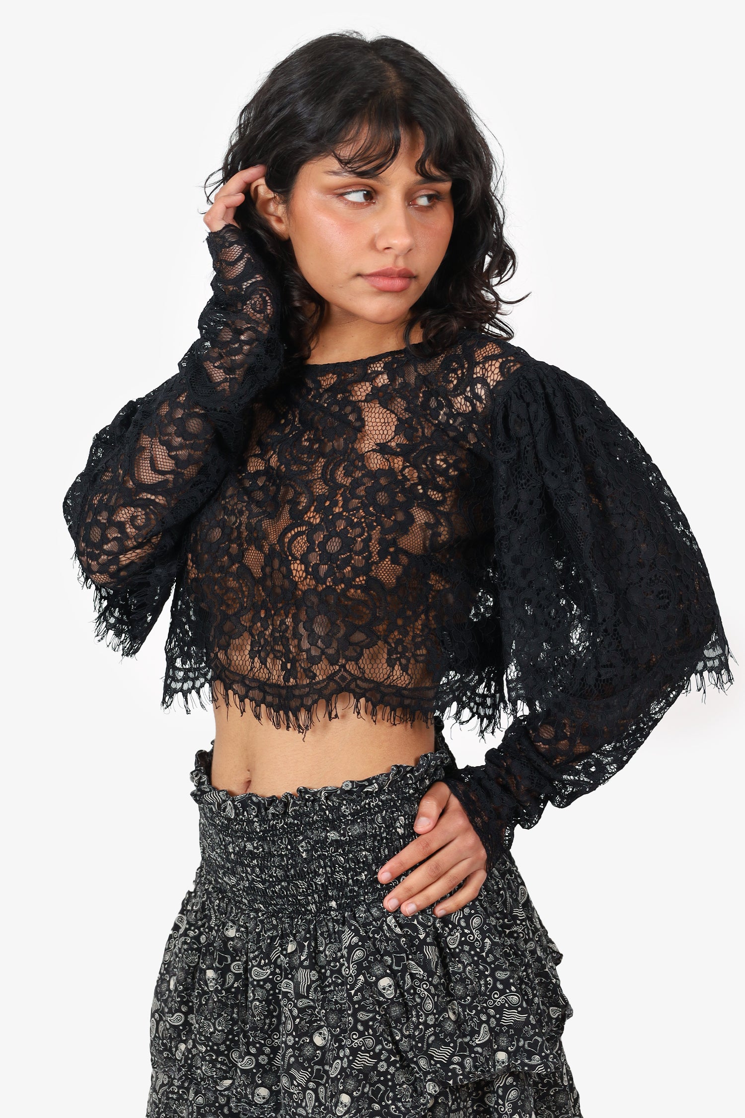 Refresh availabilityRasario Black Lace Long Sleeve Ruffle Detail Top. Pull-on. Round neckline. Rear zip closure. Semi-sheer body. Tonal stitching.