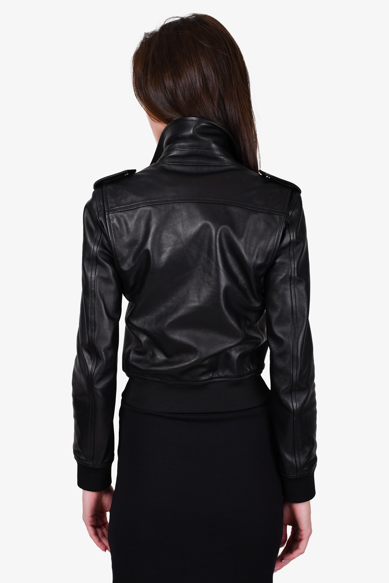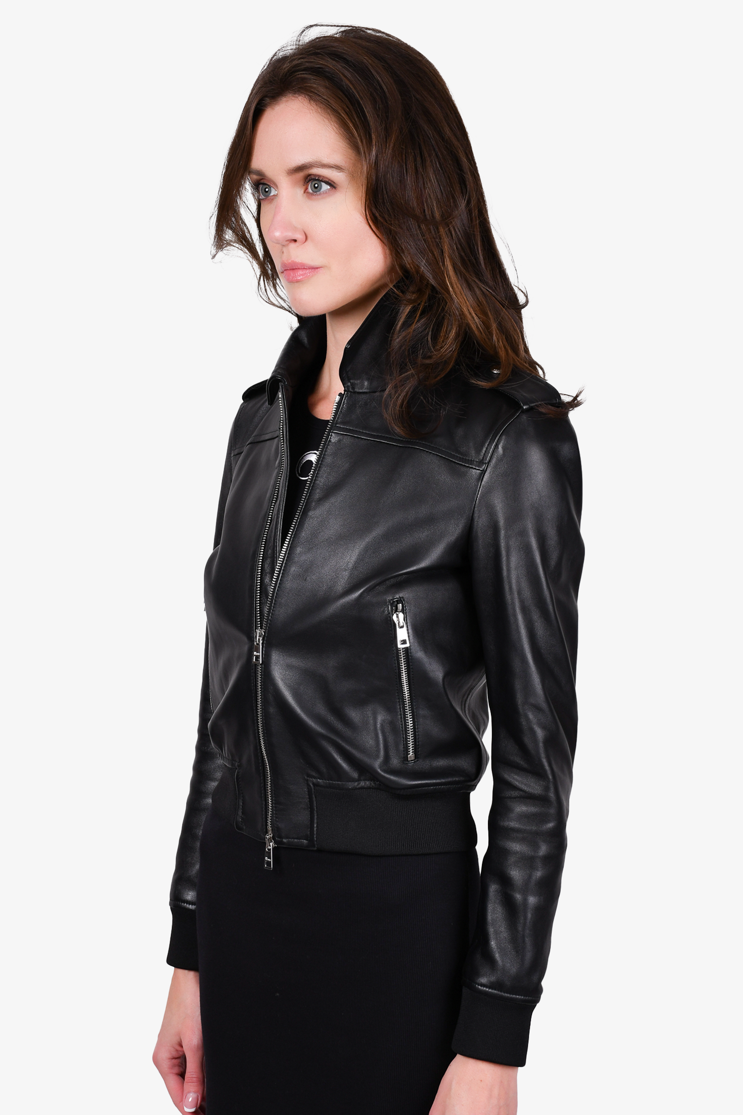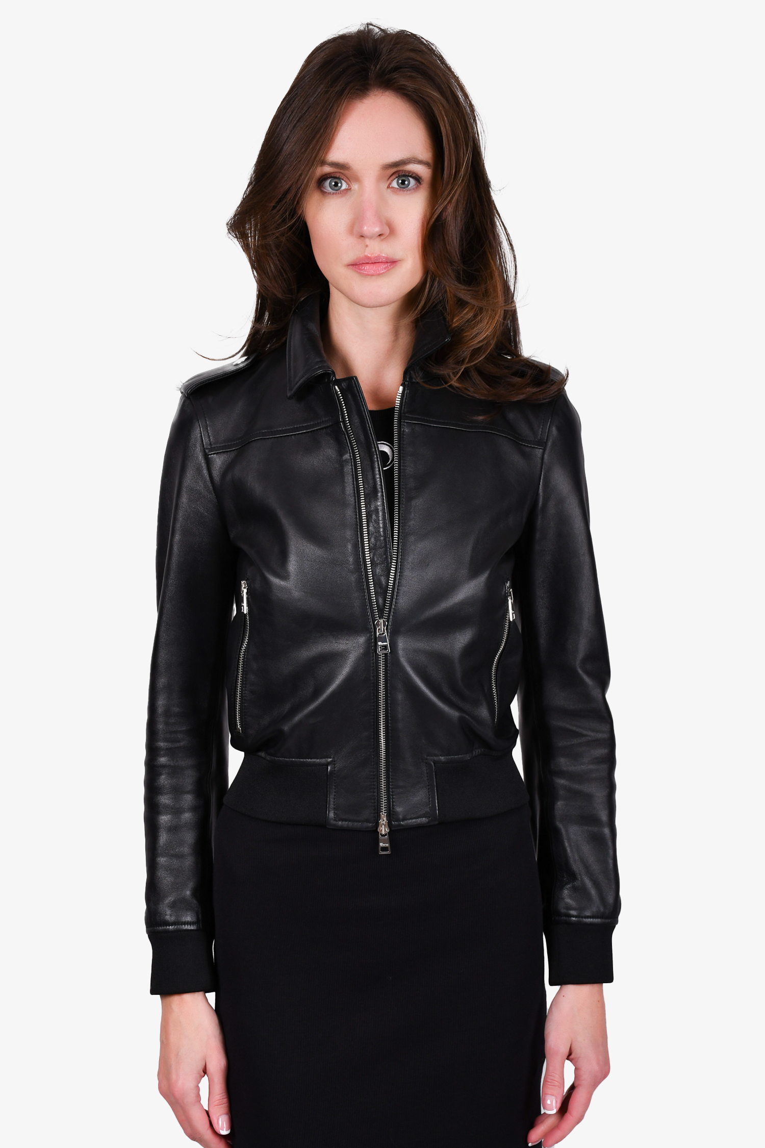 Red Valentino Black Leather Bomber Jacket. Front two-way zip closure. Front zip pockets. Ribbed and hem cuffs. Tonal stitching.