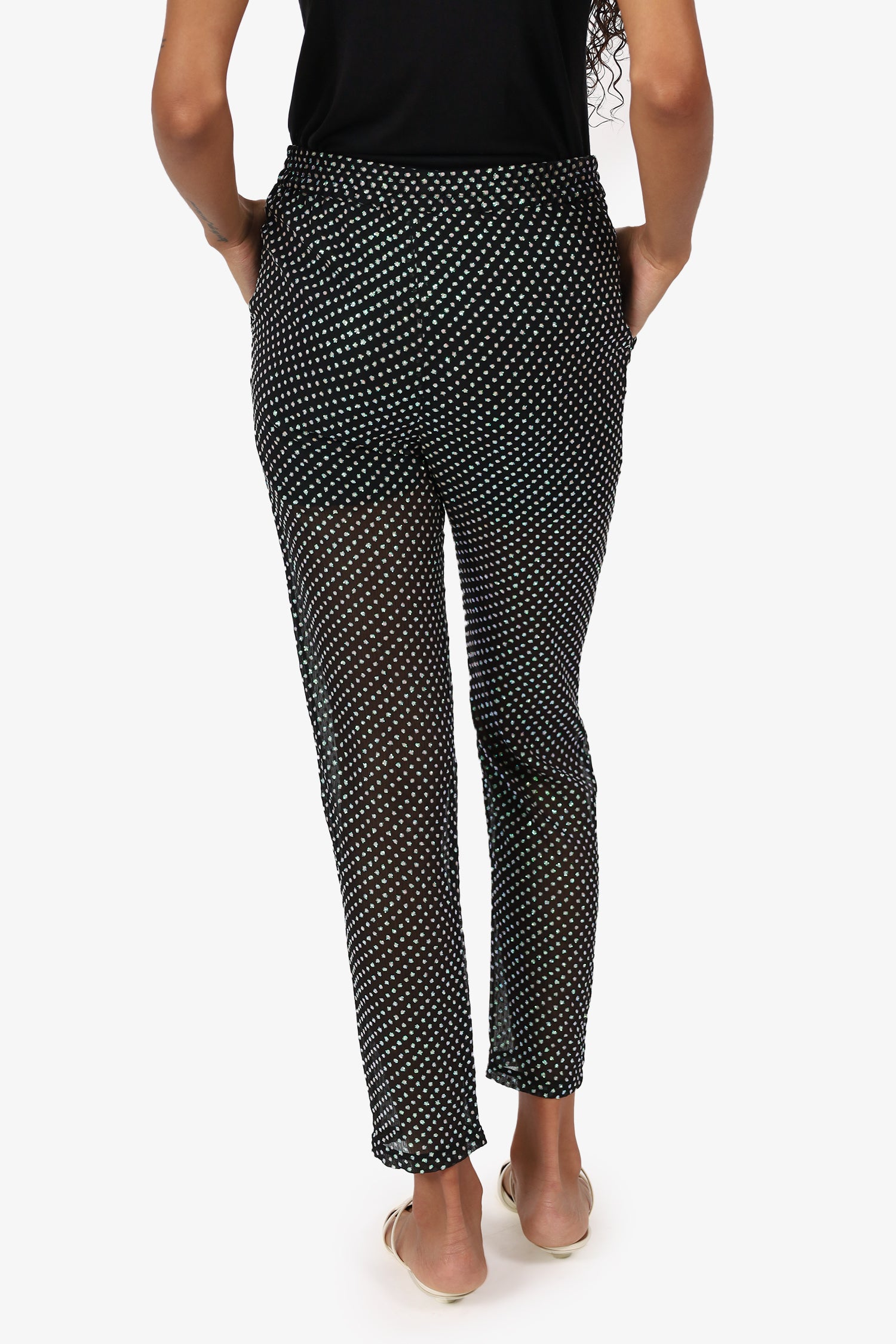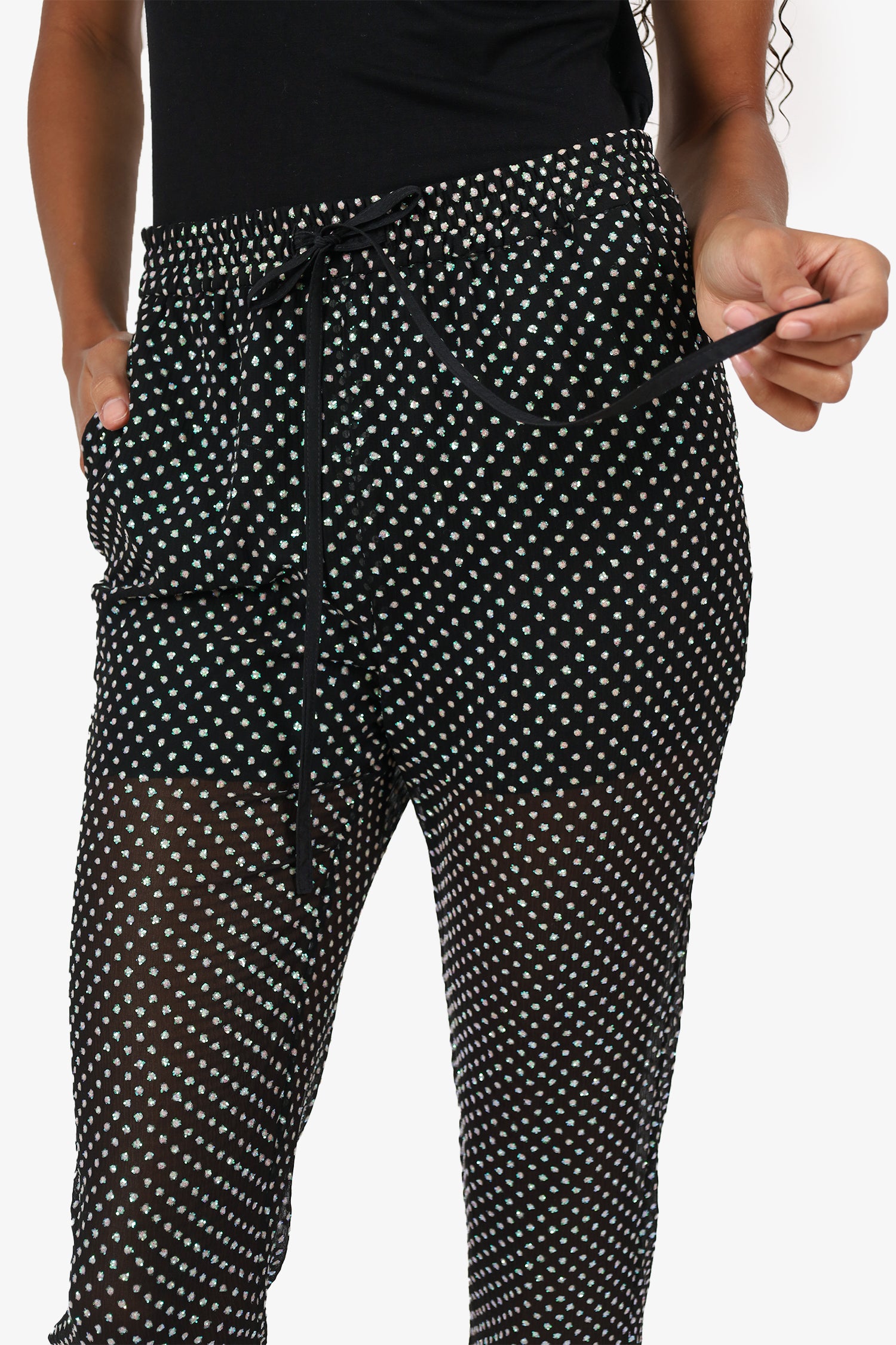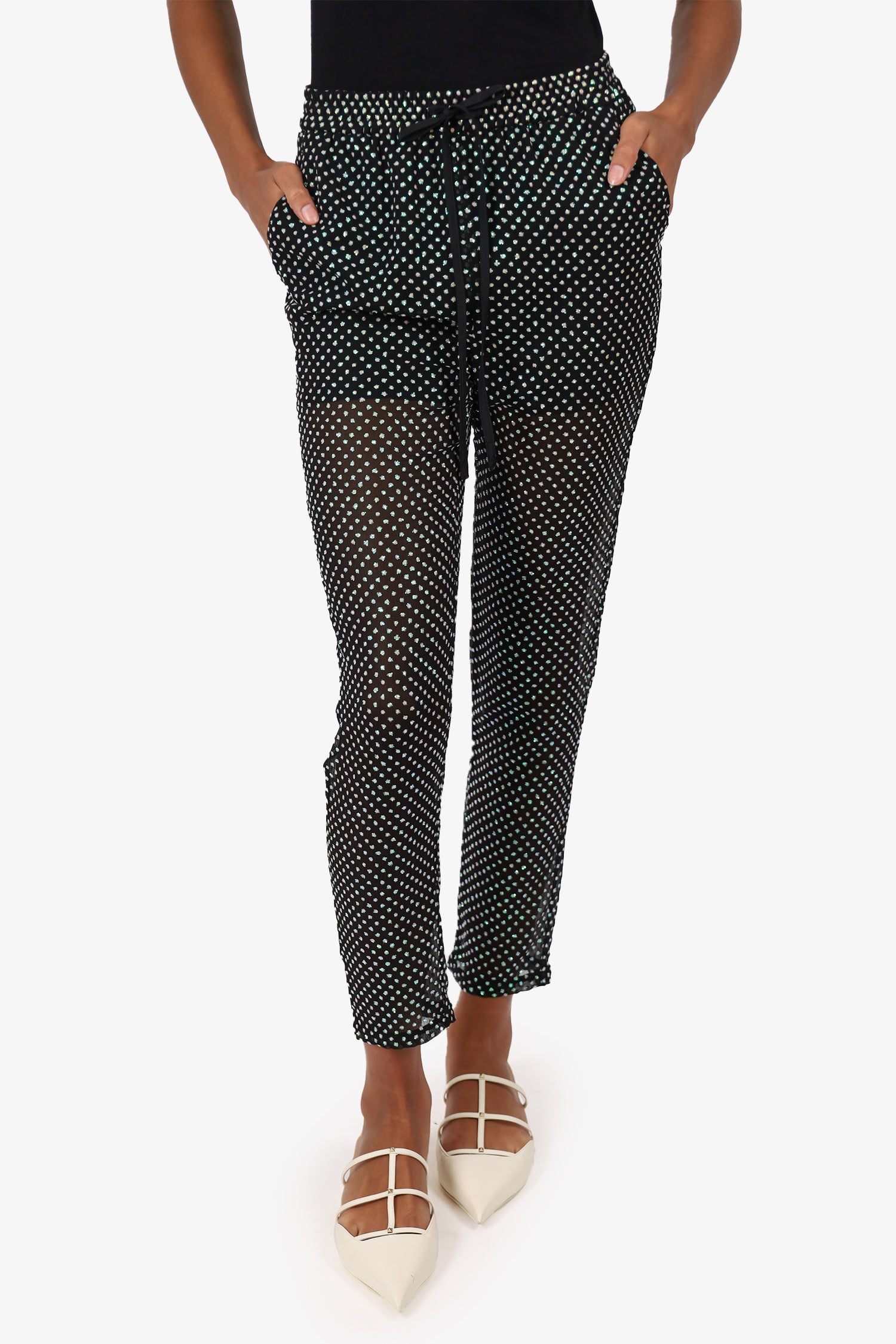 Refresh availabilityRed Valentino Black Sheer Rhinestone Embellished Drawstring Trousers. Slip-on. Elasticated waistband with adjustable drawstring closure. 2 side slip pockets. Tonal stitching.