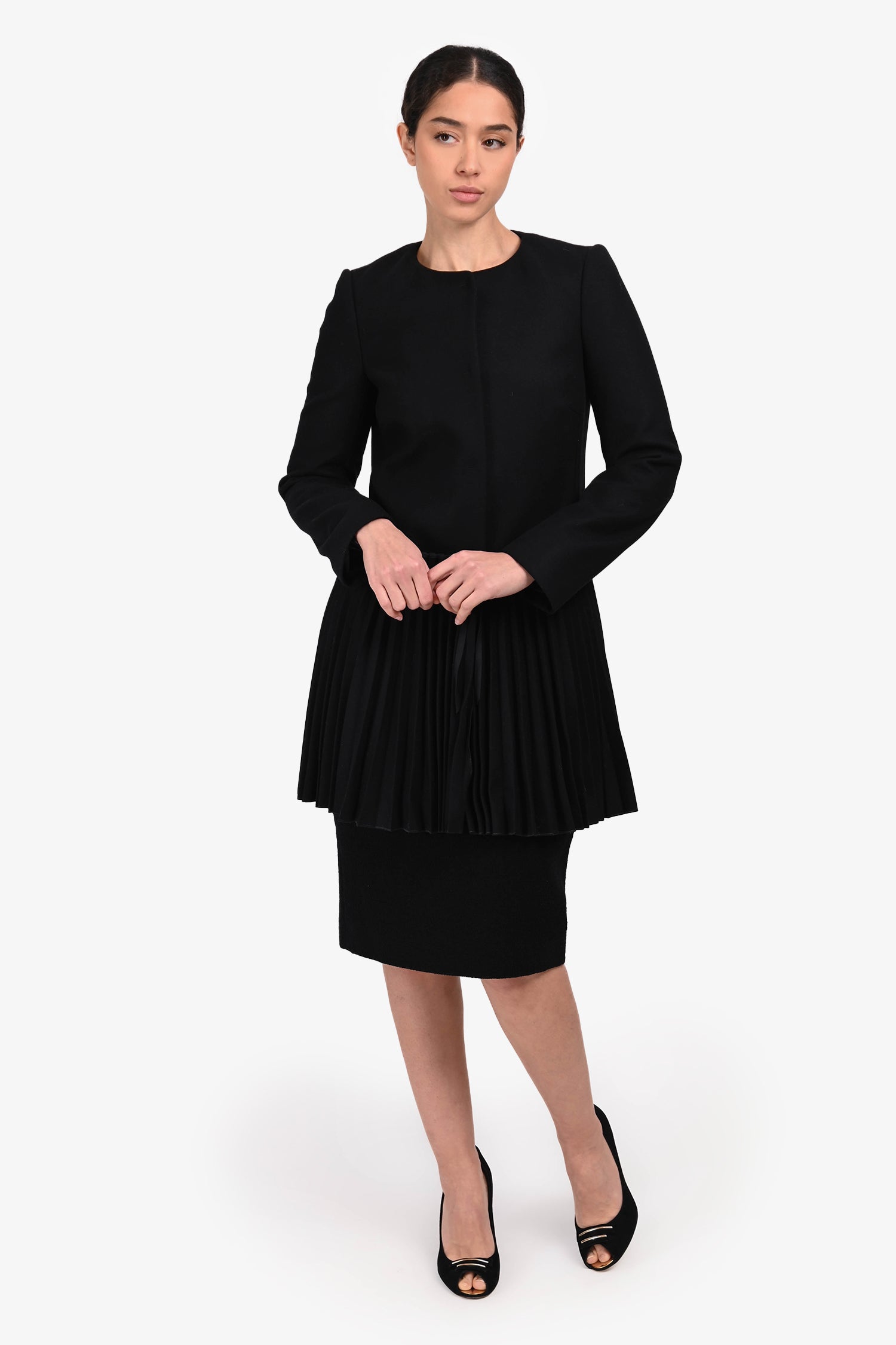 Refresh availabilityRed Valentino Black Wool Pleated-Bottom Coat. Collarless neckline. Front snap button closure. Long sleeves with clean-finished cuffs. Defined waist. Pleated detailing at the lower hem. Lined bodice. Silver-tone hardware. Tonal stitching.