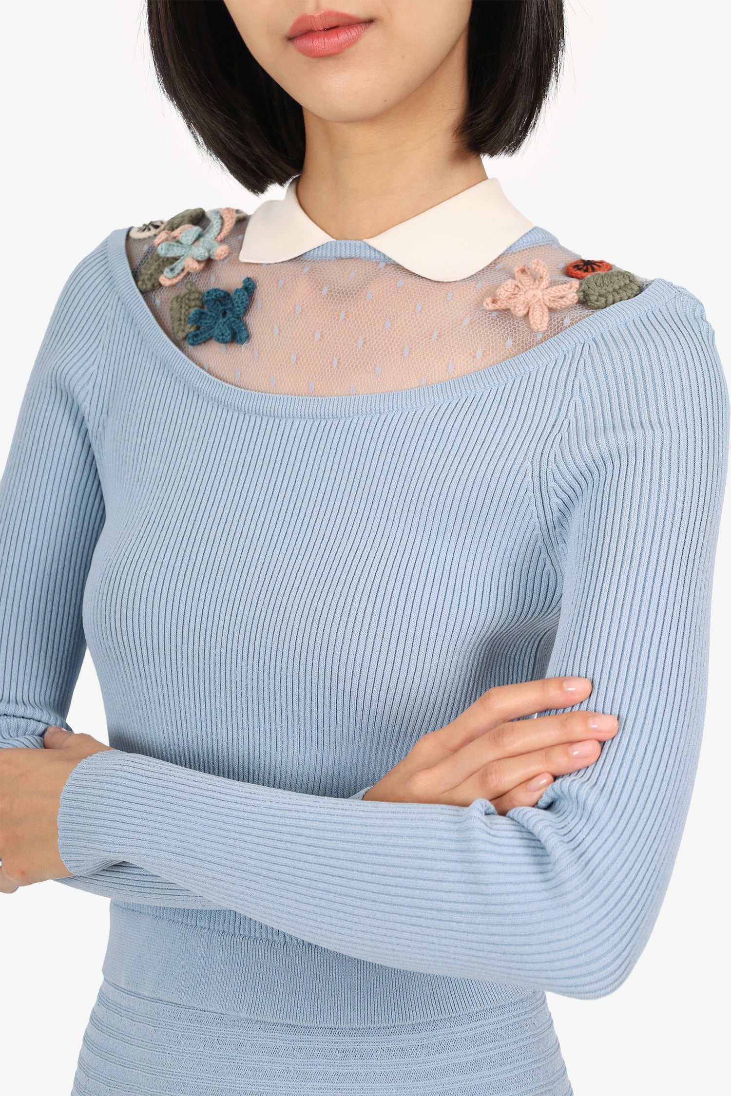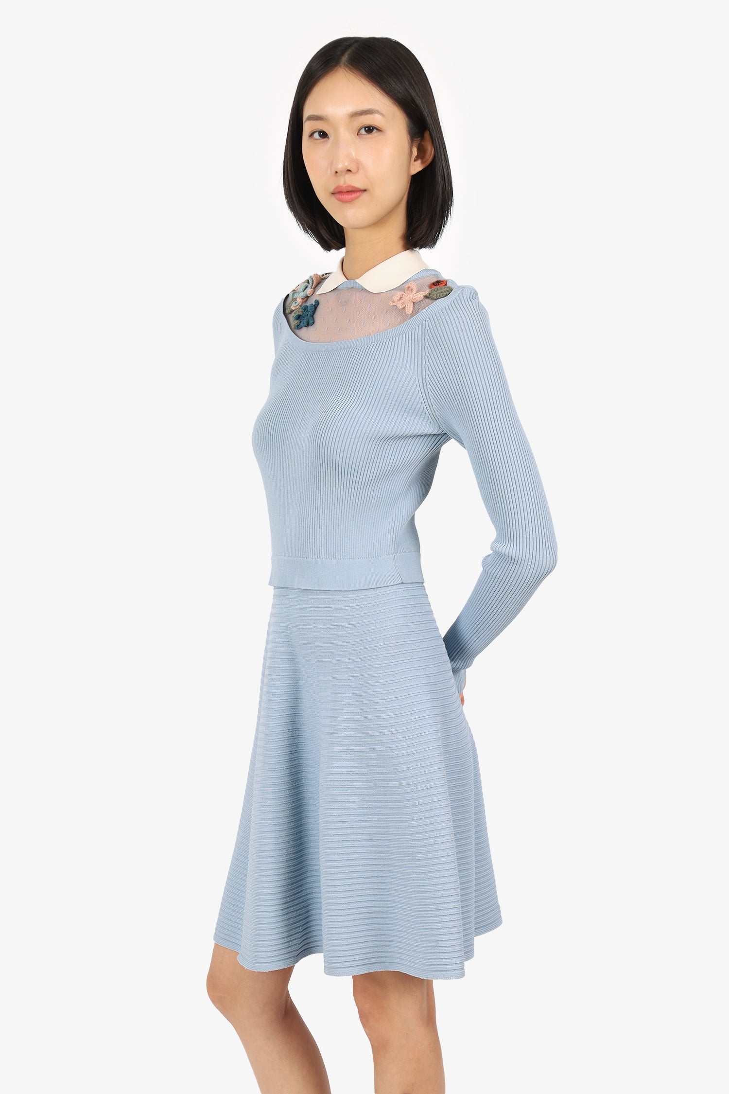 Refresh availabilityRed Valentino Blue Ribbed Dress With Floral Embroidery. Slip-on. Collared-neckline. Rear zip closure. Mesh panel with floral embroidery at neckline. Tonal stitching.