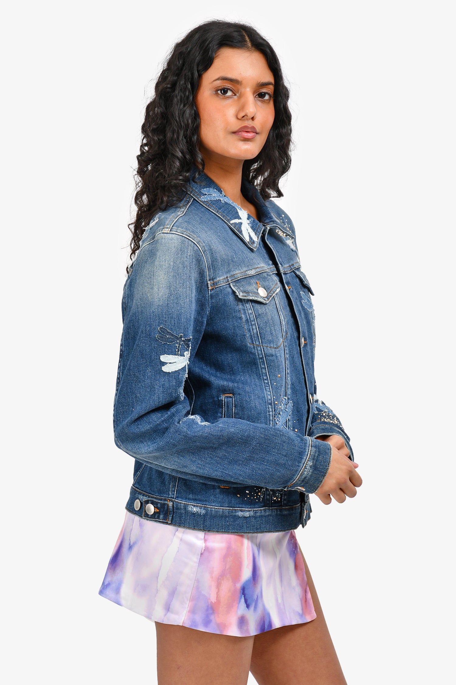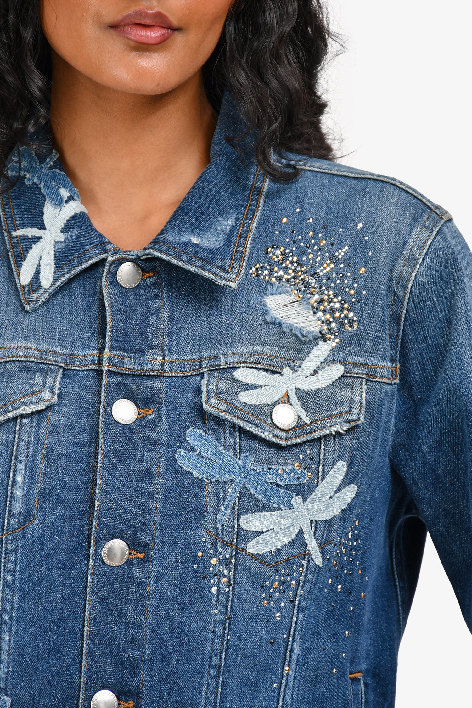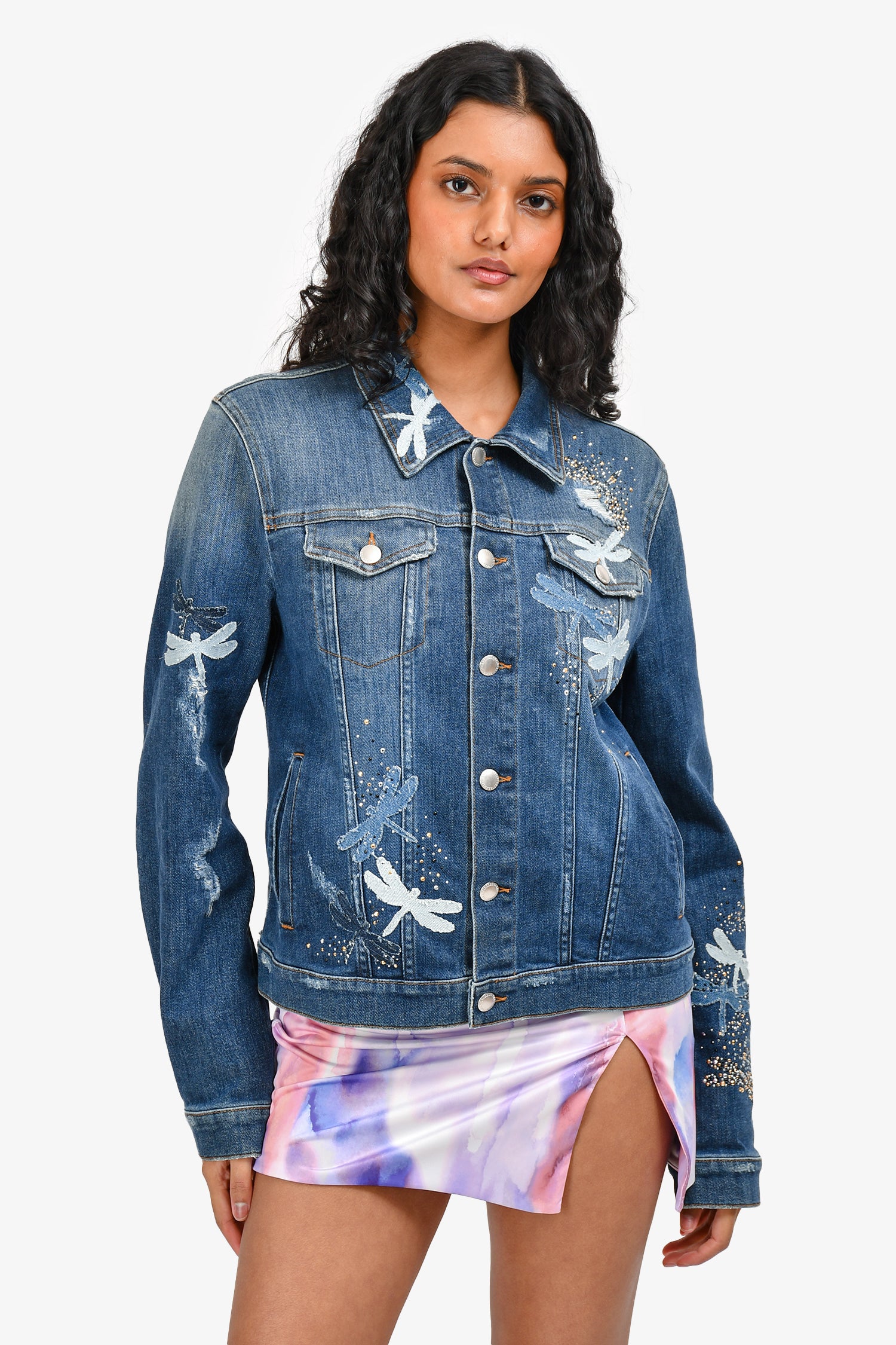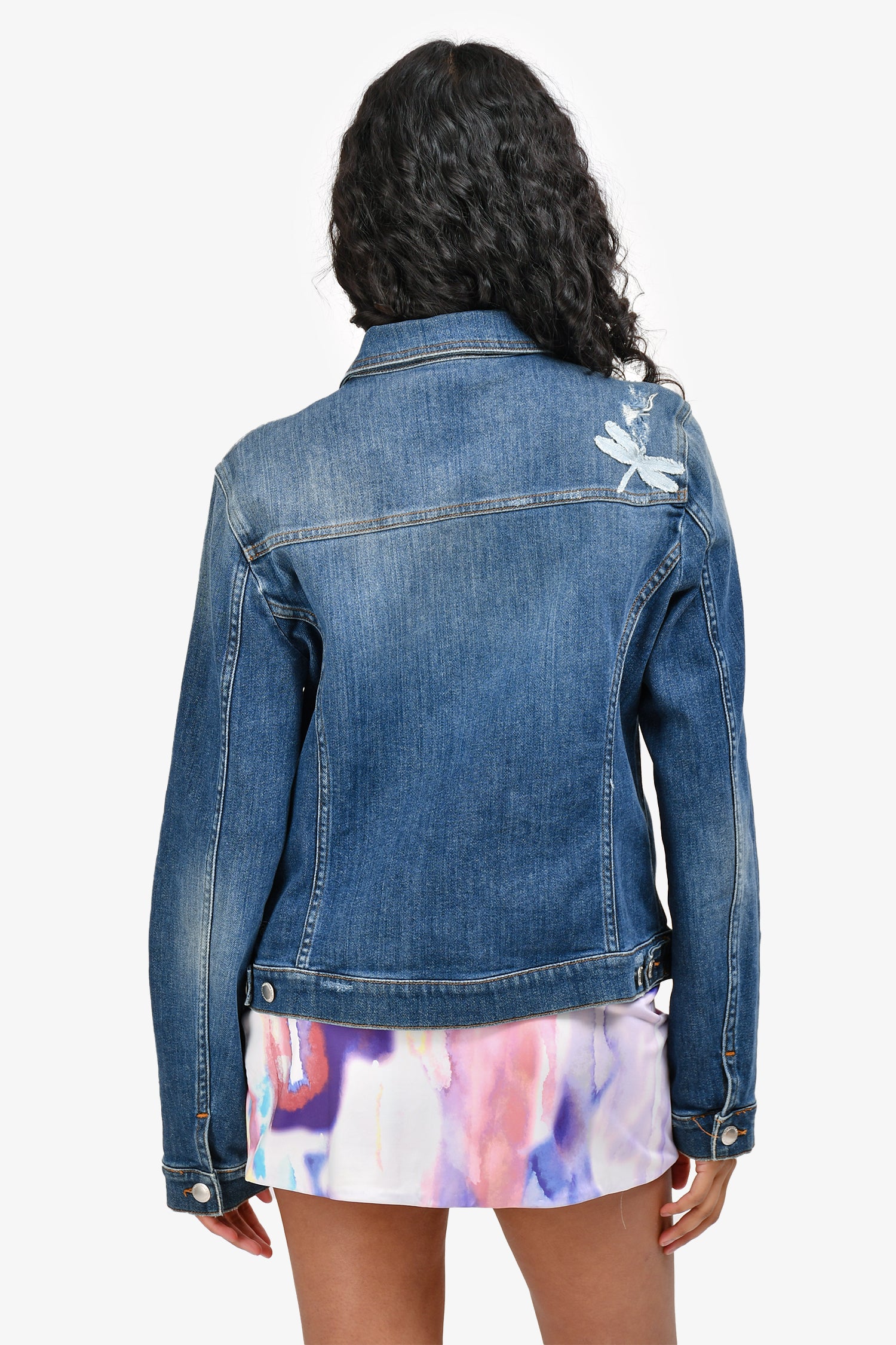 Red Valentino Blue Studded Embroidered Denim Jacket. Front button-down closure. 2 front pockets with fold-over flaps and button closure. 2 side slip pockets. Button closure at sleeve-cuffs. Crystal studs and embroidery throughout. Intentional distressing. Unlined. Silver-toned hardware. Contrast stitching.