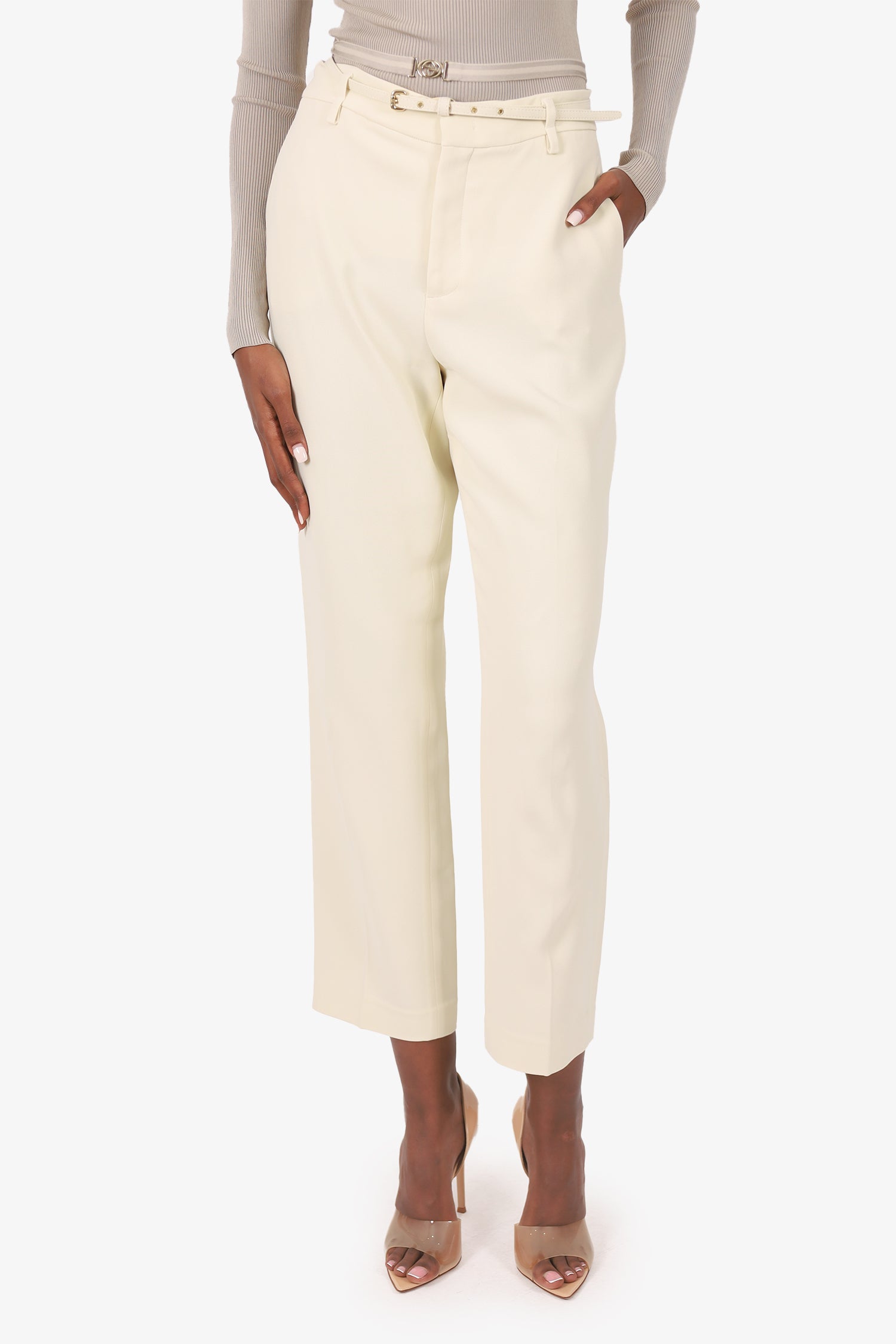 Refresh availabilityRed Valentino Cream Belted Trousers. Slip on. Slip on. Front zip with button-up and hook closures. Waistband belt-loops. 4 exterior slip pockets; 2 front, and 2 rear. Gold-tone hardware. Tonal stitching.