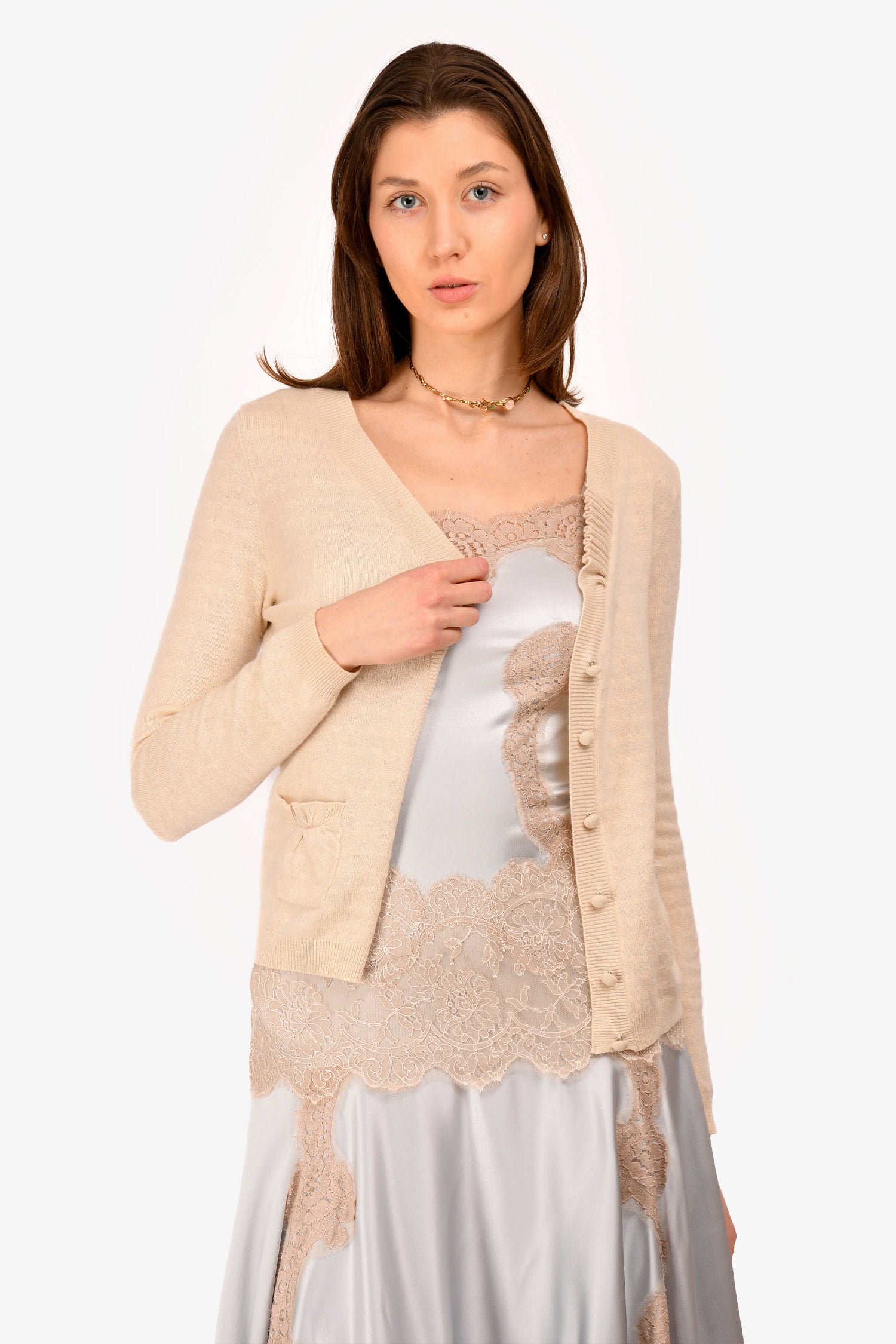 Refresh availabilityRed Valentino Cream Cashmere Blend Button Down Cardigan. Two front slip pockets. Front button closure. Tonal stitching.