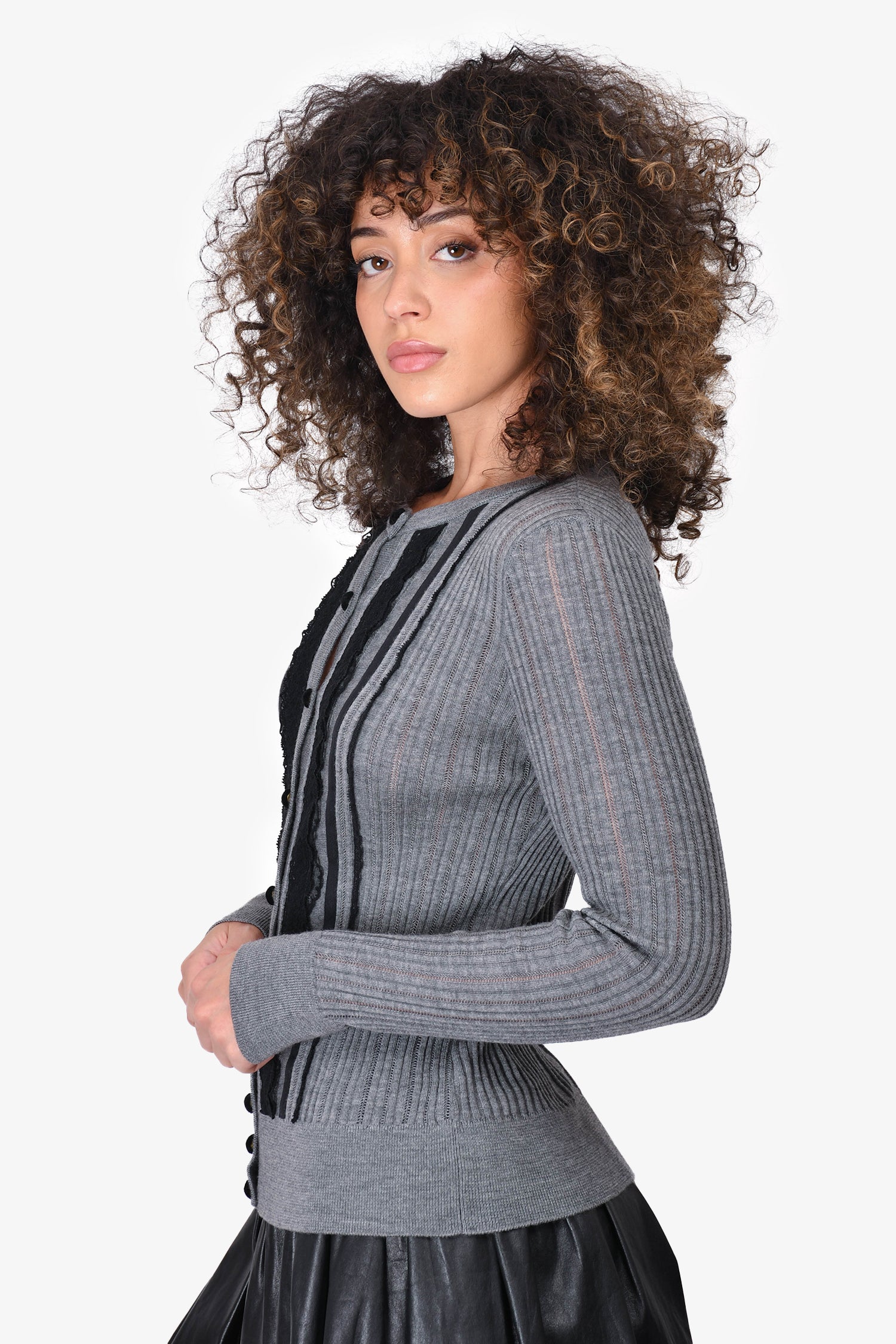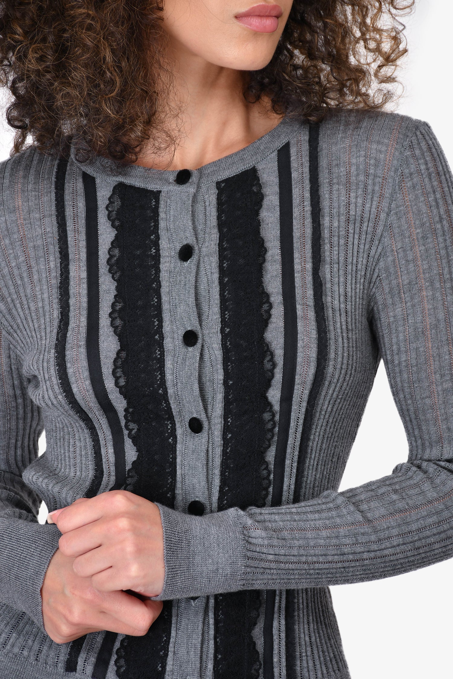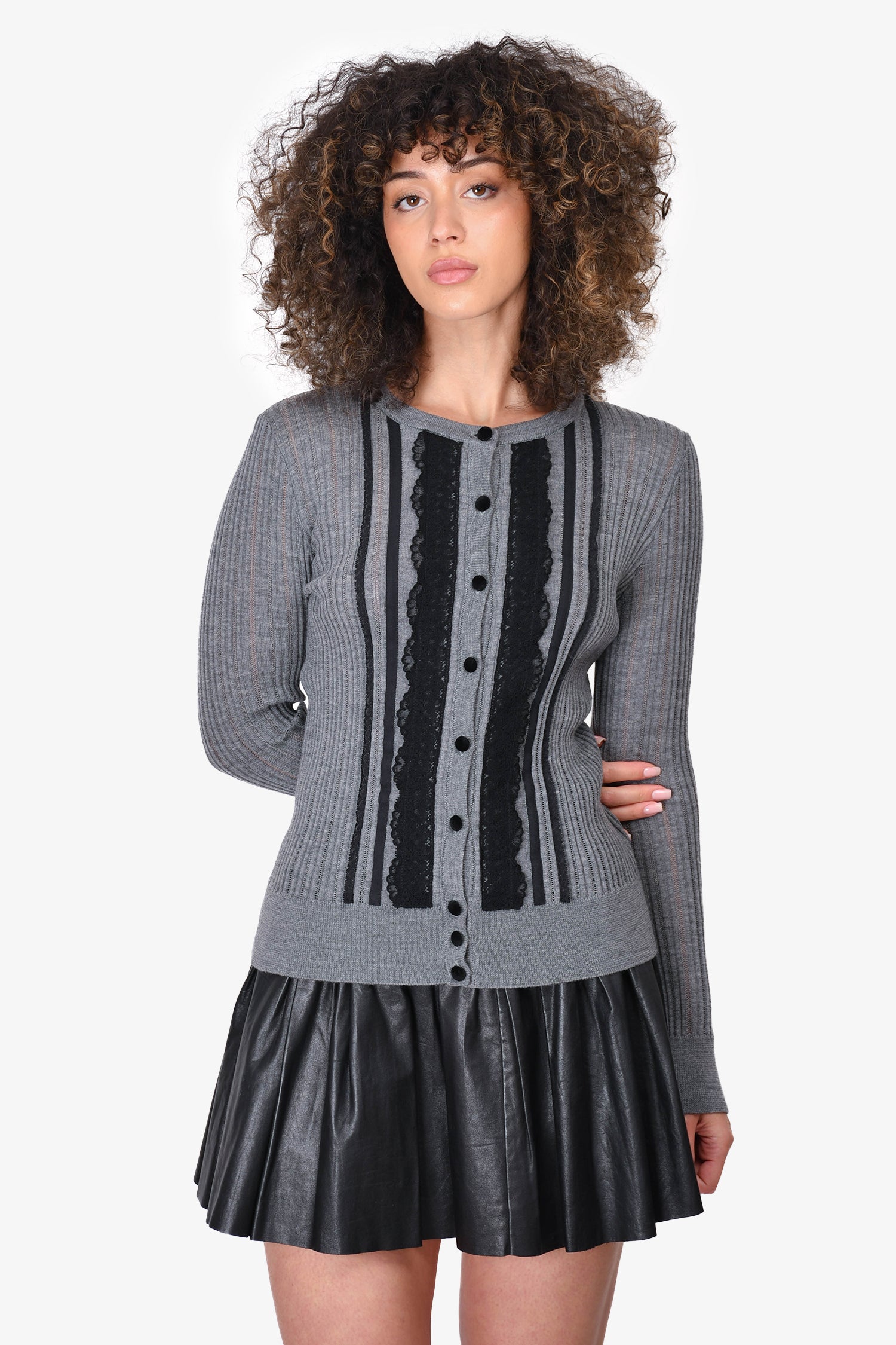 Refresh availabilityRed Valentino Grey & Black Wool Lace Cardigan. Velvet front button closure. Lace detailing down the front. Ribbed at the sleeve, hem and neckline. Some sheer areas. Tonal stitching.