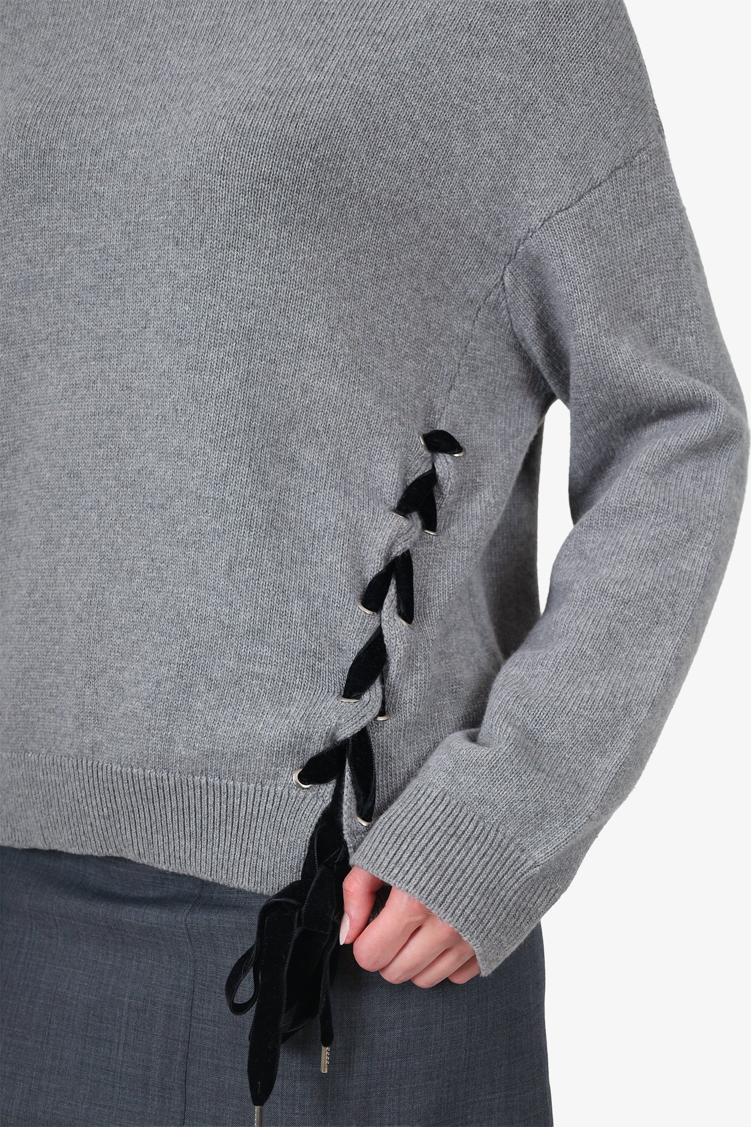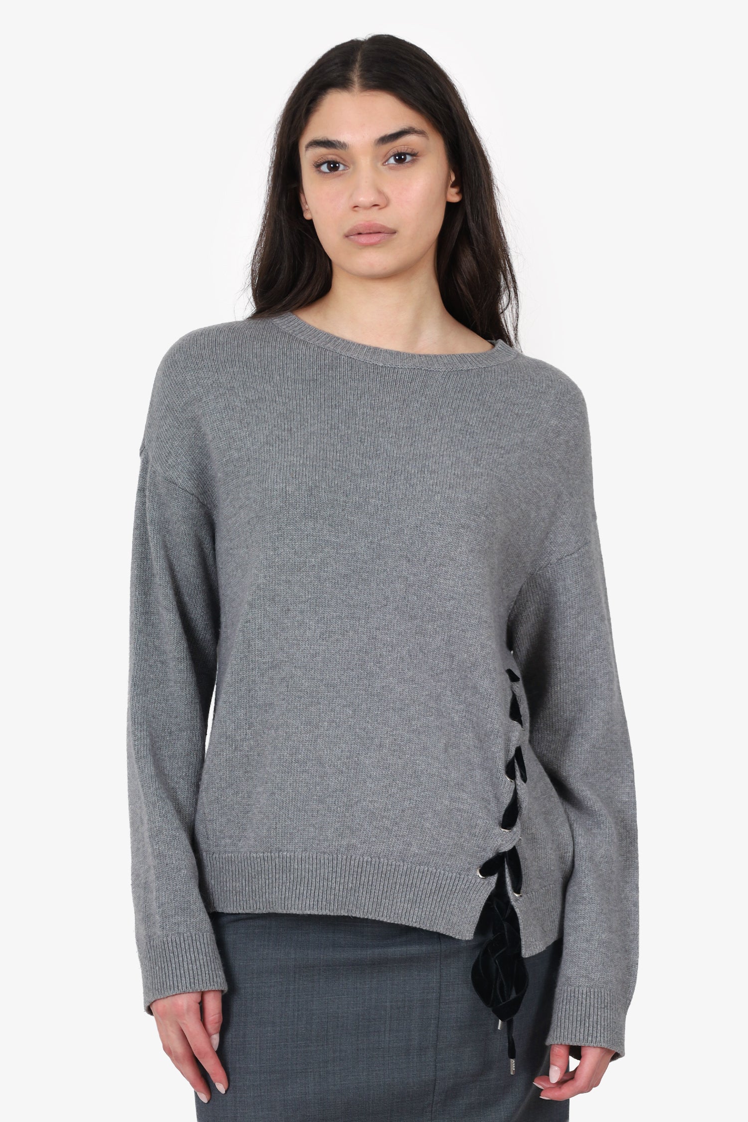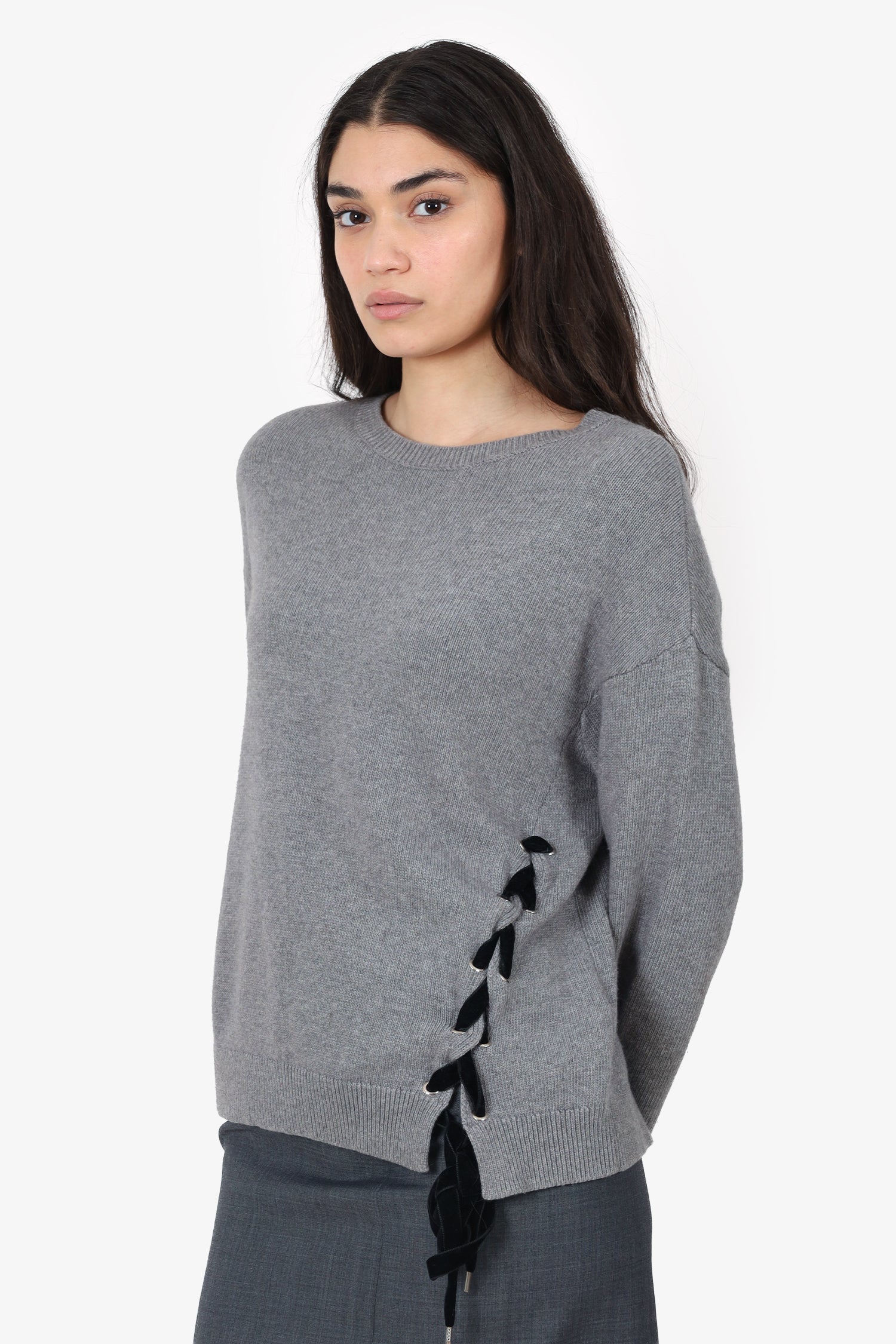 Refresh availabilityRed Valentino Grey Wool Lace-Up Detail Knit Sweater. Pull-on. Round neckline. Silver-tone hardware. Tonal stitching.