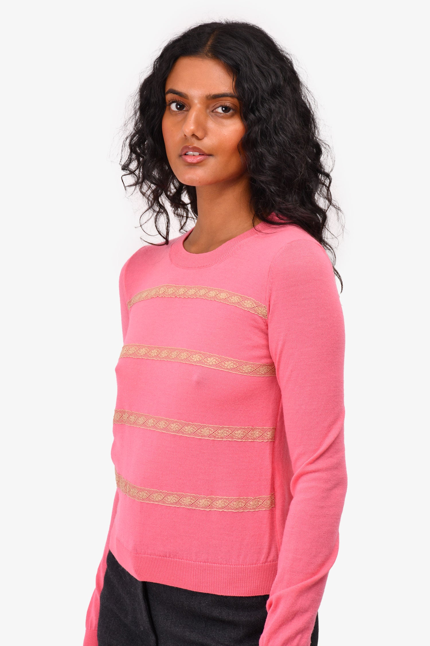 Refresh availabilityRed Valentino Pink Wool Lace Detailed Sweater. Ribbed collar, cuffs, and waistband. Tonal stitching.
