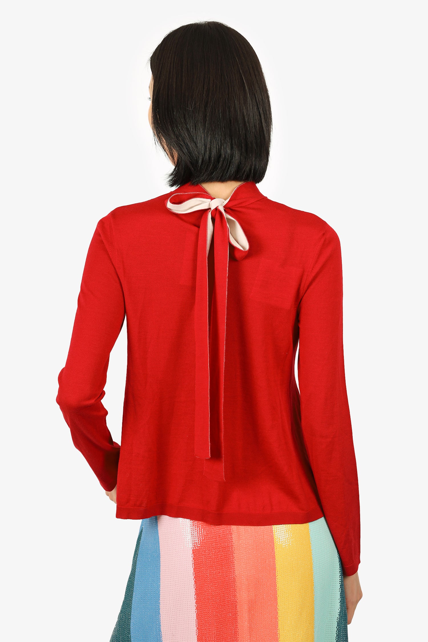 Refresh availabilityRed Valentino Red/White Wool/Silk Mock Neck Long Sleeve Sweater. Pull-on. Rear key hole with tie-up closure. Ribbed trimmings. Tonal stitching.