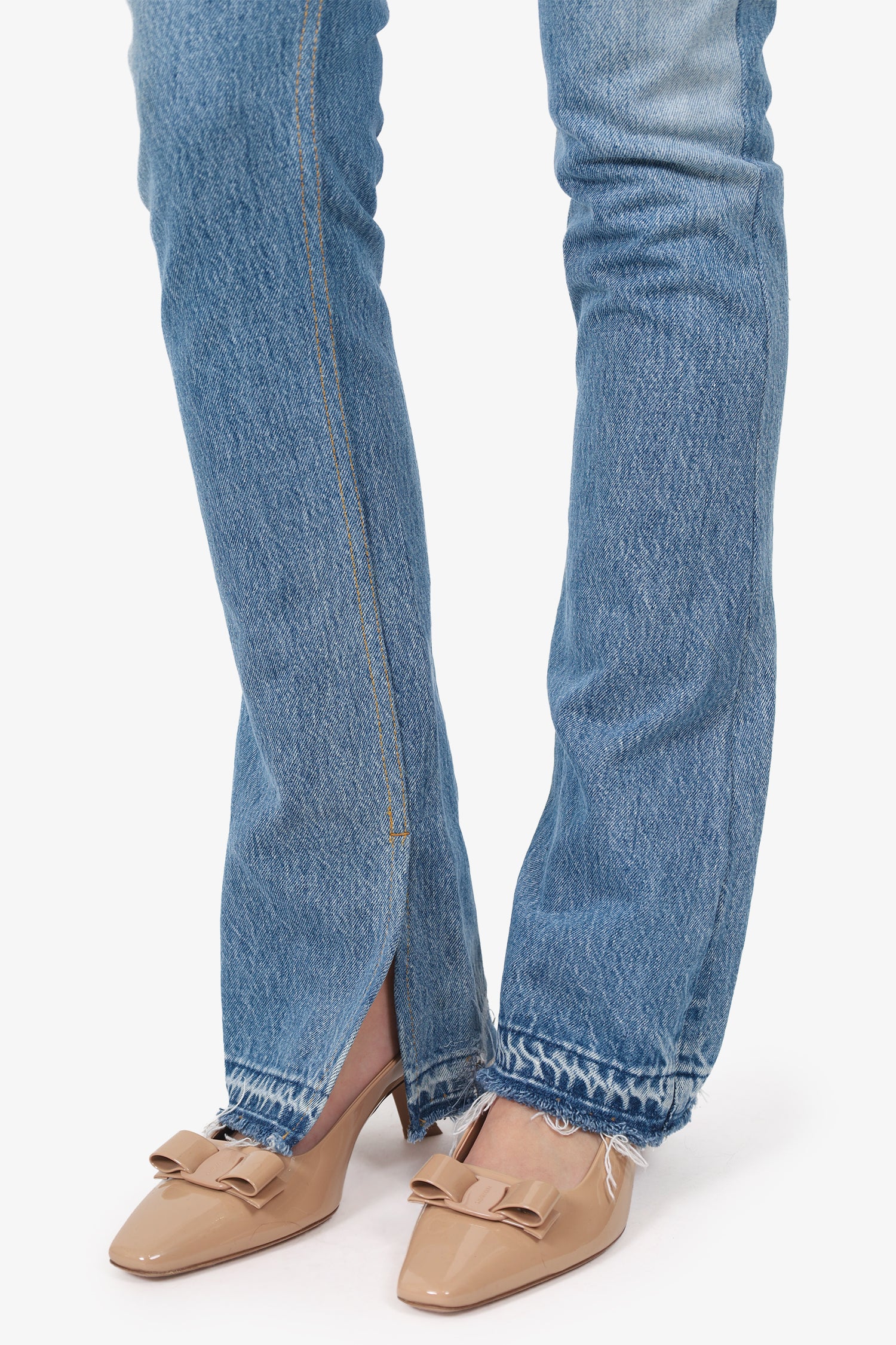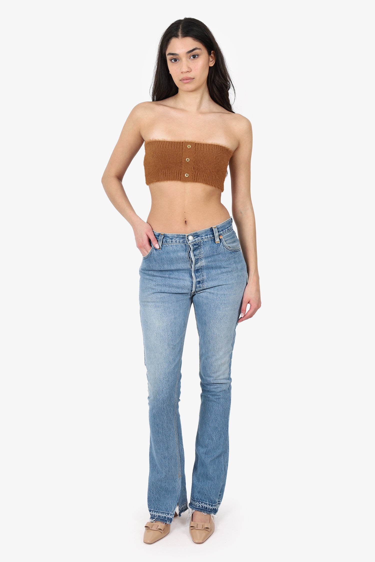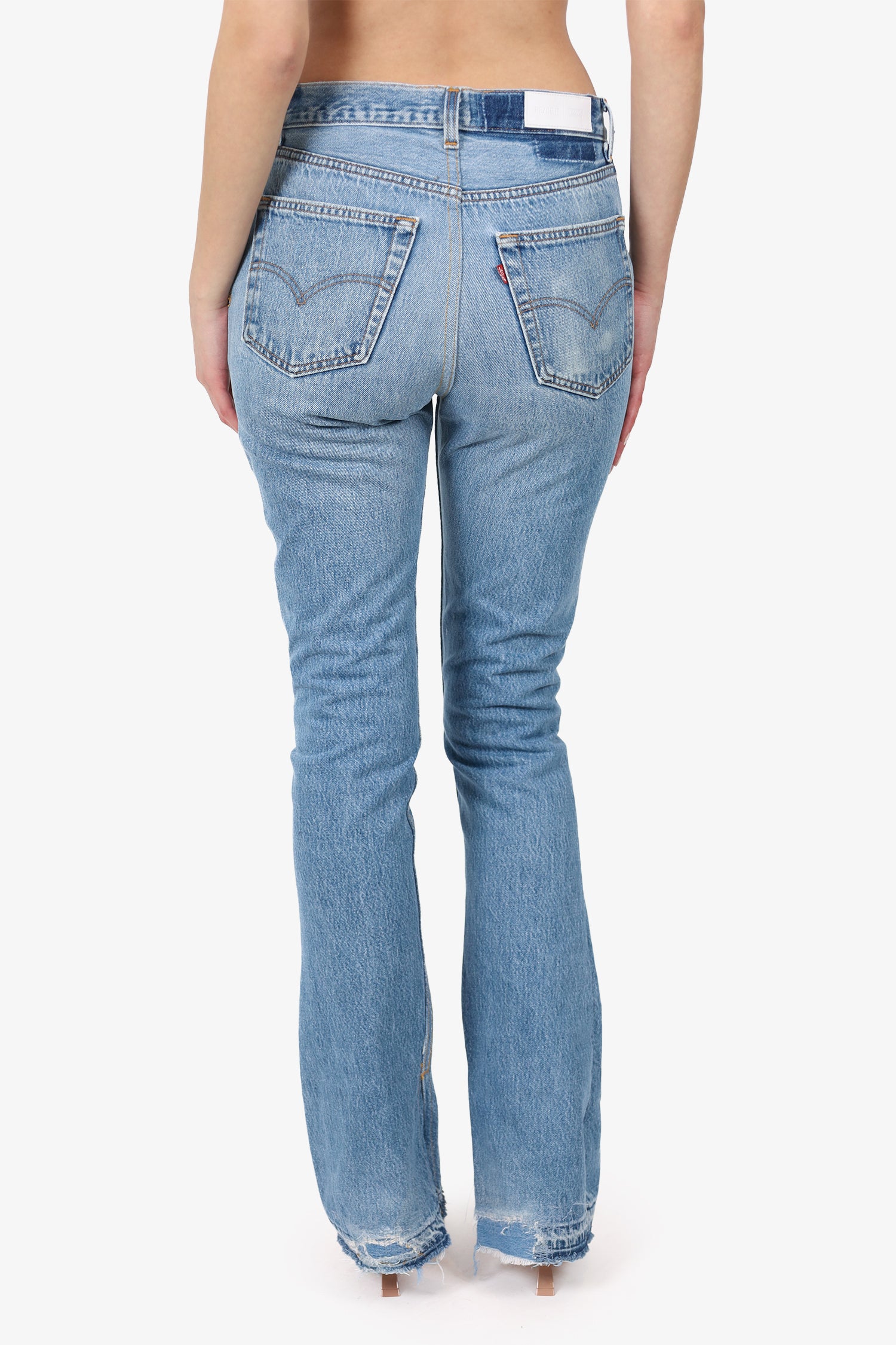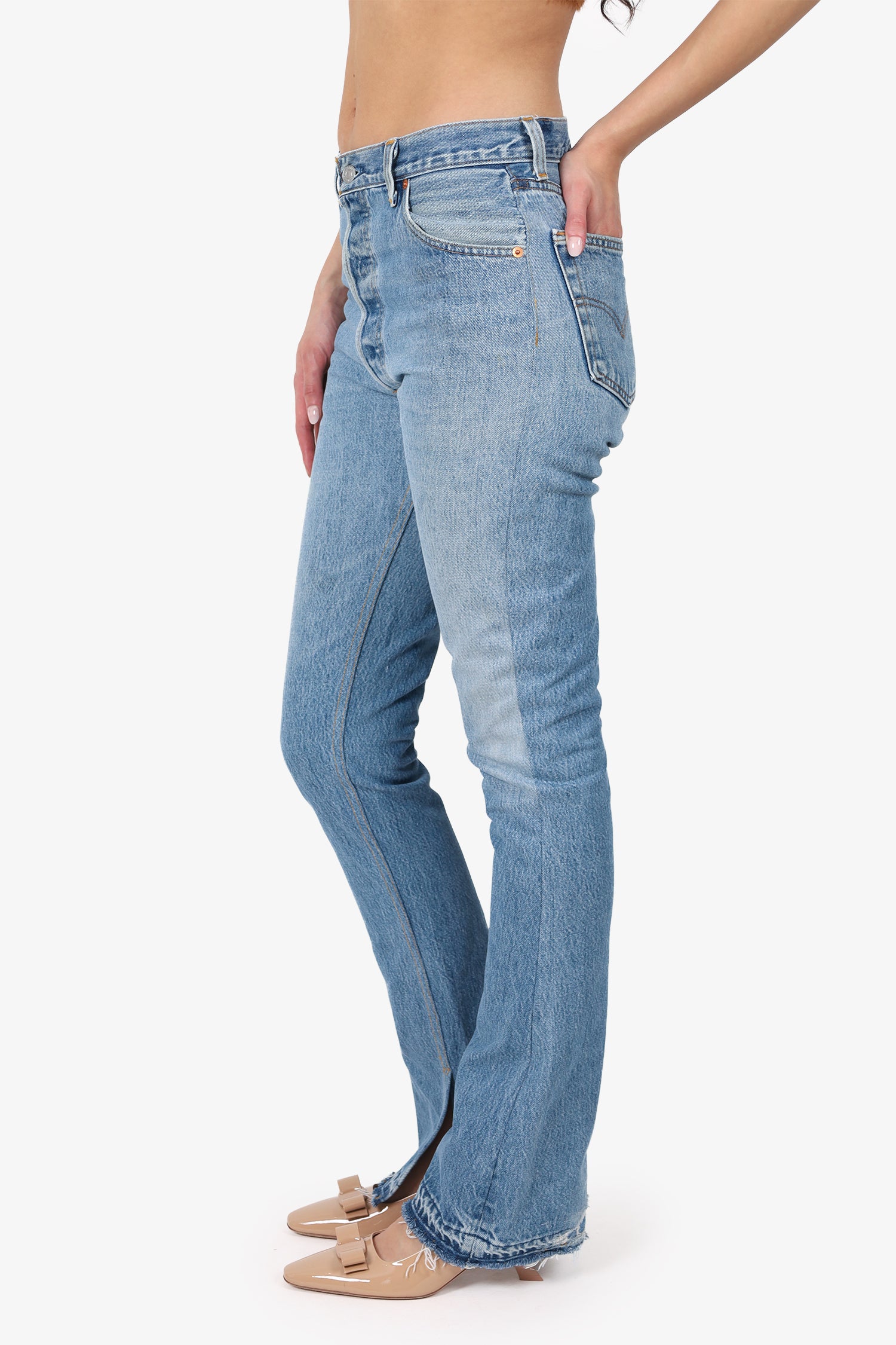 Refresh availabilityRe/Done Blue Denim High Waist Jeans. Slip-on. Front button-up closure. Waistband belt-loops. 5 exterior pockets; 2 front slip, 1 mini compartment, and 2 rear slip. Slits to ankle cuffs. Copper and silver-tone hardware. Contrast stitching.