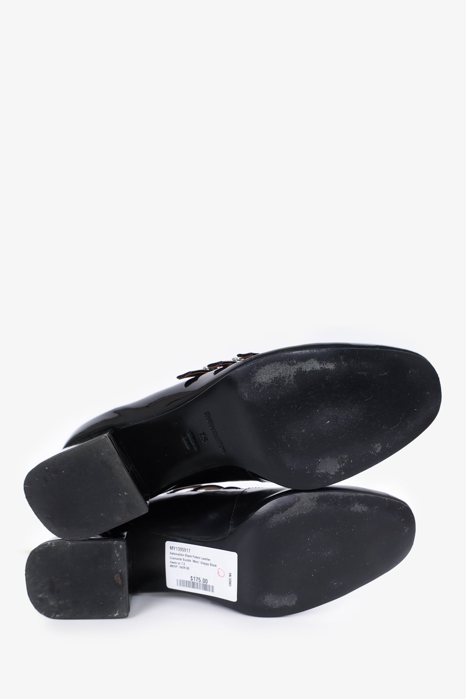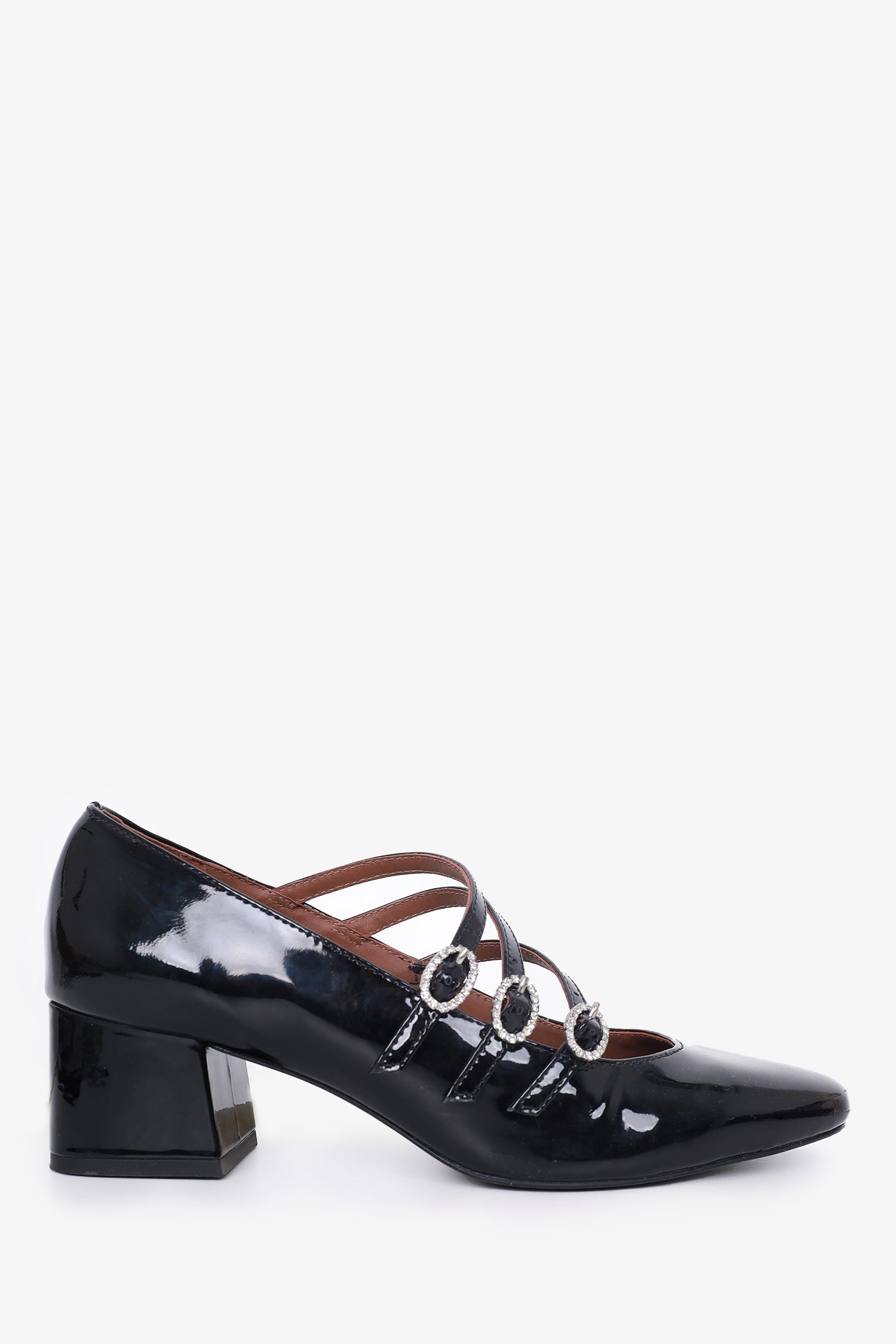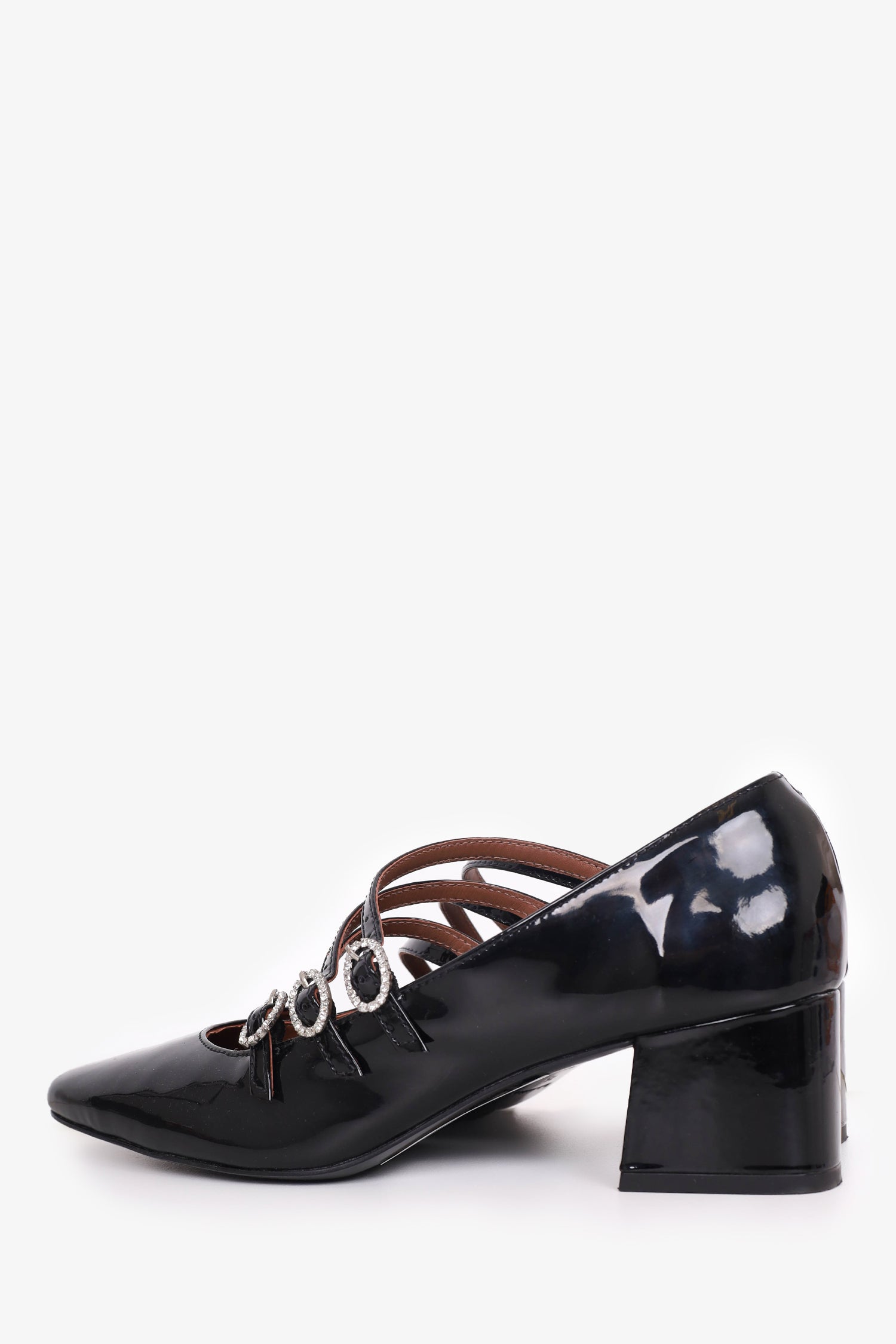Refresh availabilityRefomation Black Patent Leather Diamante Buckle 'Mimi' Strappy Block Heels. Ankle strap closure. Block heel. Round toe. Tonal stitching.